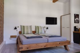 Die kinderfreundlichen Ferienwohnungen liegen im Erdgeschoss und im Dachgeschoss. Die Ferienwohnung im Erdgeschoss kann mit bis zu zwei Personen belegt werden, die Ferienwohnung im Dachgeschoss mit bis zu vier Personen.