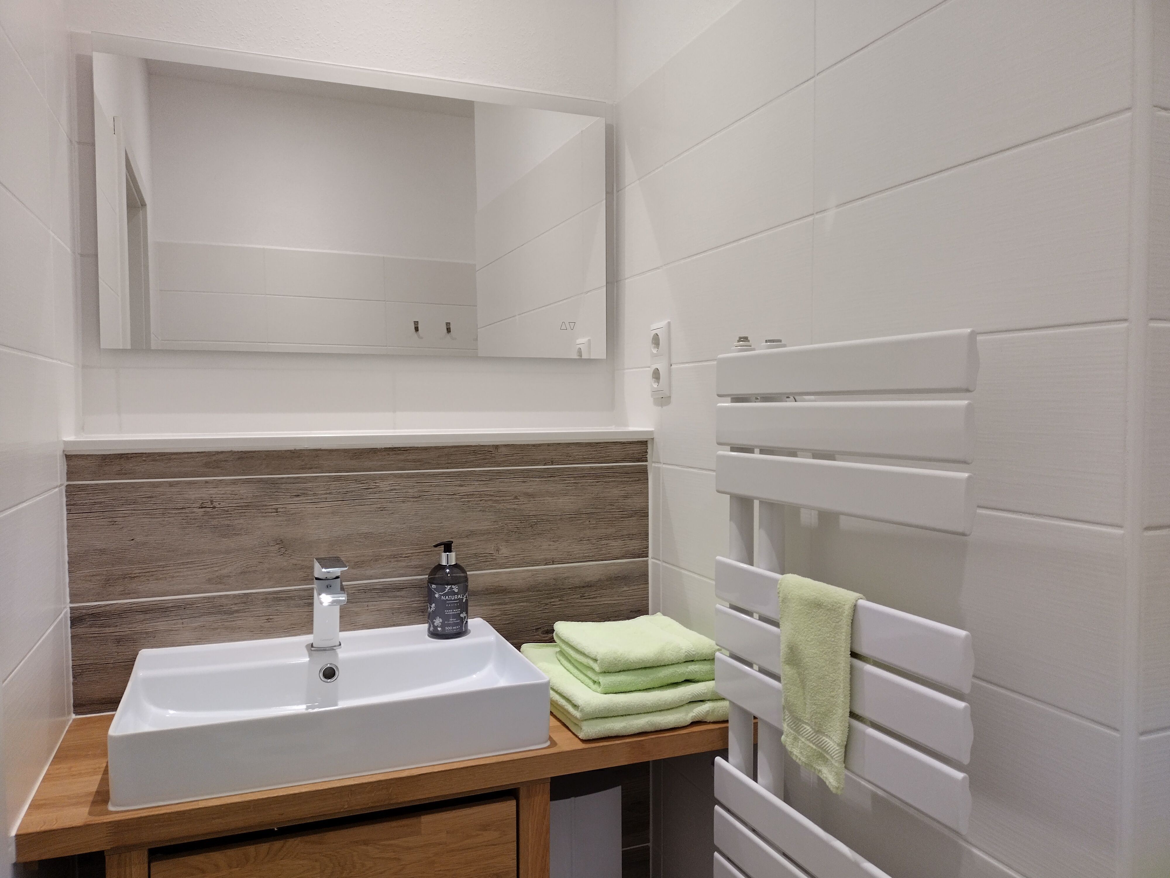 Die Ferienwohnung besteht aus einem großen Wohn-/Schlafbereich mit einer offenen Küche, einem Badezimmer mit WC und Dusche, einem Essbereich mit Tisch und 2 Stühlen und einer Garderobe. Die Küche besteht aus einer vollwertigen Küchenzeile mit Backofen/Cerankochfeld, Kühlschrank mit Gefrierfach und diversen Küchengeräten wie Mikrowelle, Toaster, Kaffeemaschine, Wasserkocher. Das Doppelbett hat die Maße 1,8m x 2m. Die Fenster können abgedunkelt werden. Im Wohnbereich gibt es eine Couch und einen Flachbild-TV (SAT). WLAN, Handtücher und Bettwäsche sind inklusive.