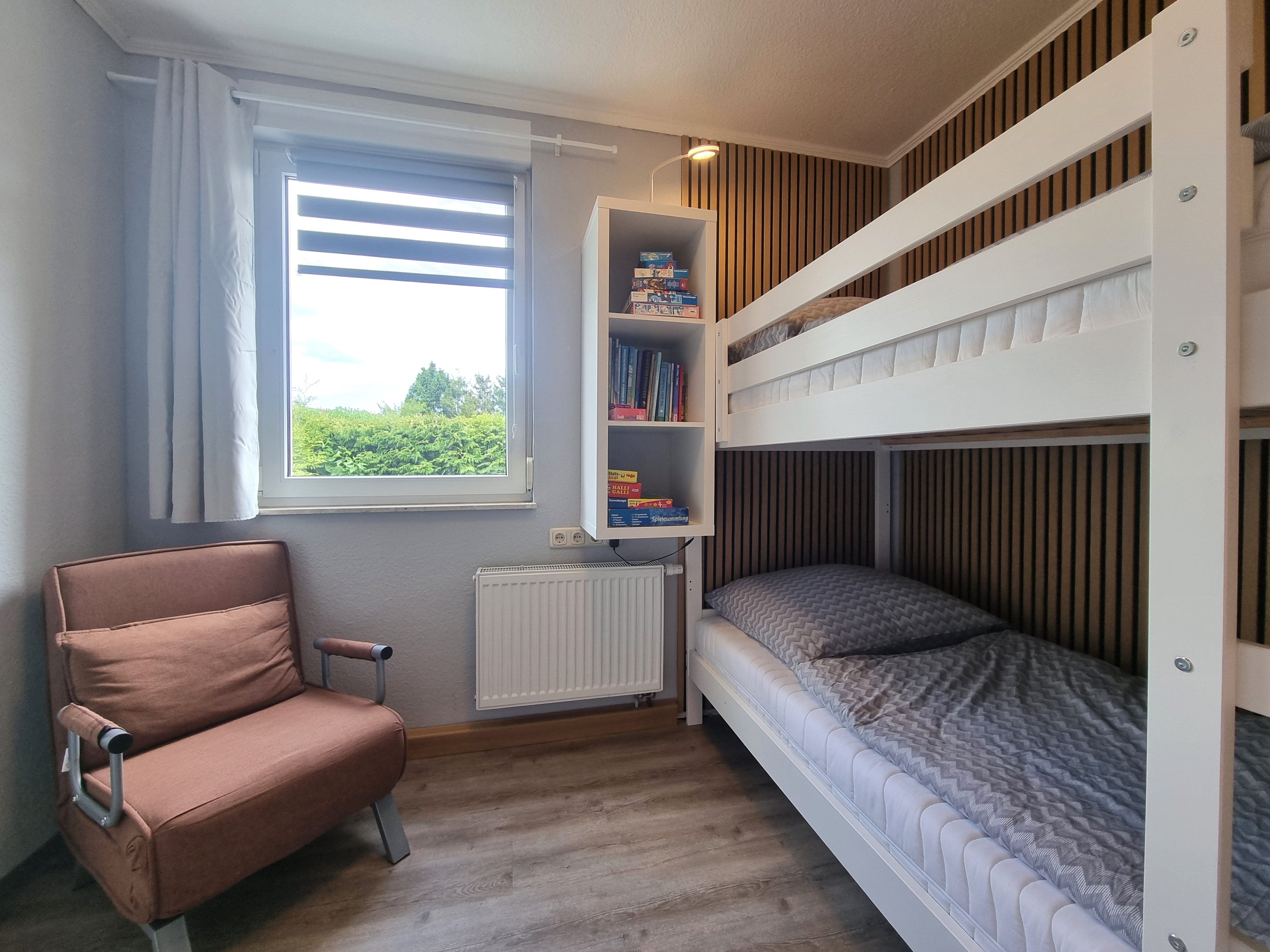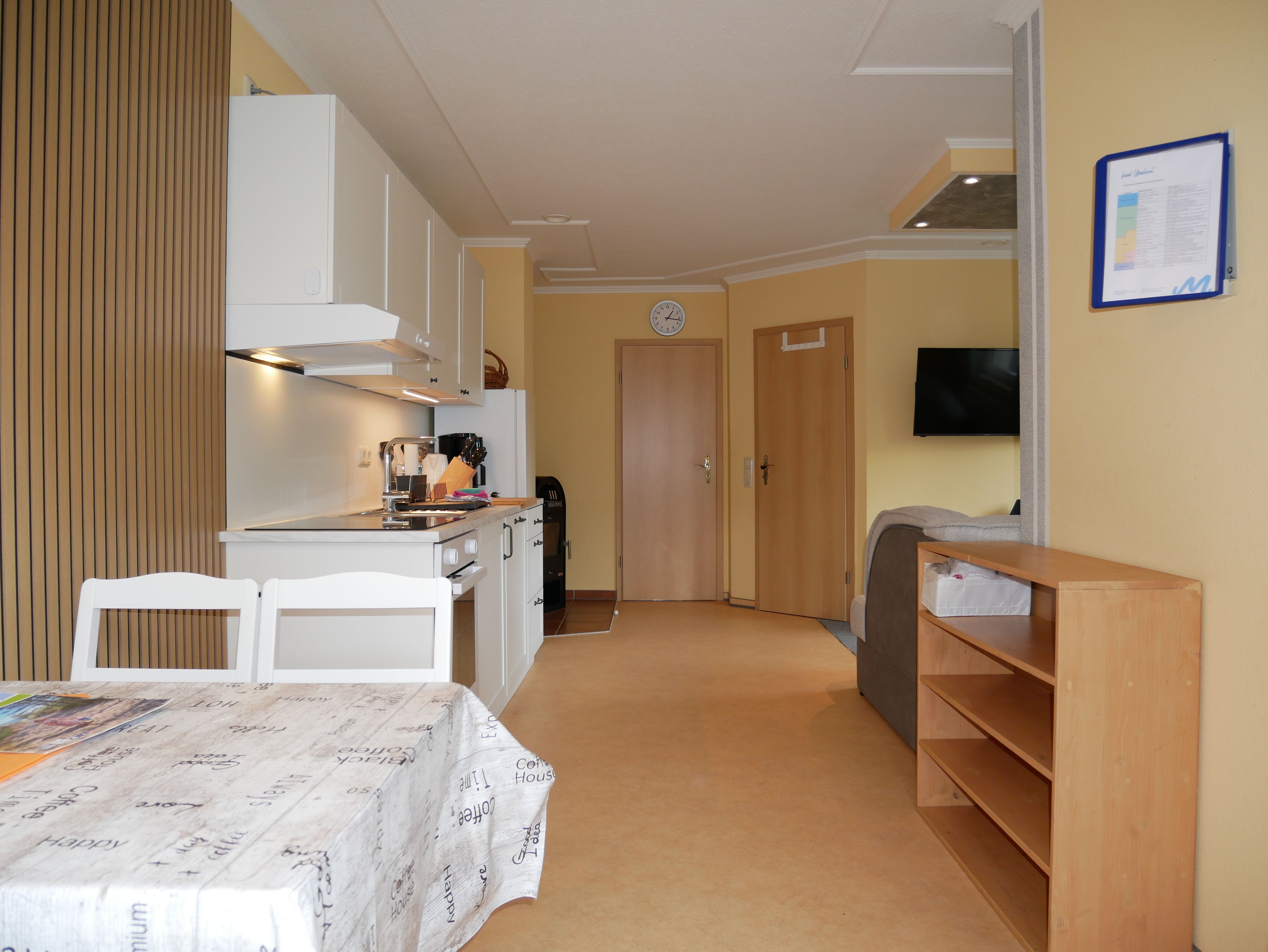 Die Ferienwohnung verfügt über 2 Schlafräume (1x Doppelbett, 1x 1 Etagenbett und zus. TV), einer voll ausgestatteten Küche mit Backofen, Kühlschrank mit Gefrierfach, Wasserkocher, Toaster und Kaffeemaschine. Der Wohn- und Essbereich verfügt über einen Flat-TV und einen Kamin für gemütliche Stunden. Das Badezimmer ist mit Dusche/WC, Waschmaschine und Fön ausgestattet. Die Fußböden sind teilweise mit Teppich im Wohn- und Schlafbereich, mit Linoleum im Küchen- und Essbereich und mit Fliesen im Bad ausgelegt. Die Wohnung hat eine separate Sitzmöglichkeit im Außenbereich. Ein PKW-Stellplatz und WLAN stehen Ihnen kostenfrei zur Verfügung.