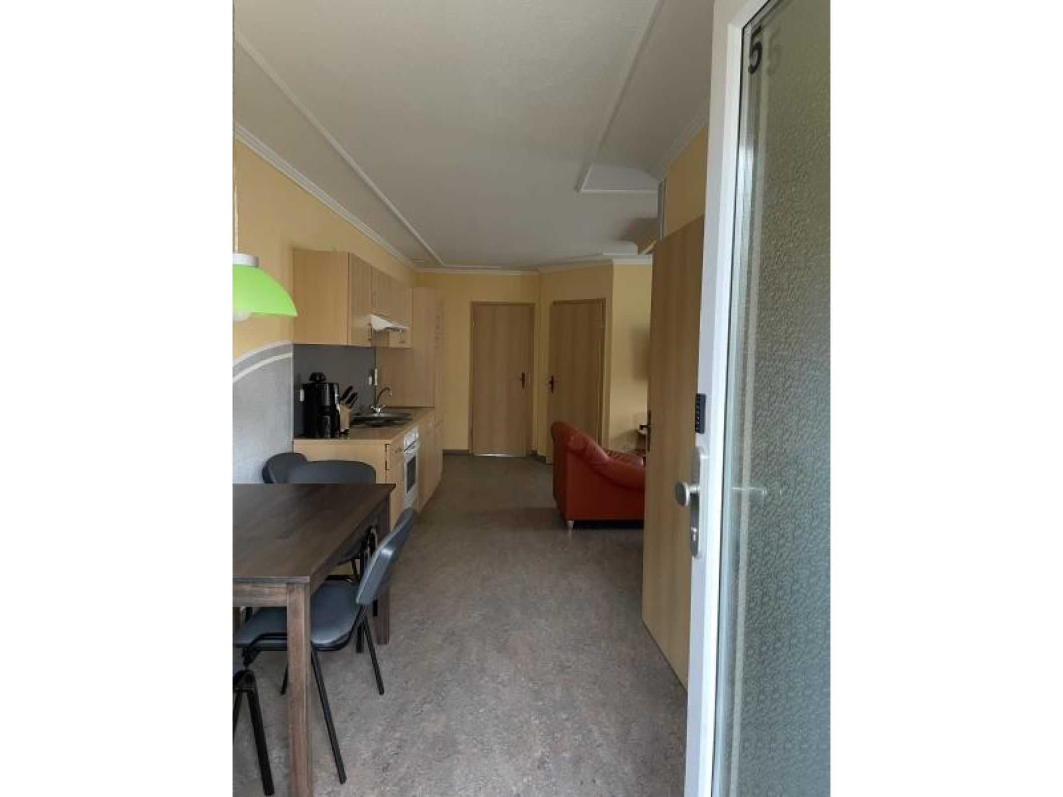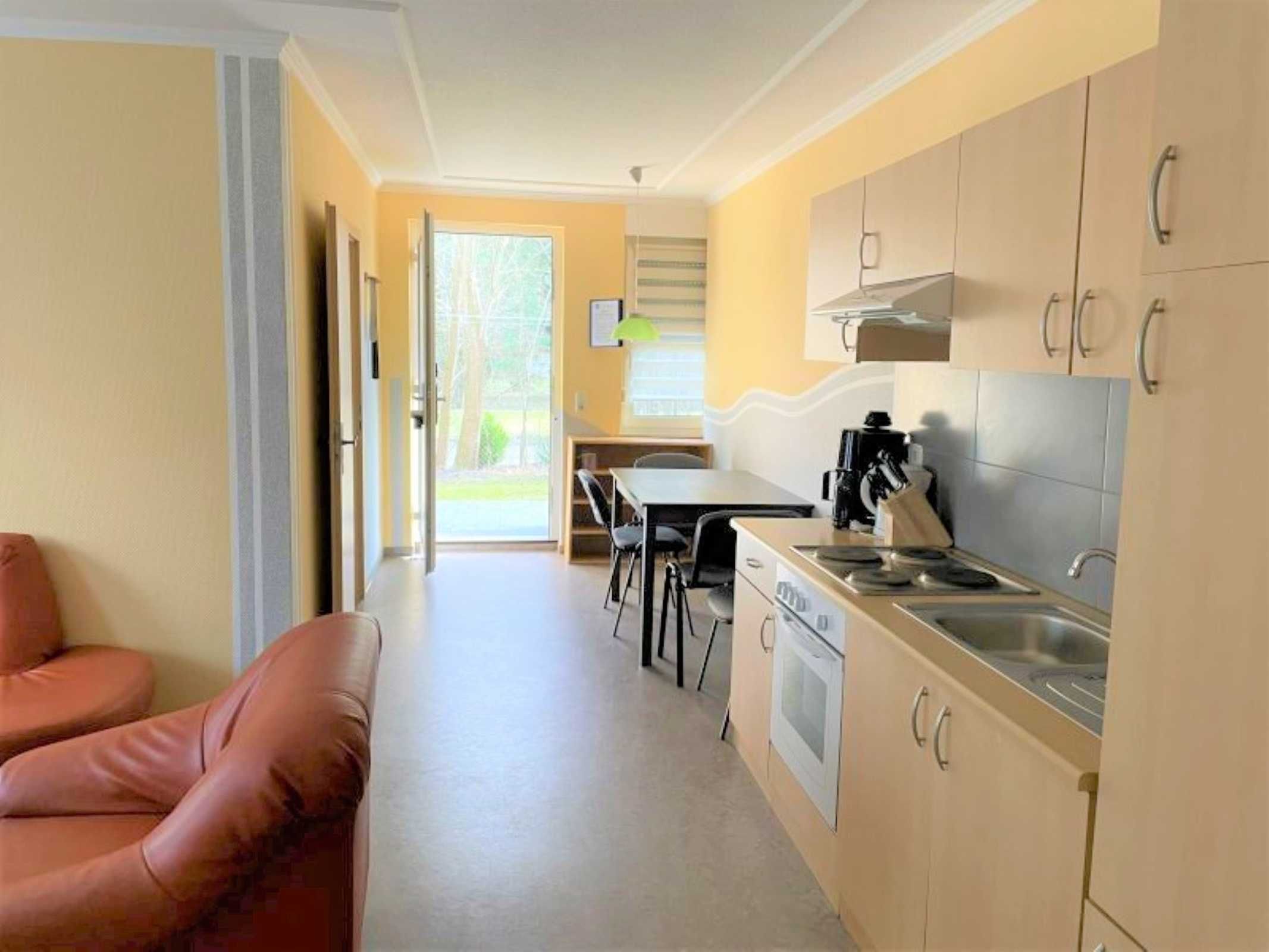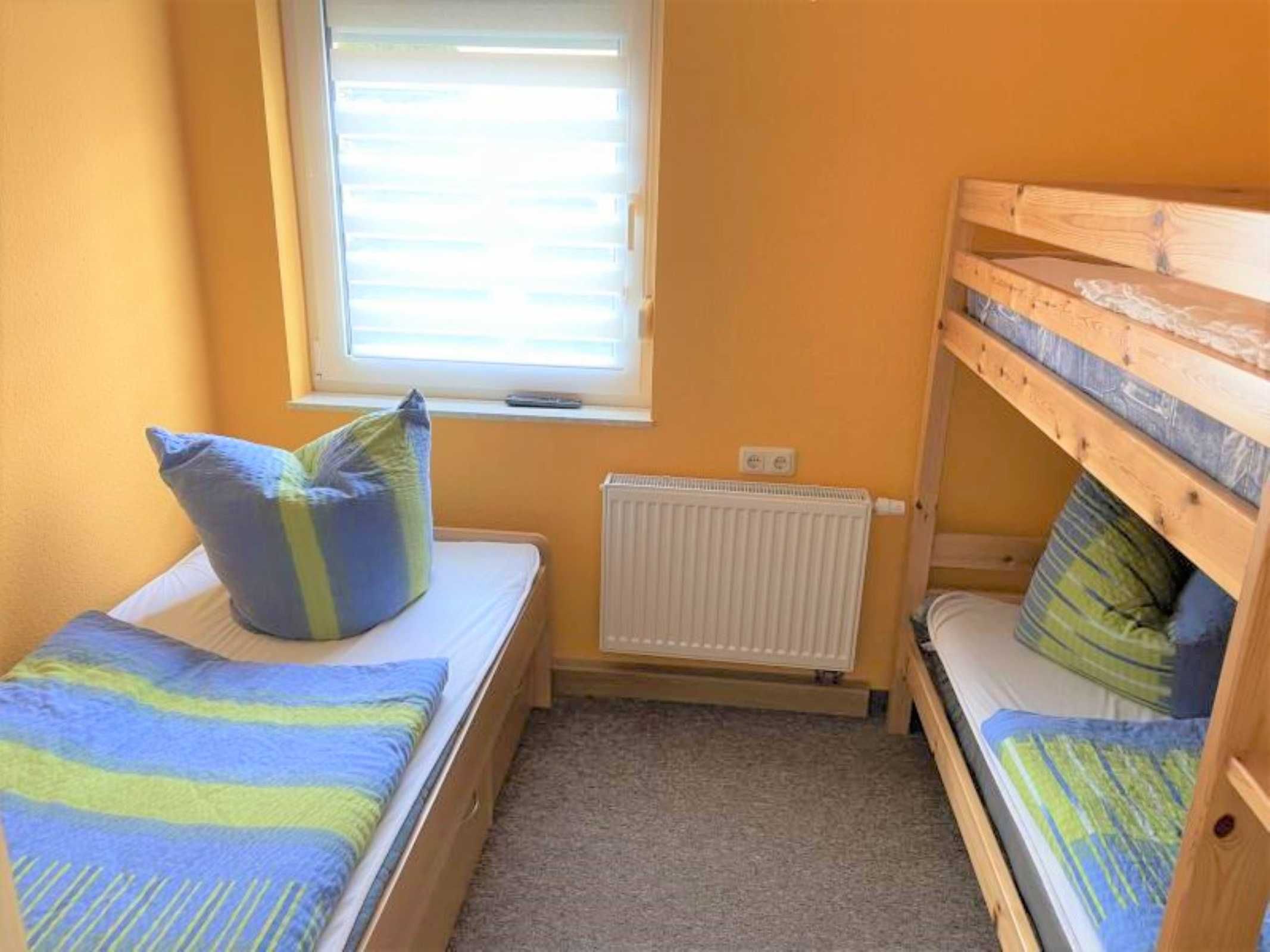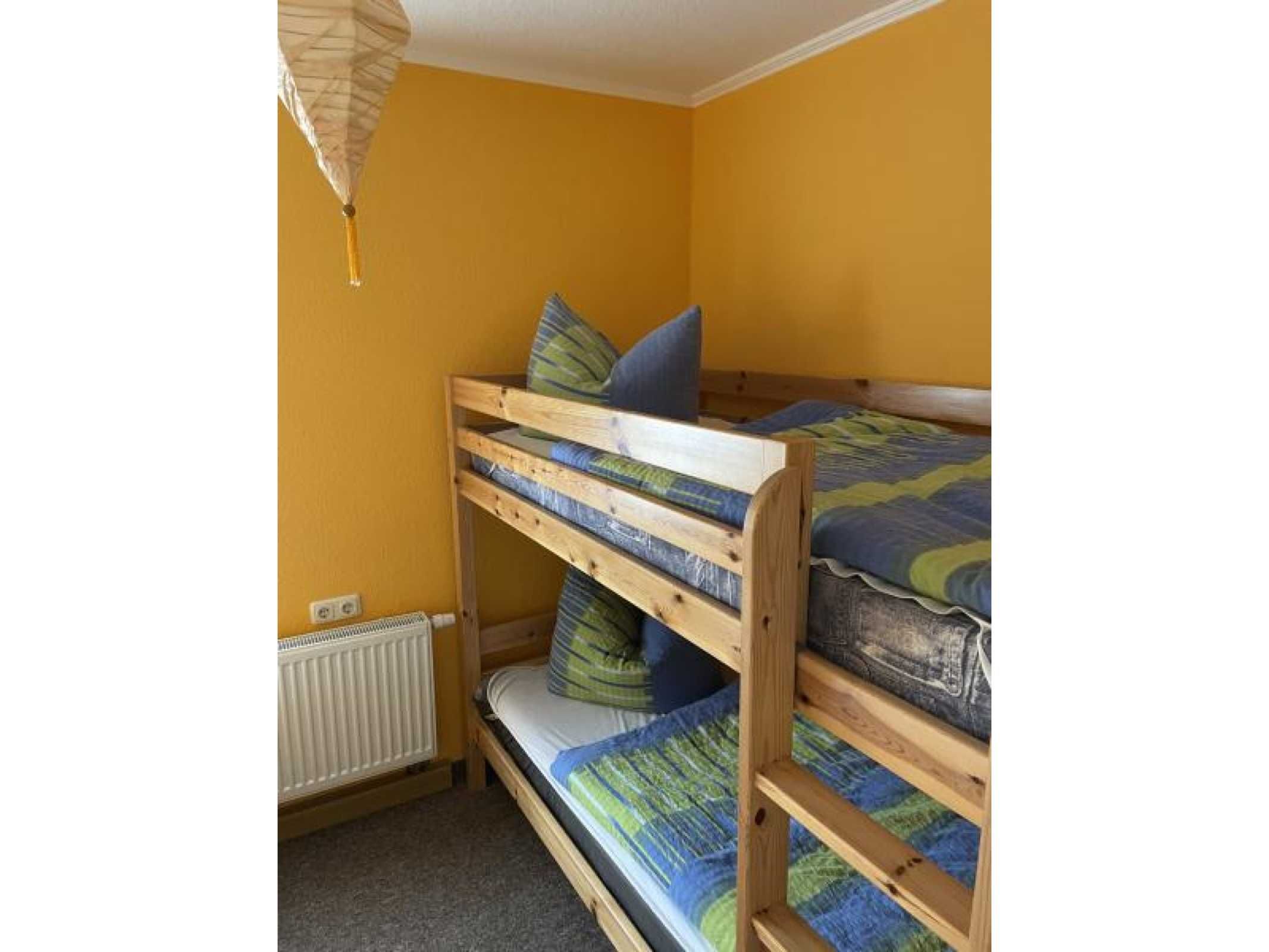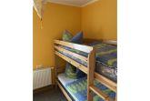 Die Ferienwohnung verfügt über 2 Schlafräume (1x Doppelbett, 1x Etagenbett & 1 Einzelbett und zus. TV), einer voll ausgestatteten Küche mit Backofen, Kühlschrank mit Gefrierfach, Wasserkocher, Toaster und Kaffeemaschine. Der Wohn- und Essbereich verfügt über einen Flat-TV für gemütliche Stunden. Das Badezimmer ist mit Dusche/WC, Waschmaschine und Fön ausgestattet. Die Fußböden sind teilweise mit Teppich im Wohn- und Schlafbereich, mit Linoleum im Küchen- und Essbereich und mit Fliesen im Bad ausgelegt. Die Wohnung hat eine separate Sitzmöglichkeit im Außenbereich. Ein PKW-Stellplatz und WLAN stehen Ihnen kostenfrei zur Verfügung.