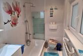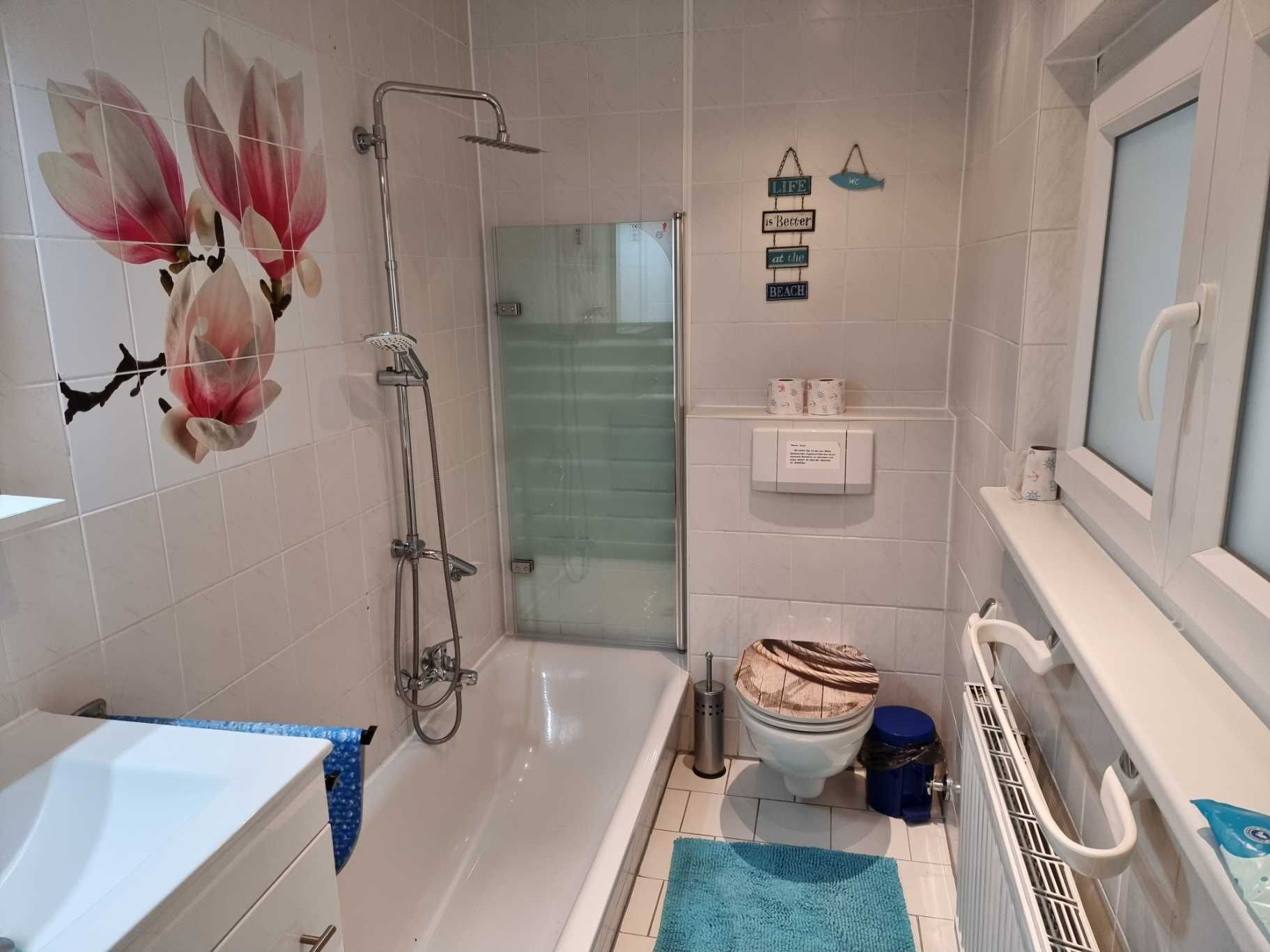 • Das Badezimmer besitzt eine Badewanne und eine Toilette.