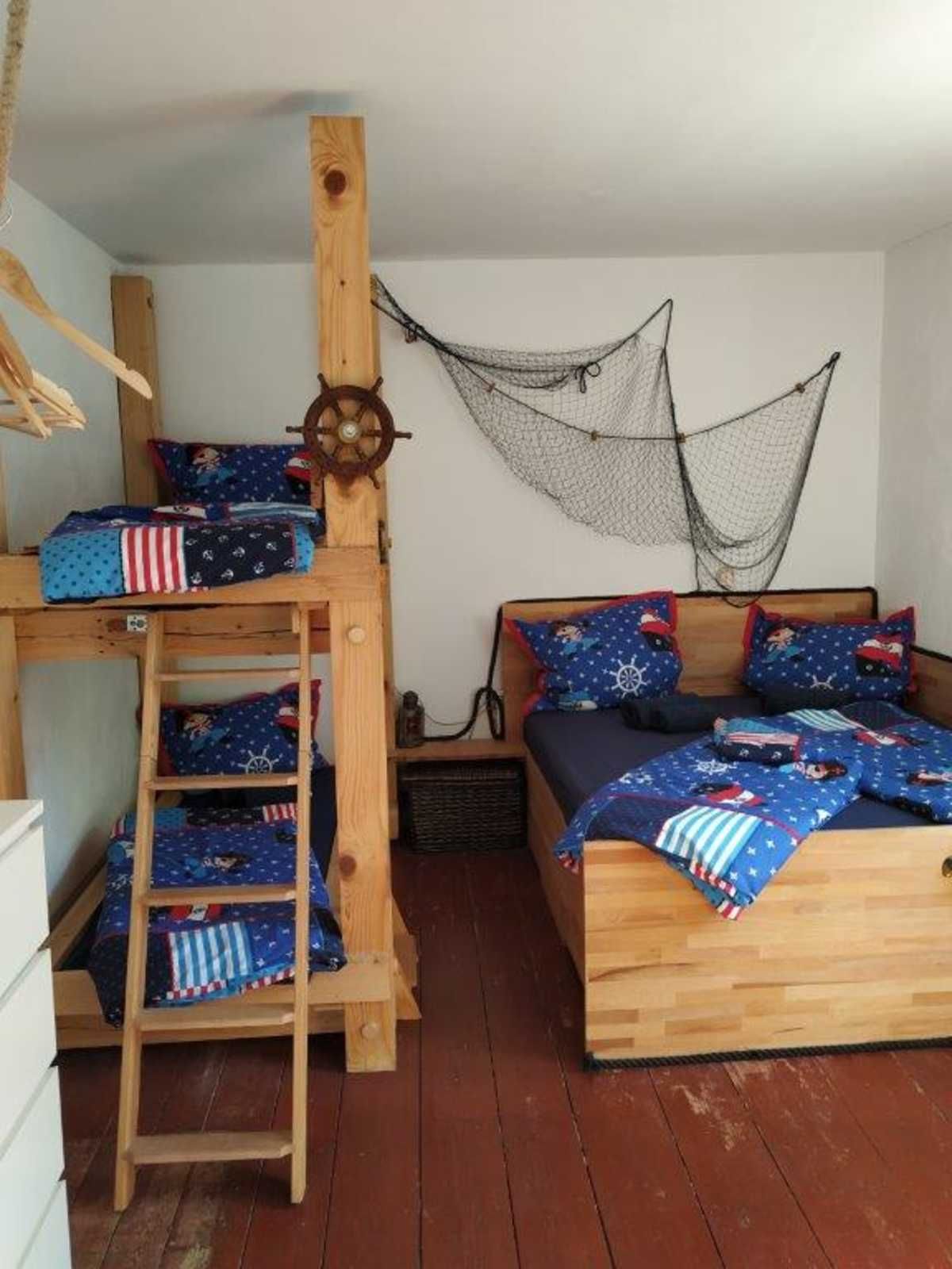 • 1 Schlafzimmer mit einem großen Doppelbett und einem Hochbett für zwei Kinder, ein Kinderbett