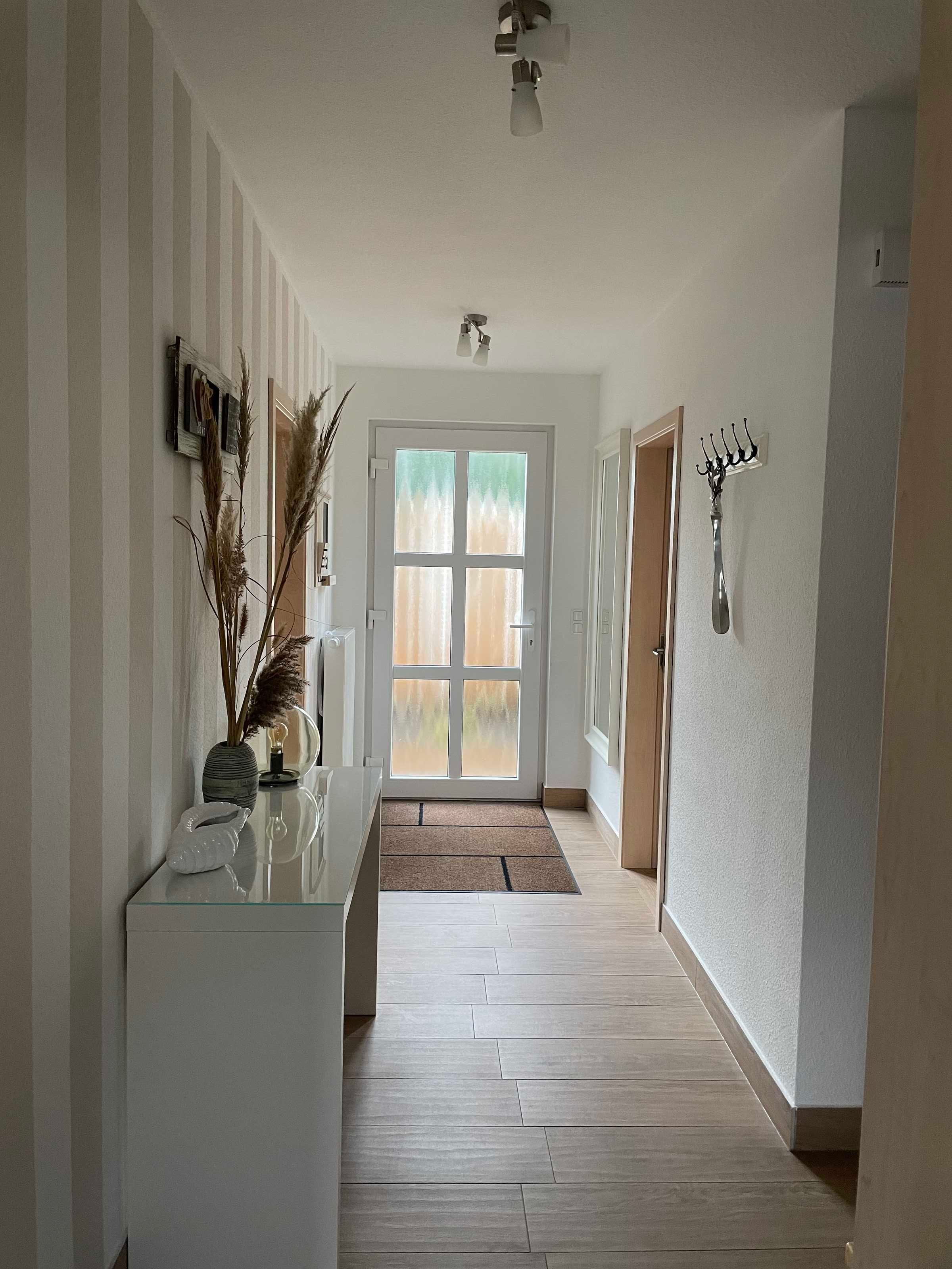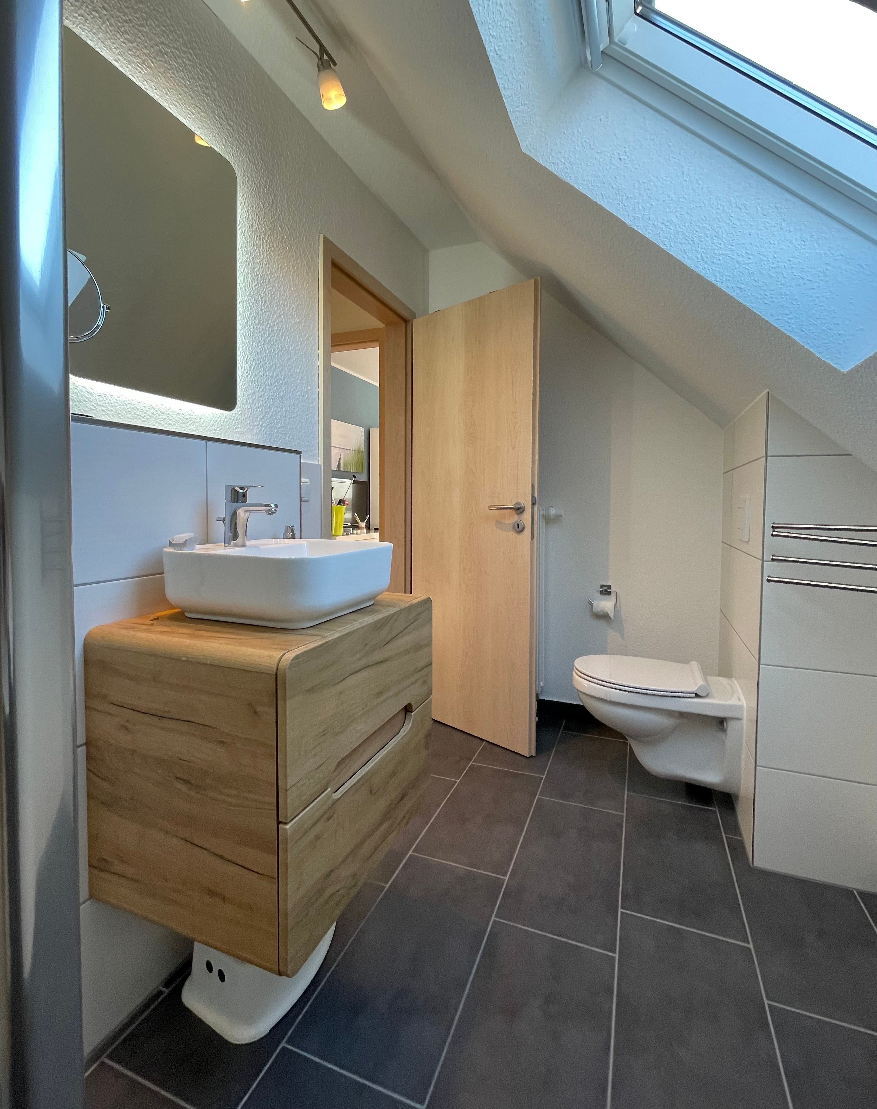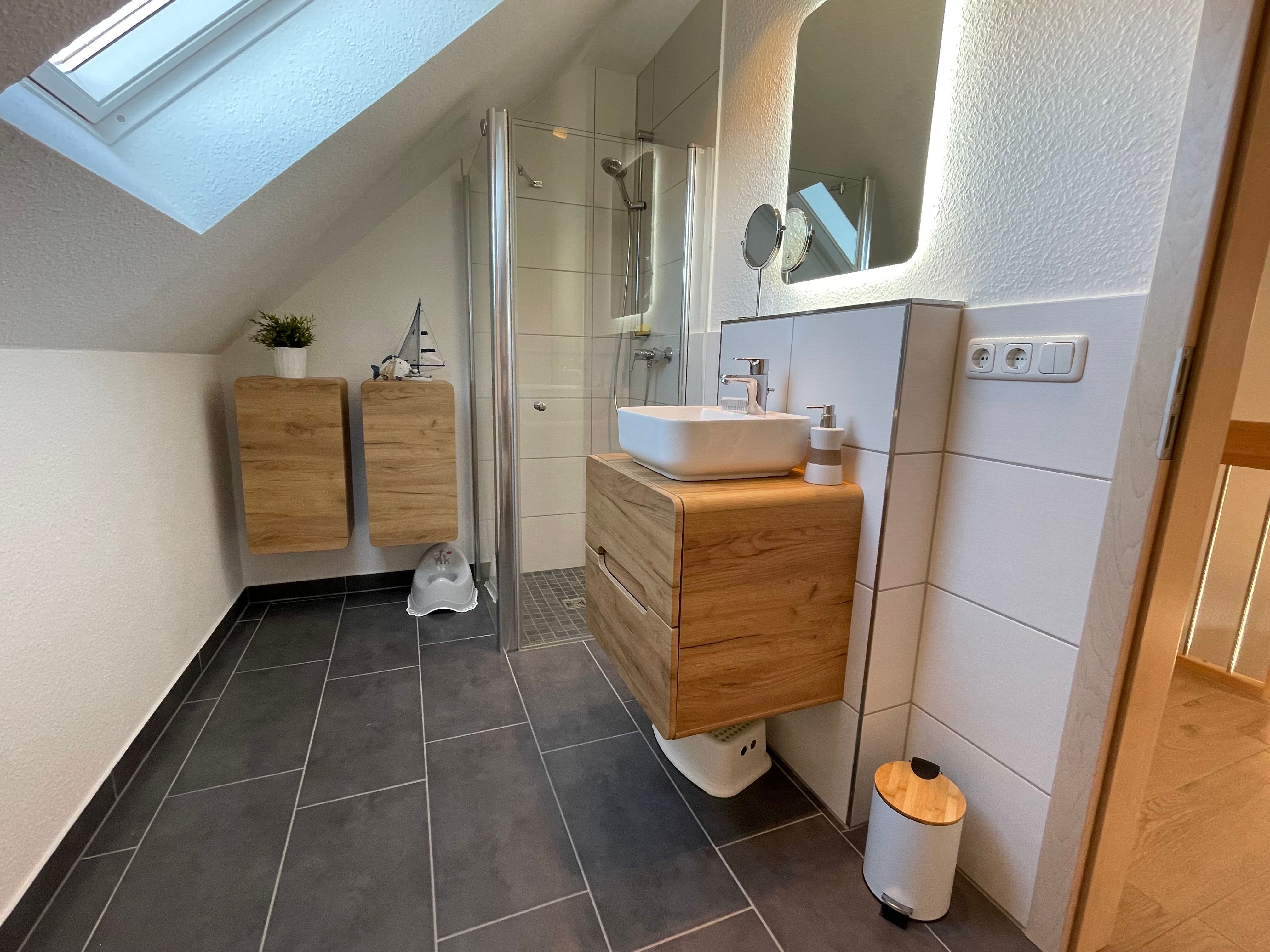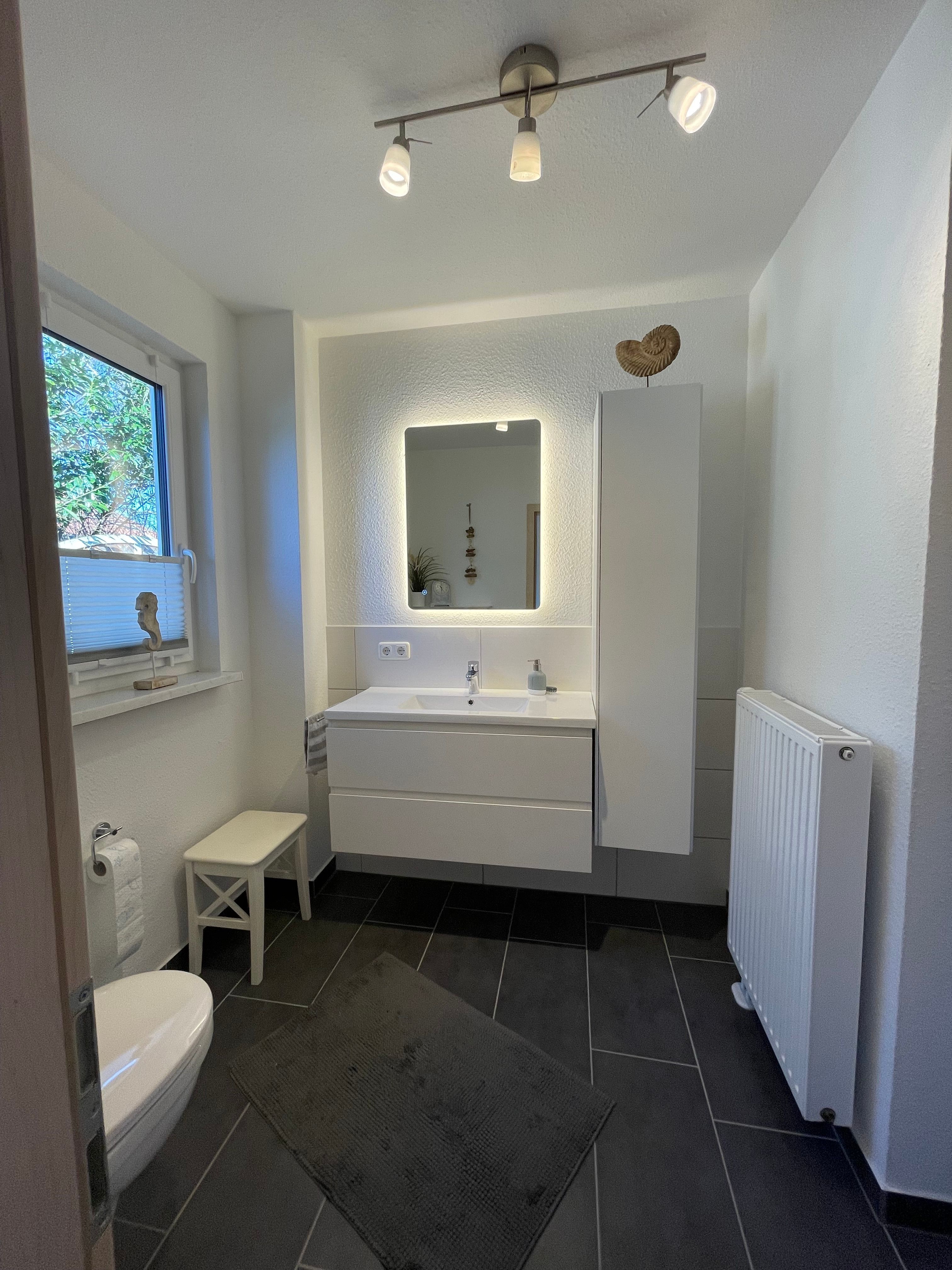 Erdgeschoss: modernes Duschbad/ WC und Hauswirtschaftsraum mit Miele-Waschmaschine.