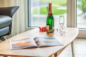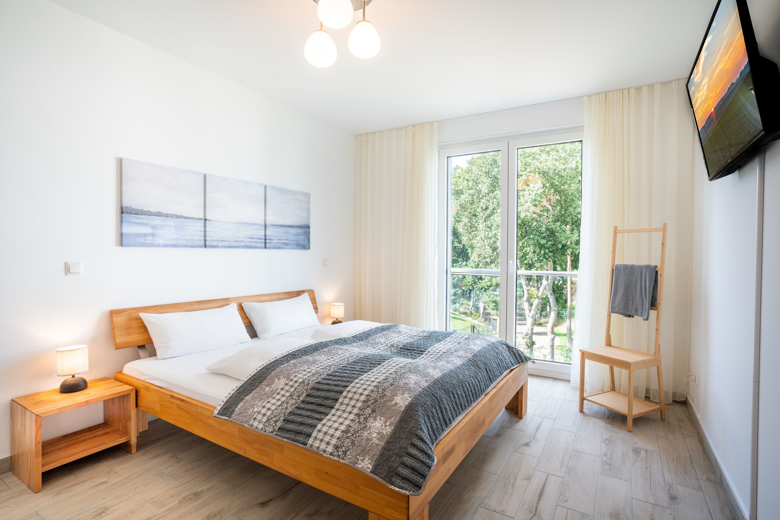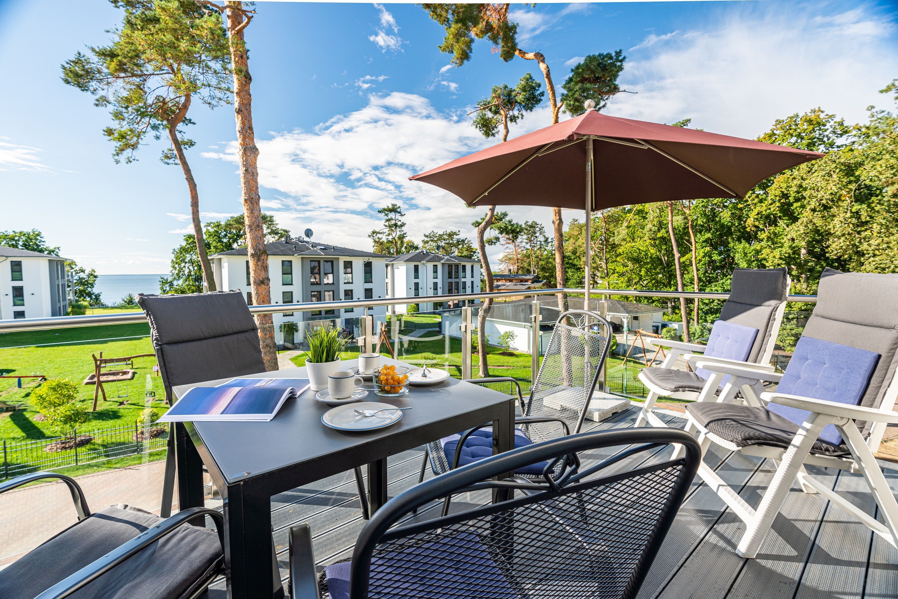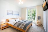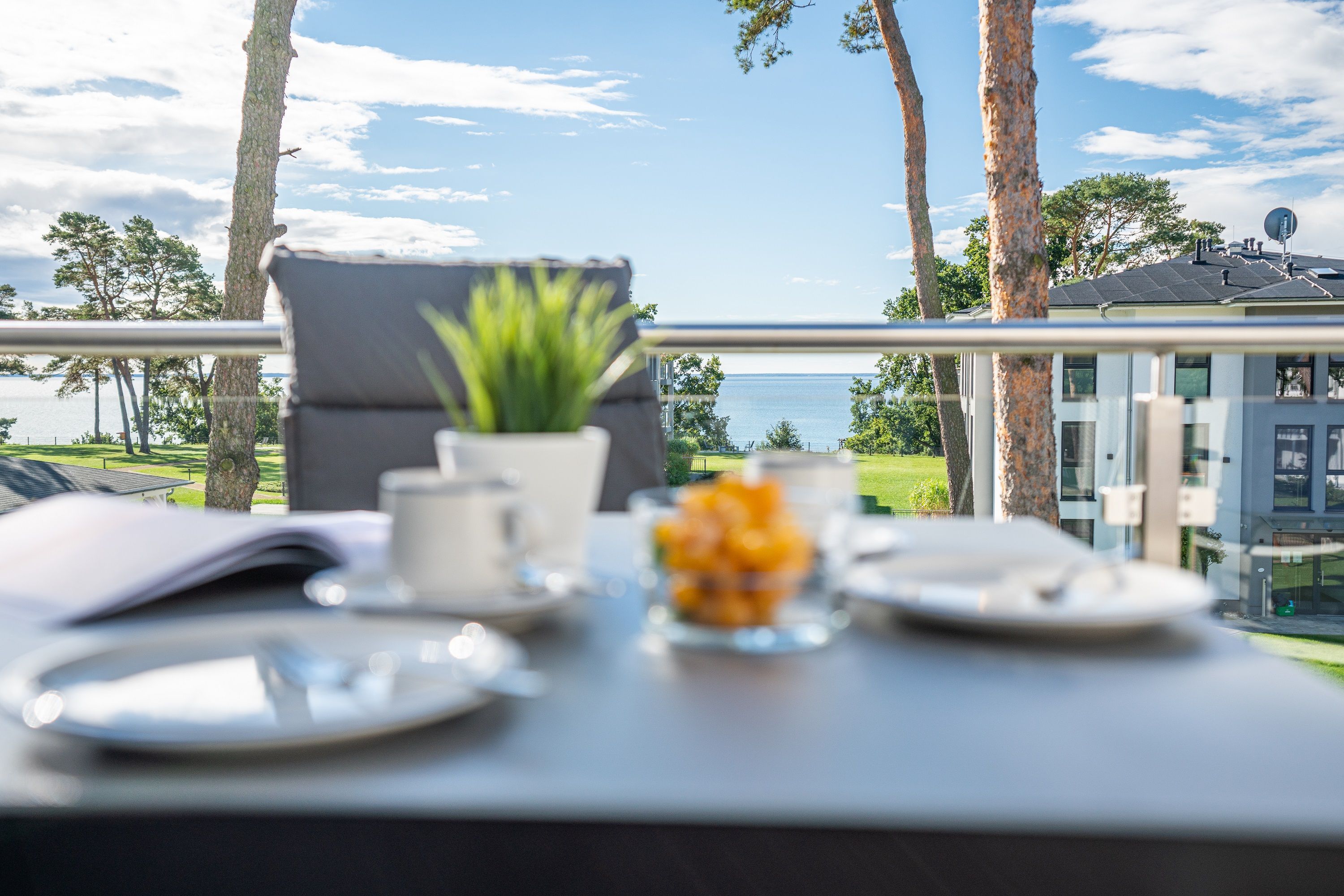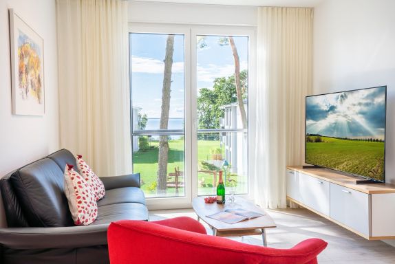 Der offen gestaltete Wohnbereich ist mit einem komfortablen Sofa und Sessel sowie Smart-TV ausgestattet. Sie haben vom Wohnzimmer aus Zugang zum Südwest-Balkon. Der möblierte Balkon mit traumhaften Ausblicken auf das Stettiner Haff bietet auch aus der zweiten Reihe einen wunderschönen Ort, um Ihre Mahlzeiten zu genießen und die Aussicht zu bewundern.