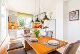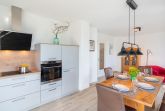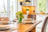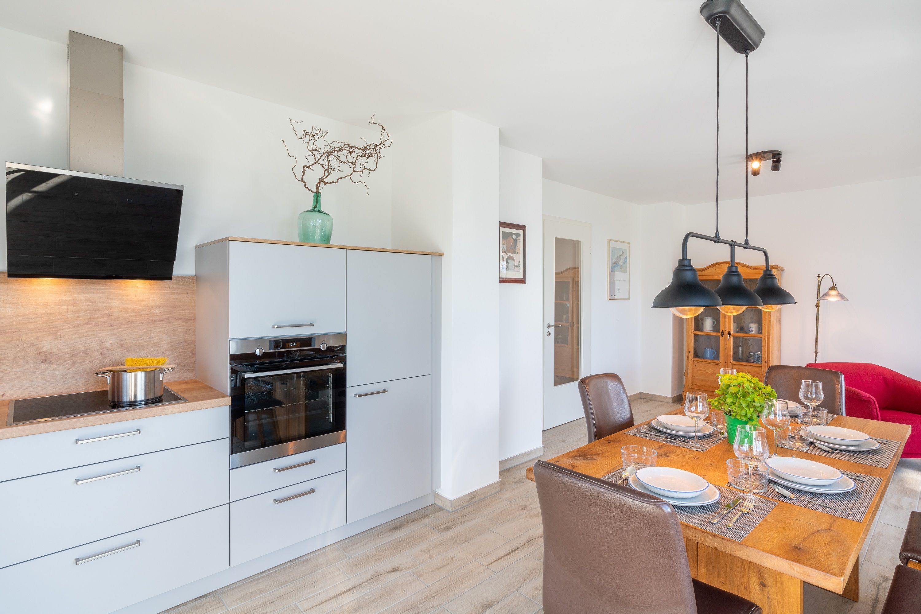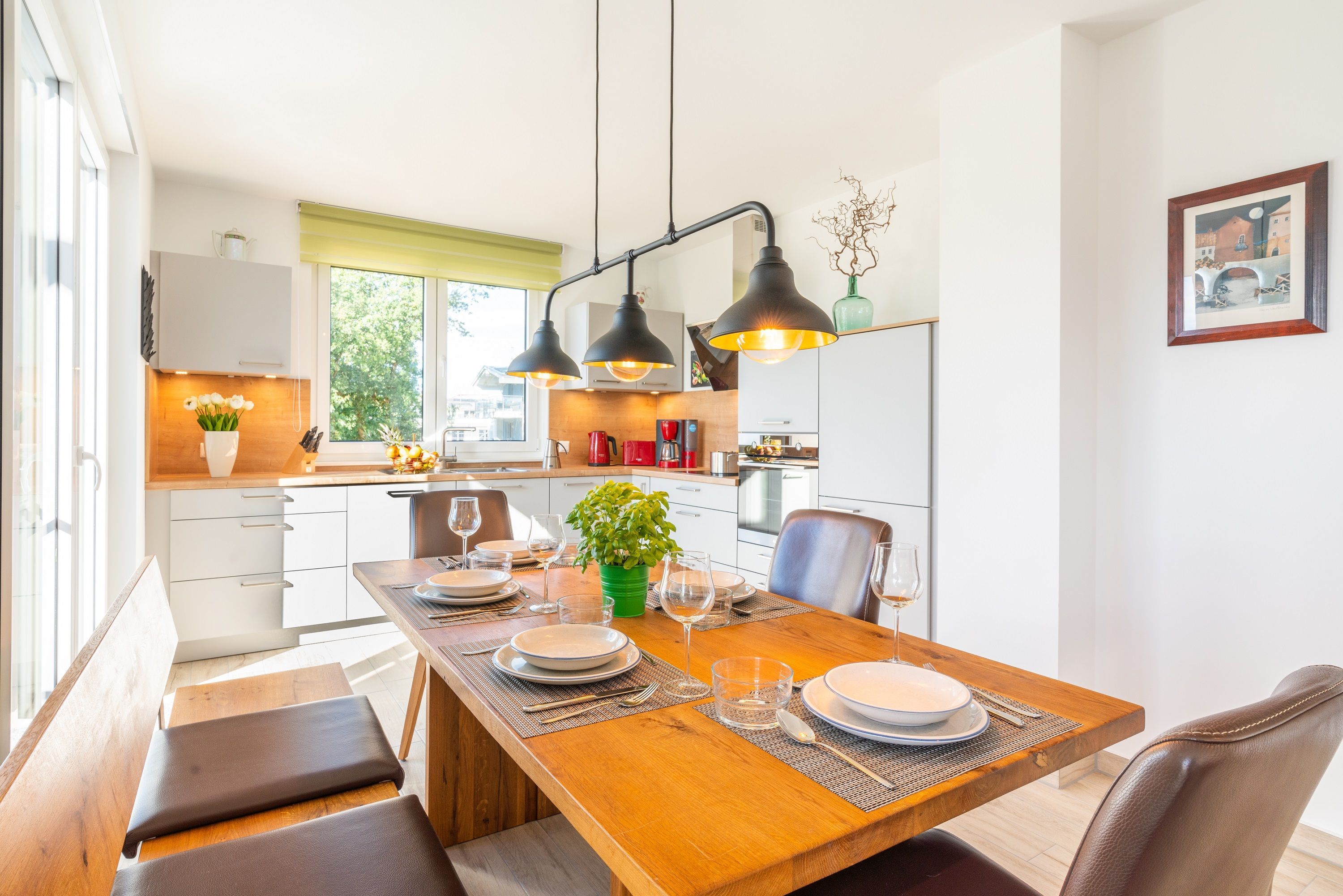 Die Küchenzeile verfügt über hochwertige Geräte wie Herd, Backofen, Kaffeemaschine, Kühl- und Gefrierschrank sowie Spülmaschine. Ausreichend Geschirr, Besteck sowie Töpfe und Pfannen befinden sich in den Schränken. Am großen Esstisch finden Sie vor einem erholsamen Urlaubstag zu einem gemeinsamen Frühstück zusammen.
