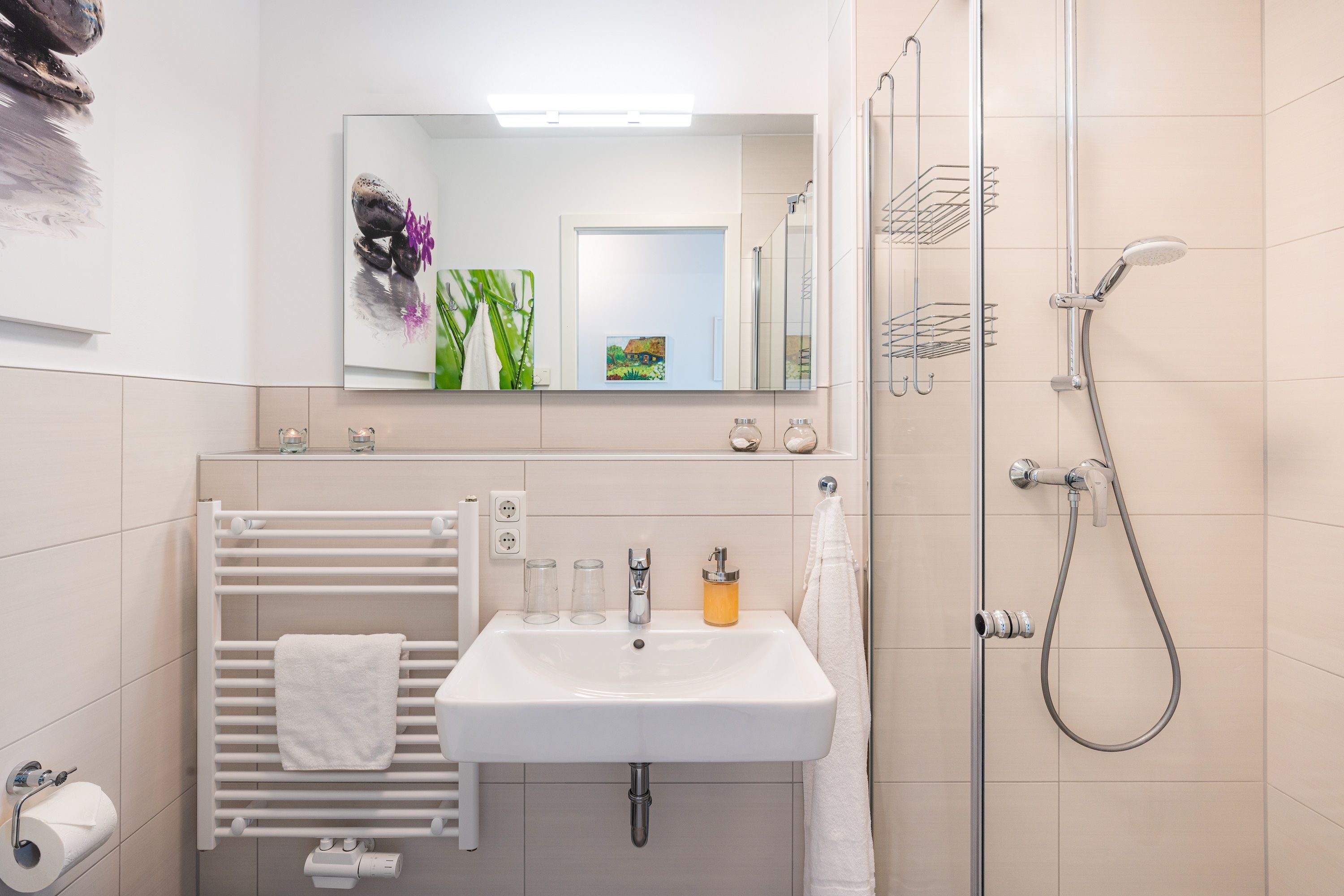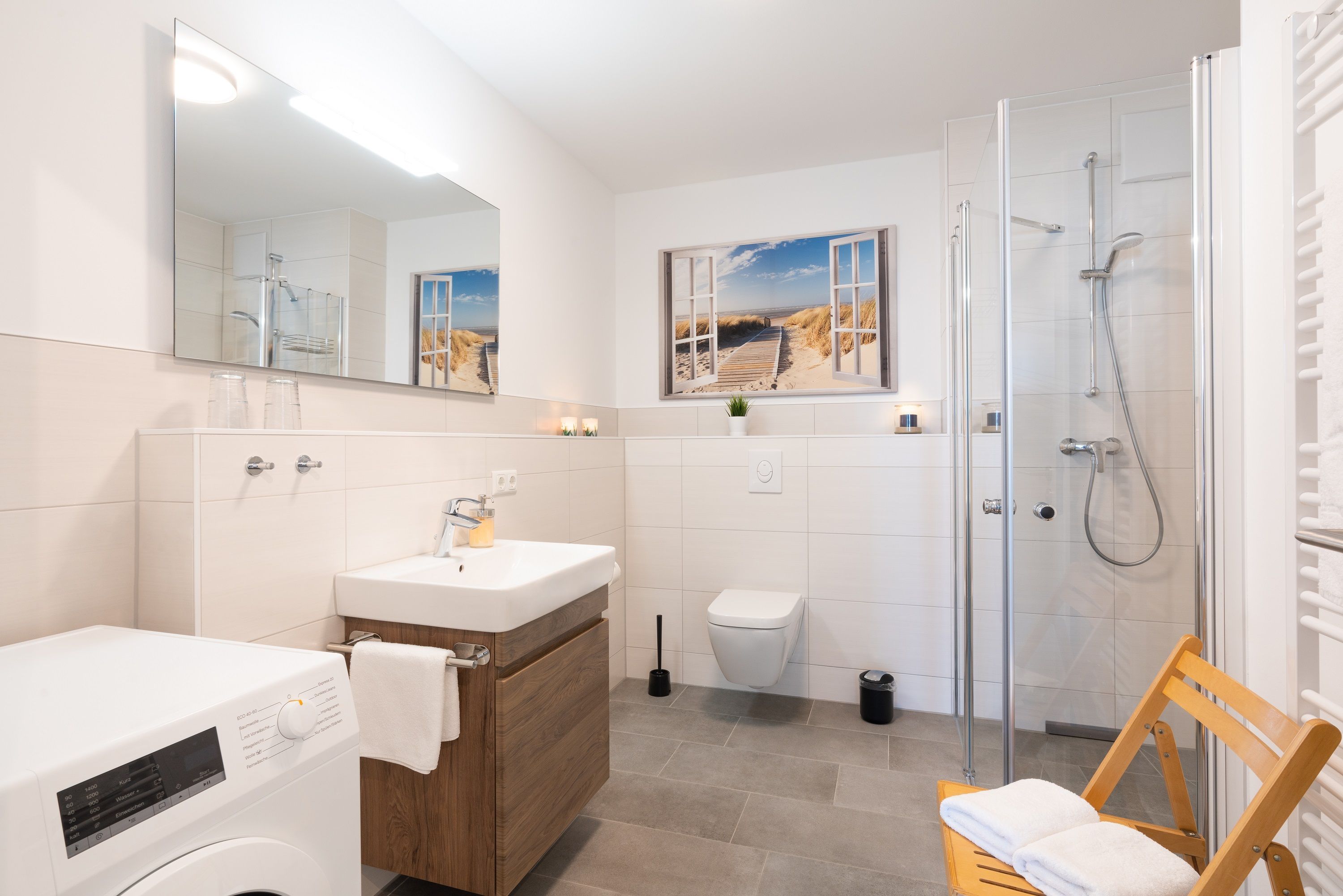 Im großen Badezimmer befindet sich eine Waschmaschine zur freien Verfügung.