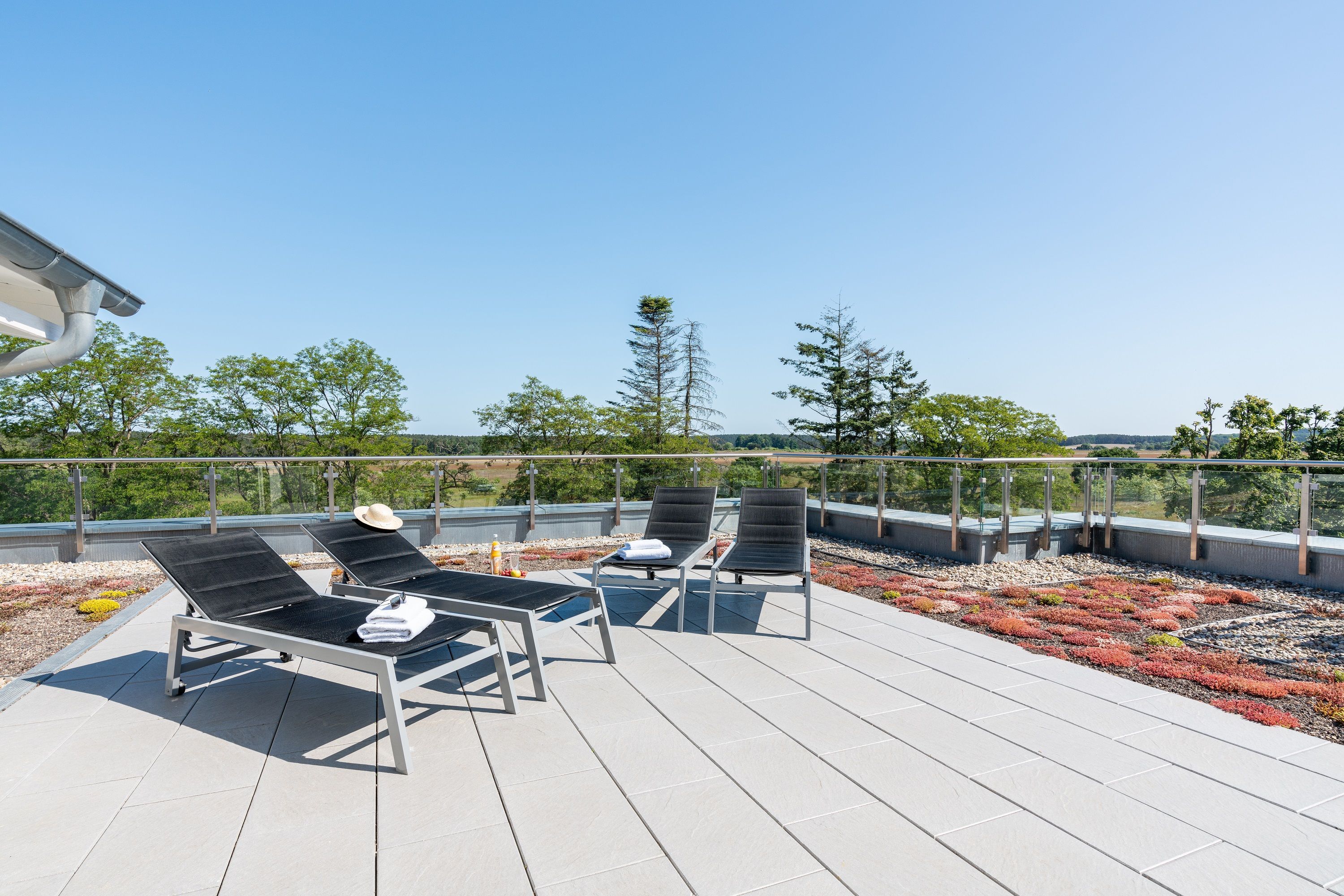 Weit ab von der Hektik und den Besuchermassen öffentlicher Wellnessangebote, finden Sie im Dachgeschoss des Hauses auf 190 m² die Ruhe, die Sie sich verdient haben. Entspannen Sie im hauseigenen, kostenfreien Wellnessbereich mit zwei Saunen und gemütlichem Ruheraum. Genießen Sie die klare Ostseeluft auf der großen angrenzenden Dachterrasse.