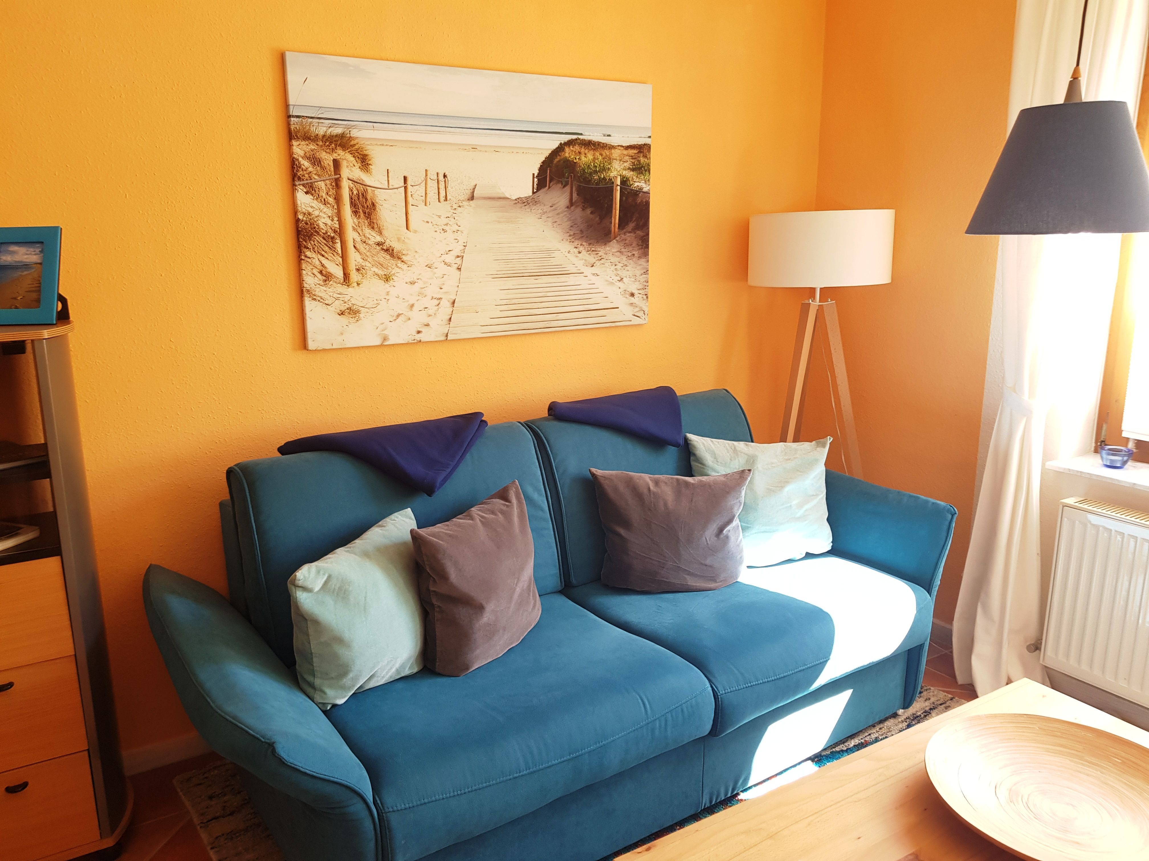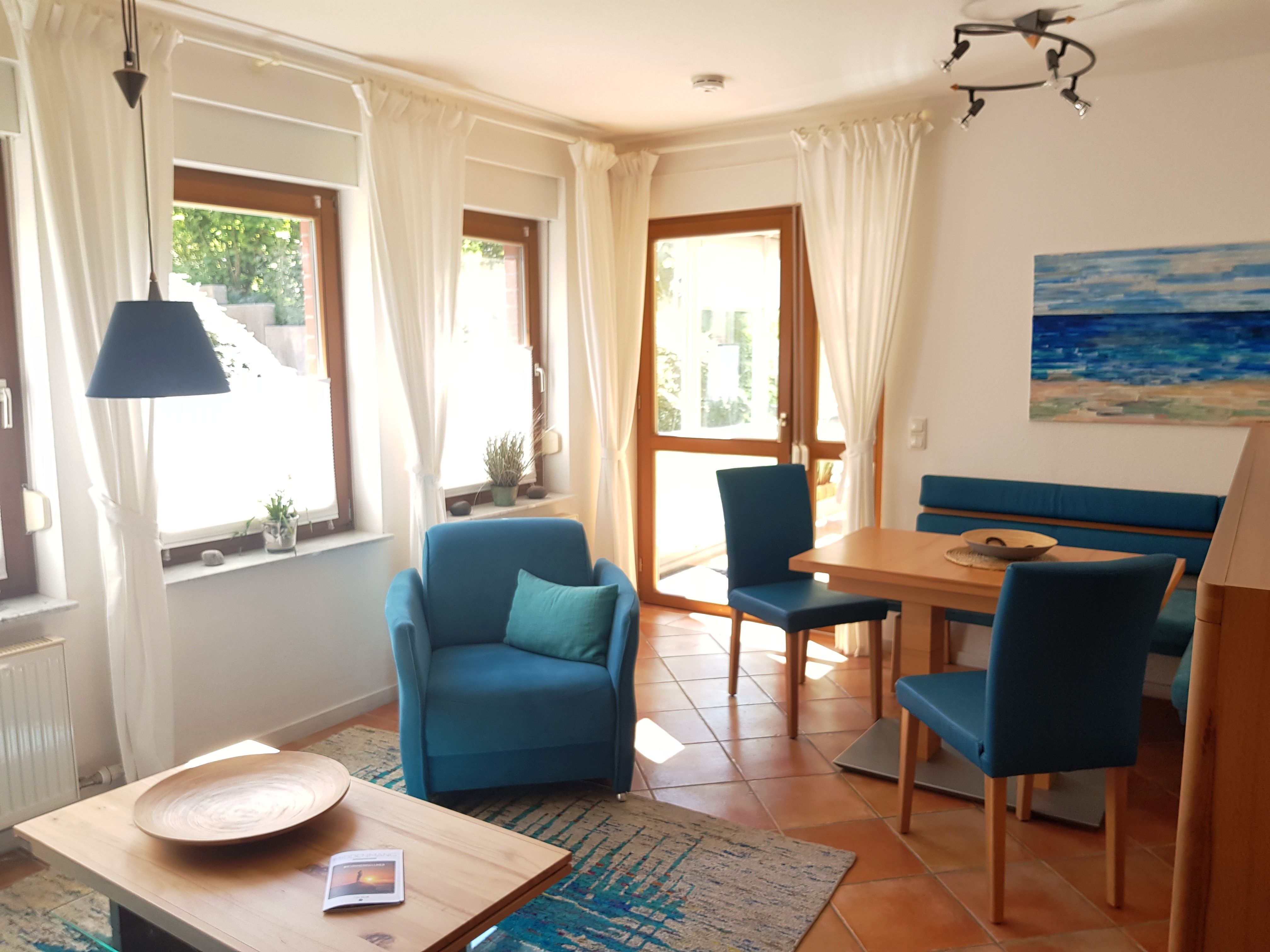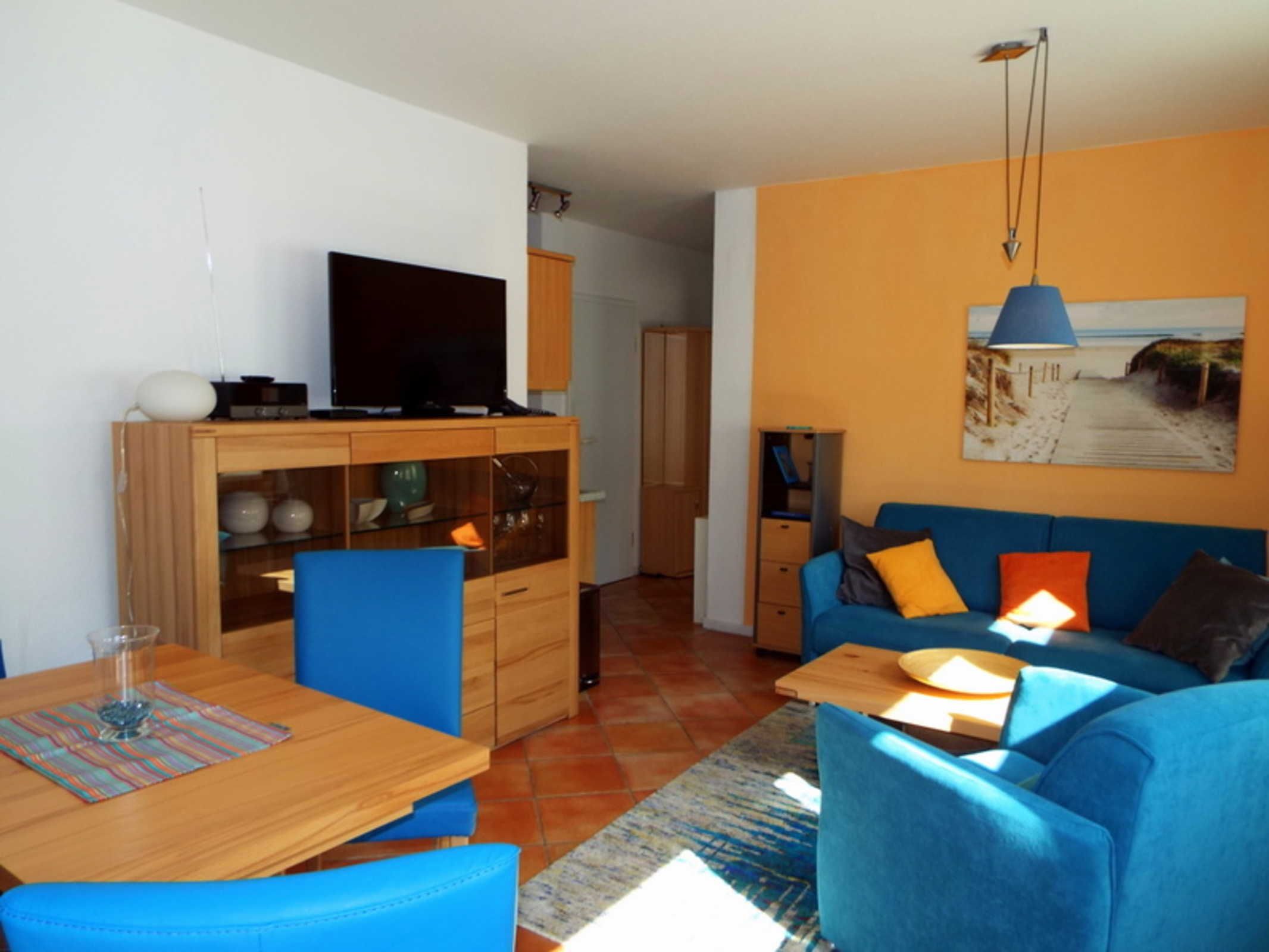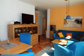Es liegt im Erdgeschoss, hat eine Größe von 53m² und eine Terrasse mit ostseetypischem Strandkorb. Im Wohnbereich finden Sie eine Schlafcouch mit Sesseln, einen separaten Essbereich, einen Flat-Screen TV und Internetradio.