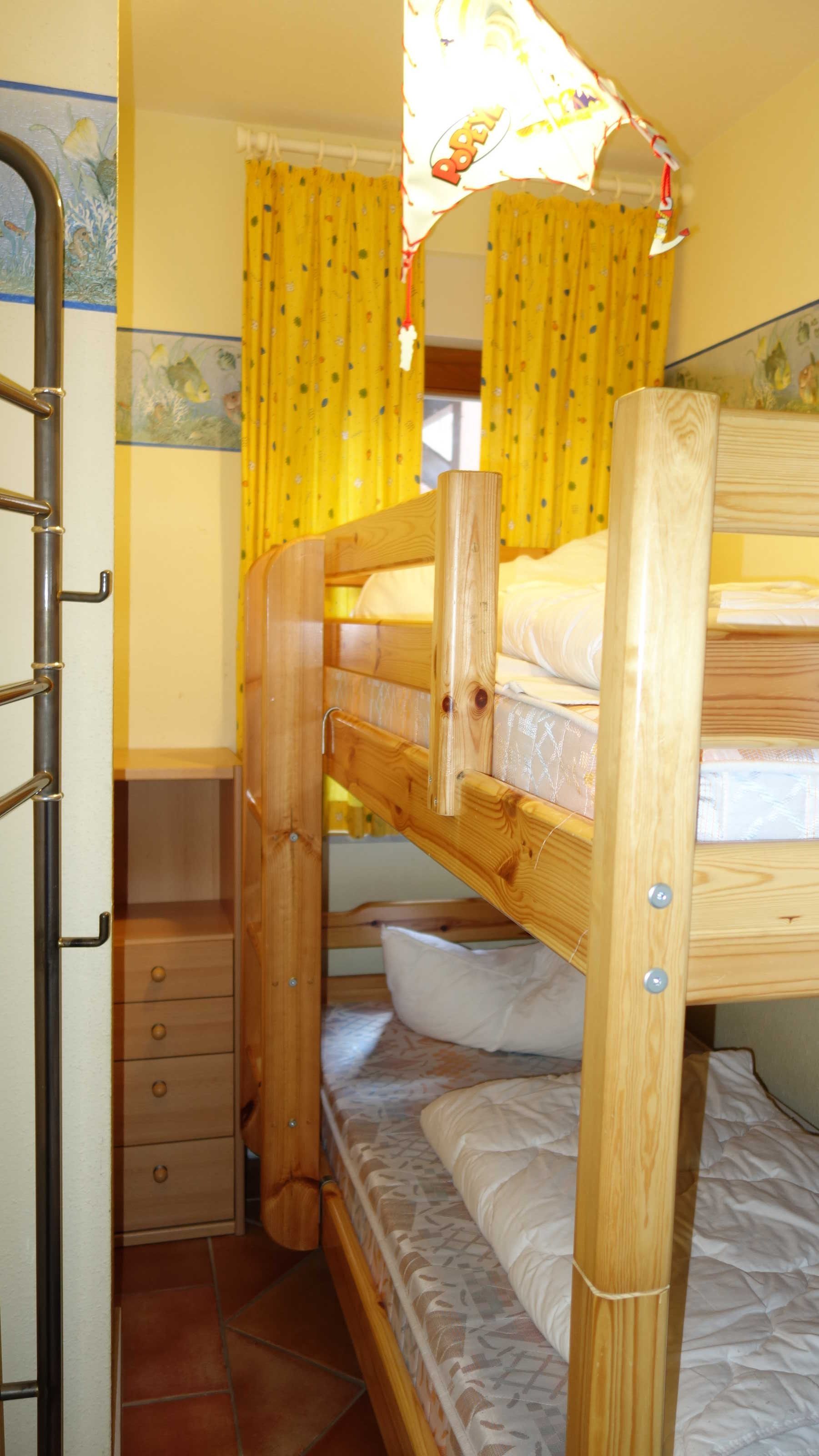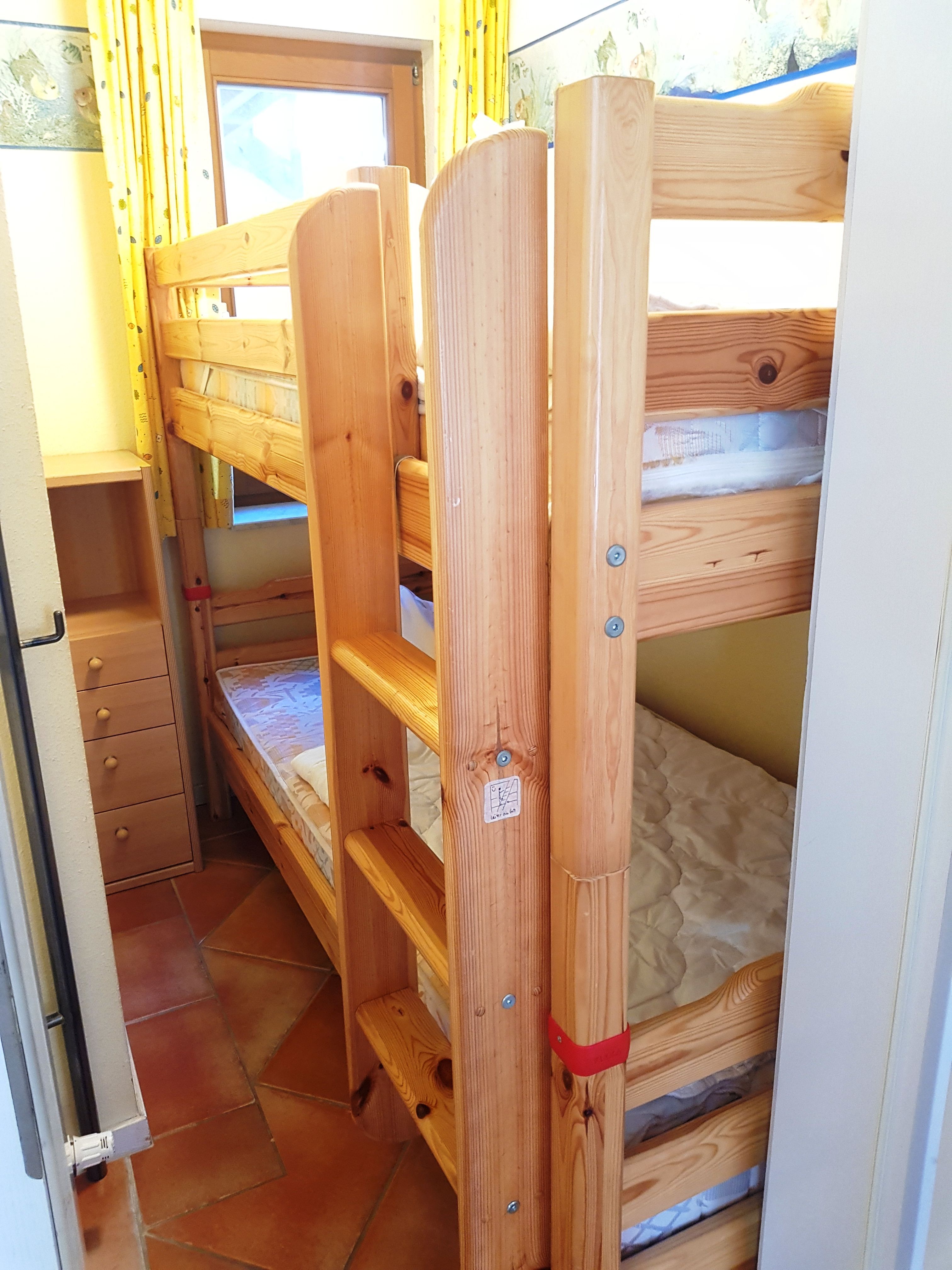 Das erste Schlafzimmer ist mit einem Doppelbett sowie einem großzügigen Kleiderschrank ausgestattet. Das zweite Schlafzimmer ist eine Koje für Kinder mit Etagenbett und einem Fenster.