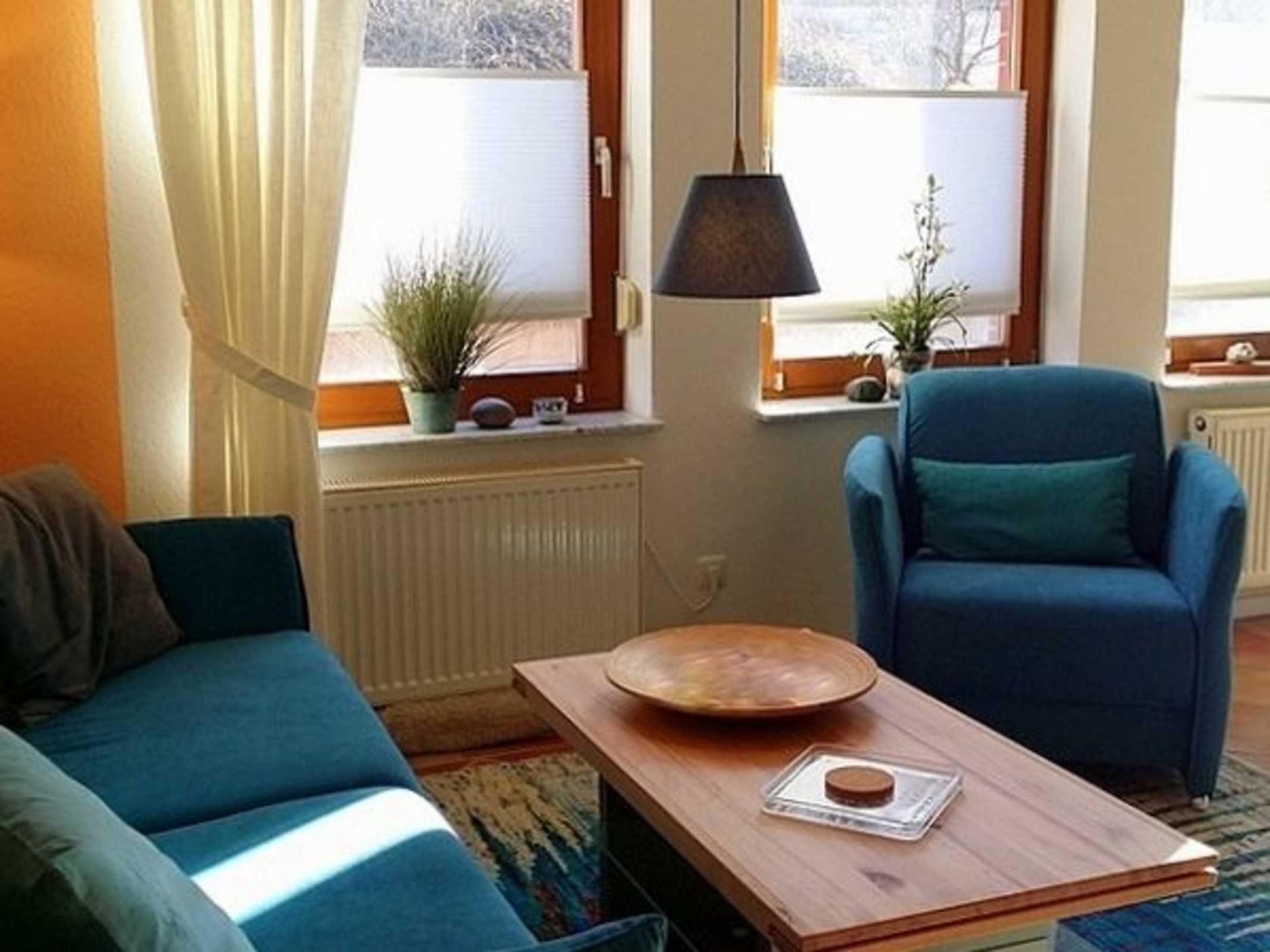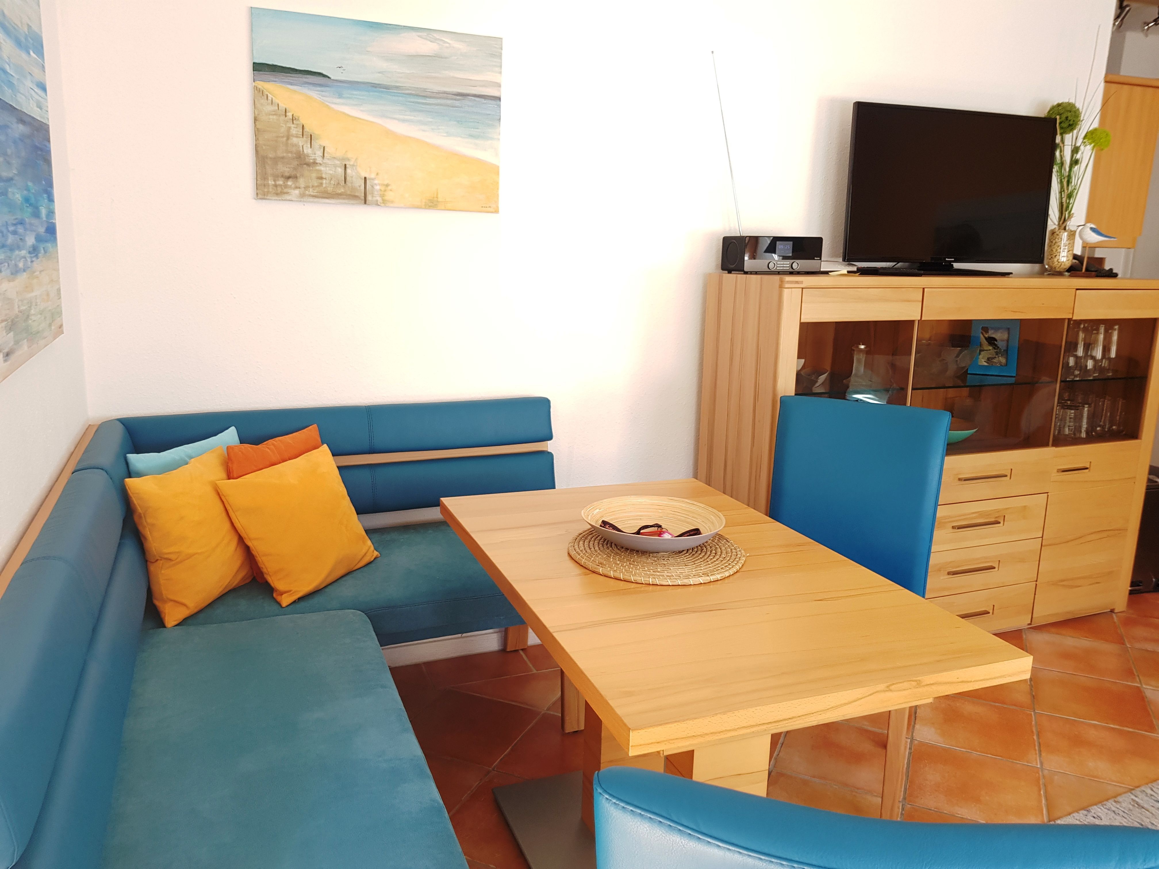 • Wohnzimmer mit Couch und Esstisch für 4 Personen