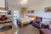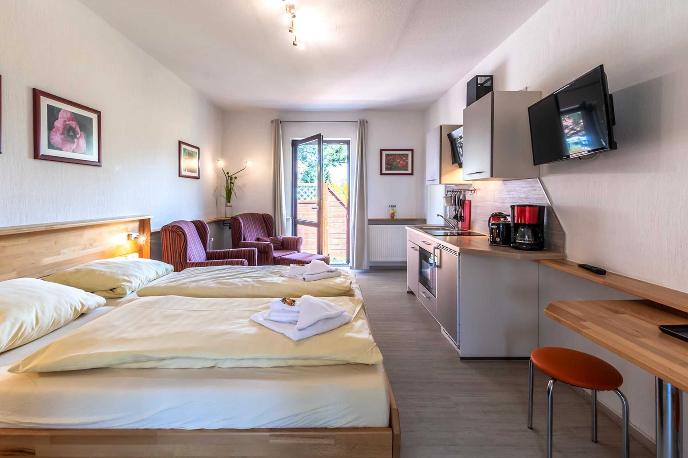 Diese schön eingerichtete 1-Raum Ferienwohnung (Nichtraucher) für bis zu 2 Personen ist ca. 29 m² groß und befindet sich in der linken Haushälfte im Erdgeschoss. Sie wurde komplett neu renoviert und ist hochwertig eingerichtet.