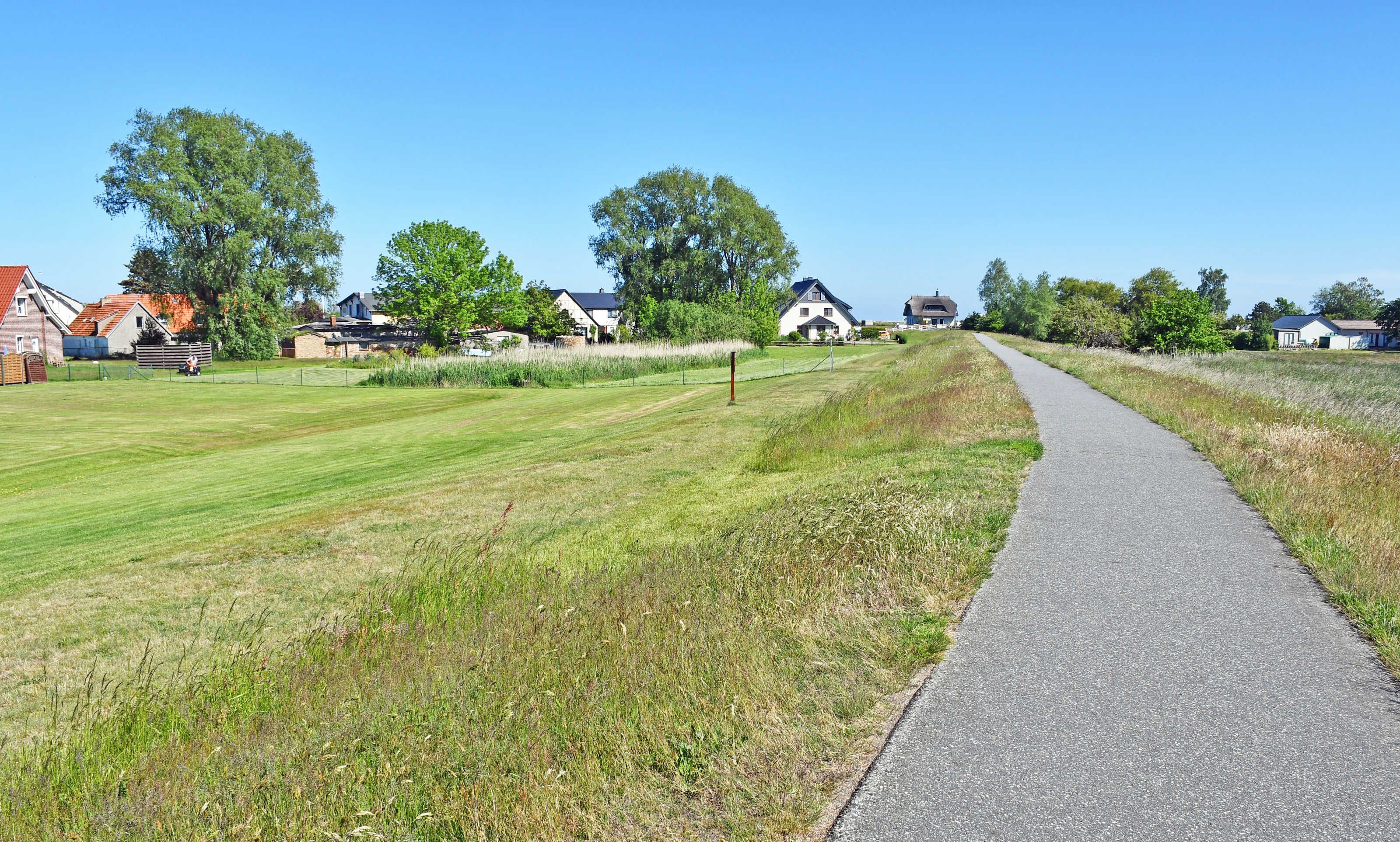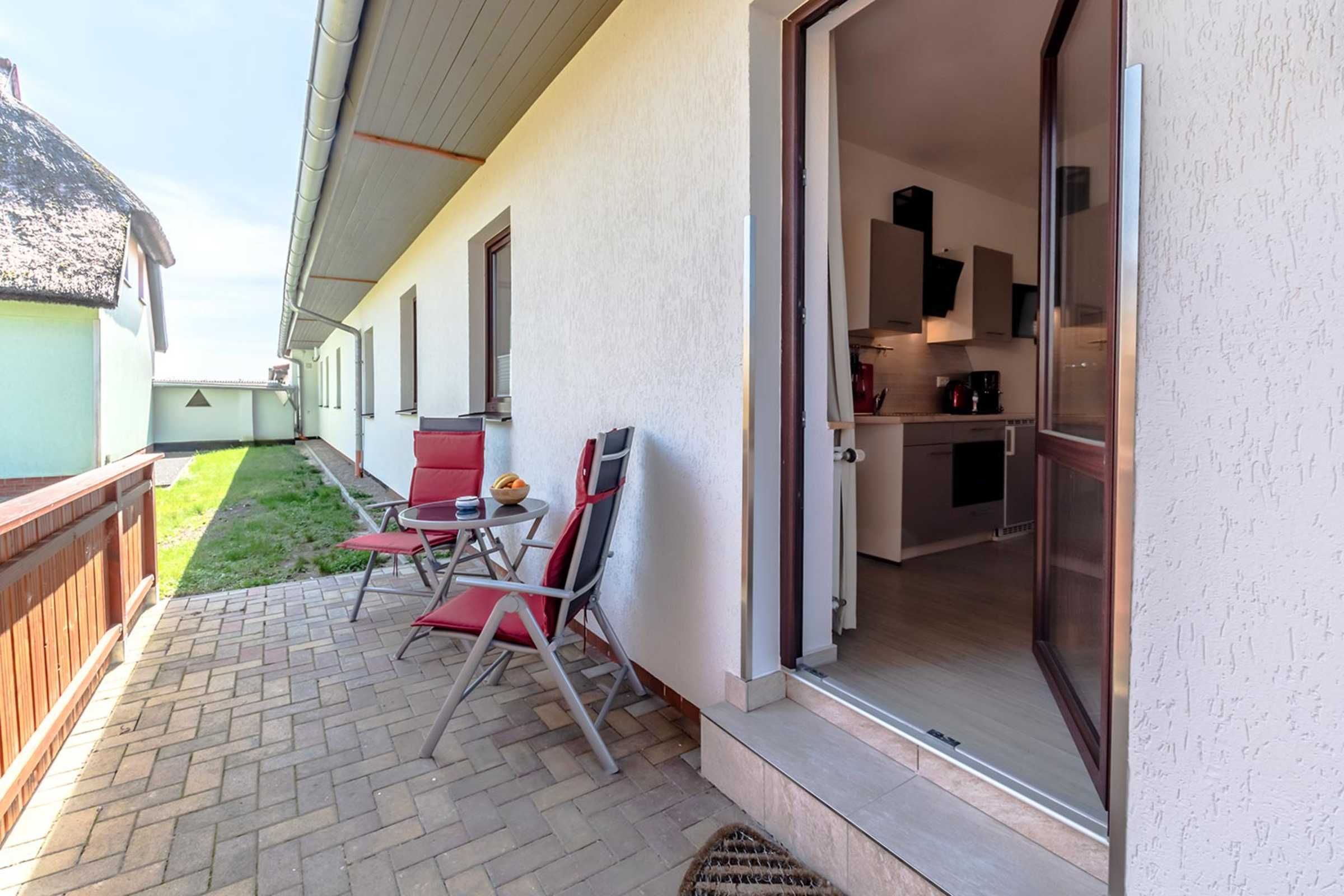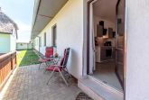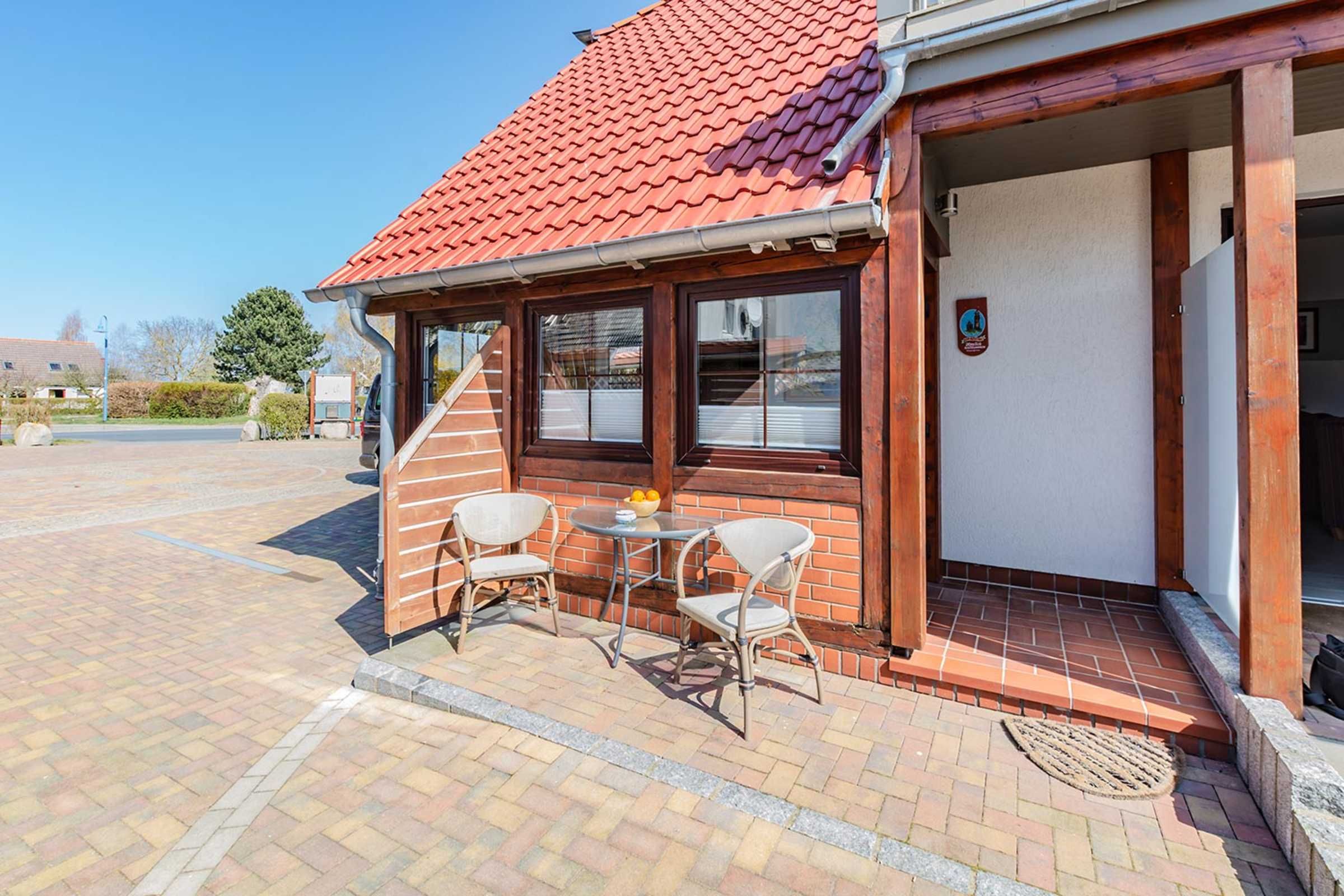 Auf einer kleinen Terrasse vor Ihrer Wohnung können Sie den Ausblick zum Deich genießen. Das WLAN ist ebenso kostenfrei wie ein Parkplatz am Haus.