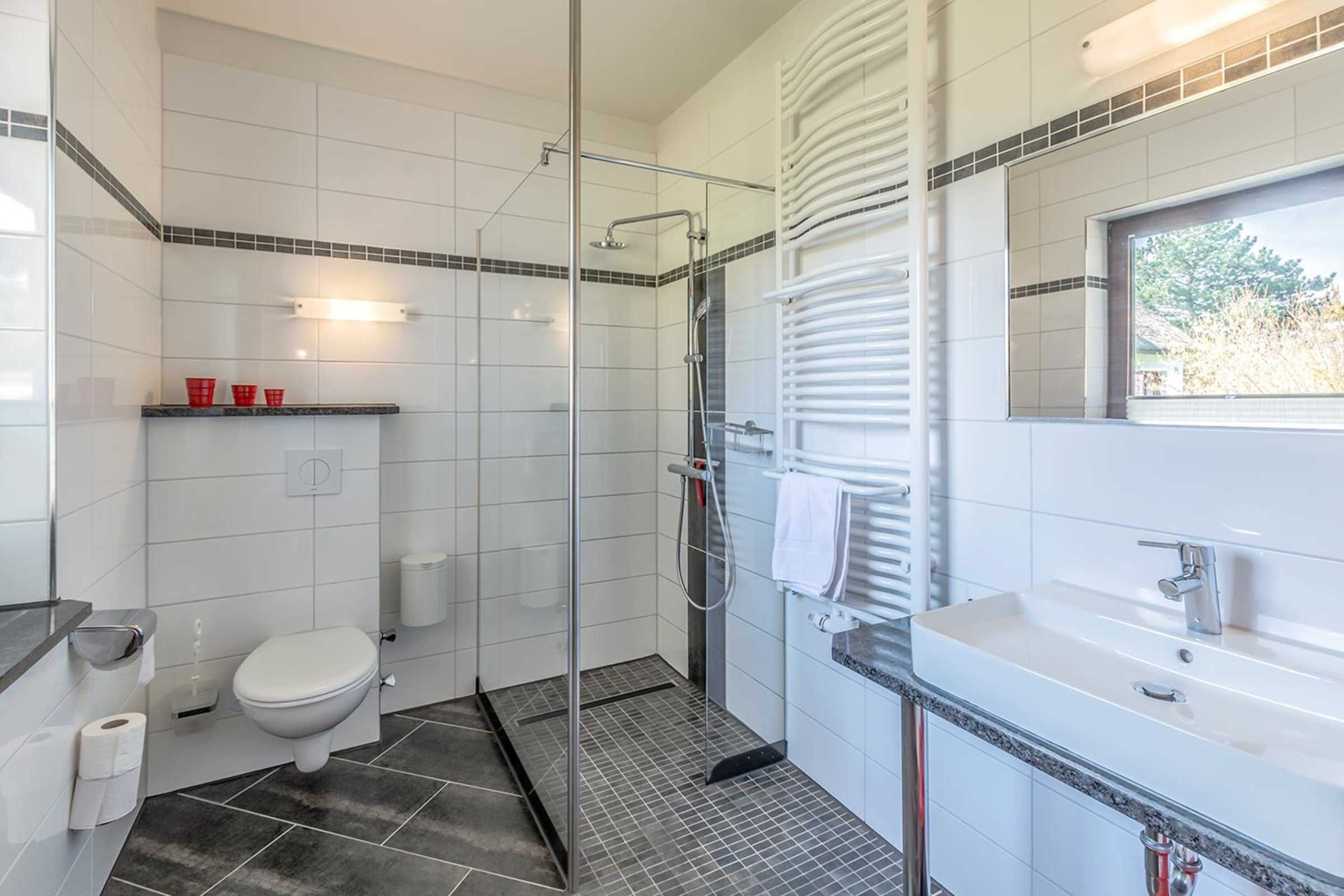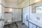 Das Badezimmer (mit Fenster) verfügt über eine Dusche, Waschtisch, WC, Handtuchtrockner und einen Fön.