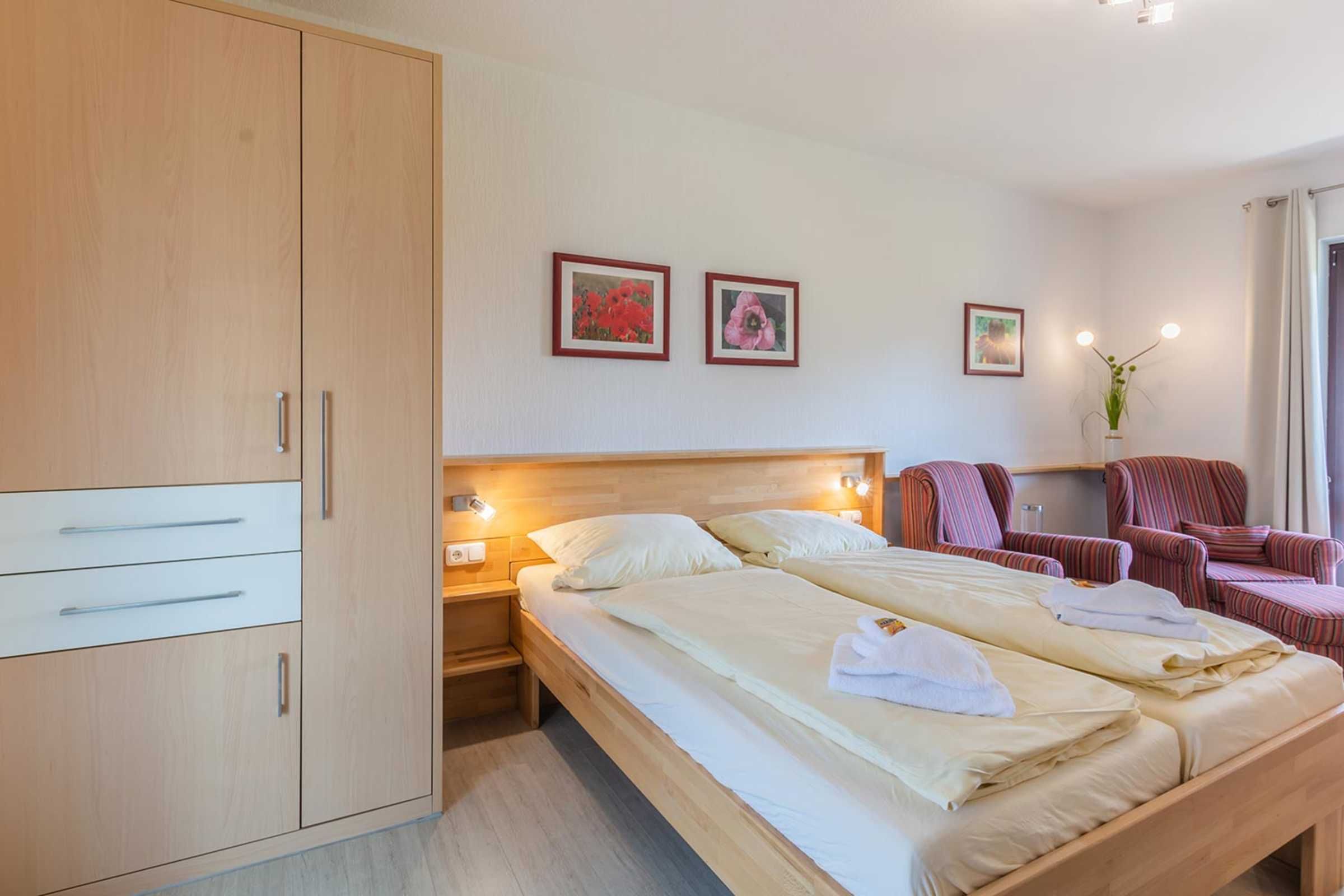 Im Wohnbereich finden Sie ein bequemes Doppelbett mit Nachttischablage und Leselampen, Flachbild-TV, DVD-Player, Kleiderschrank und eine Sitzgelegenheit.