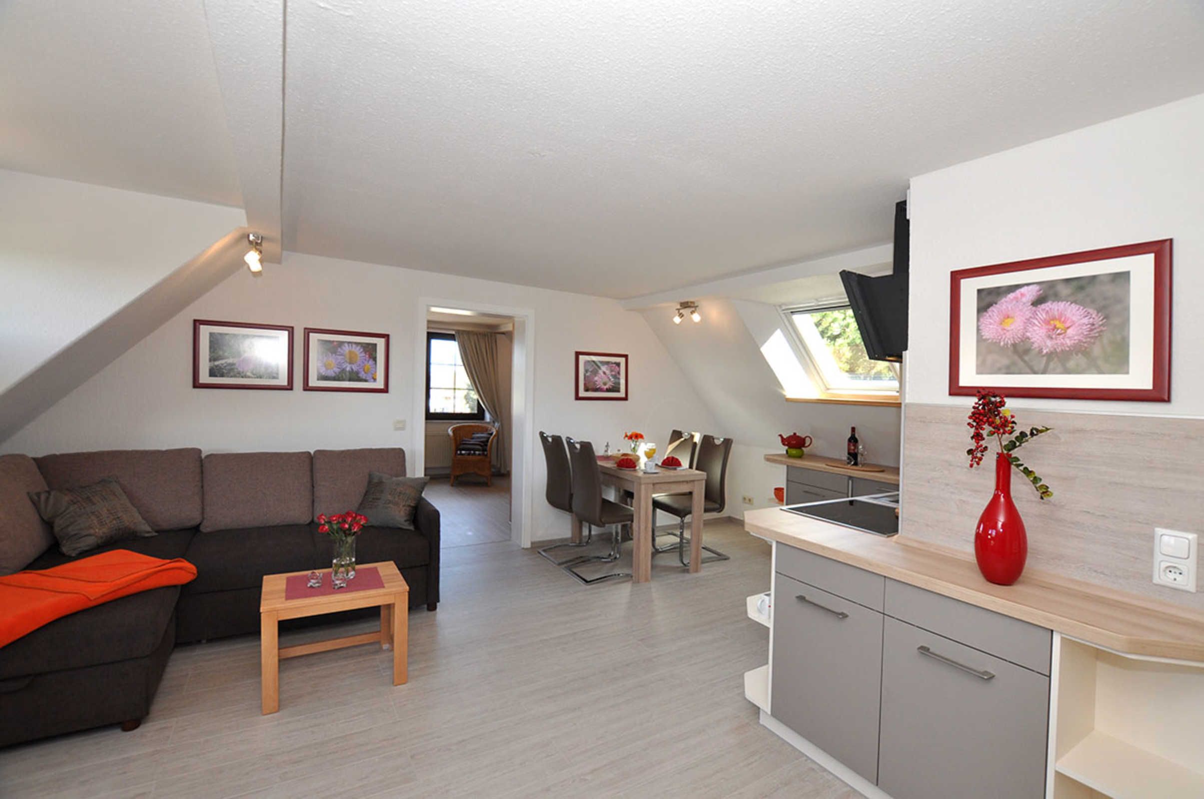 Diese schöne 2-Raum Ferienwohnung für bis zu 4 Personen ist ca. 58 m² groß und befindet sich in der linken Haushälfte in der erste Etage. Sie wurde komplett neu renoviert und ist hochwertig eingerichtet.