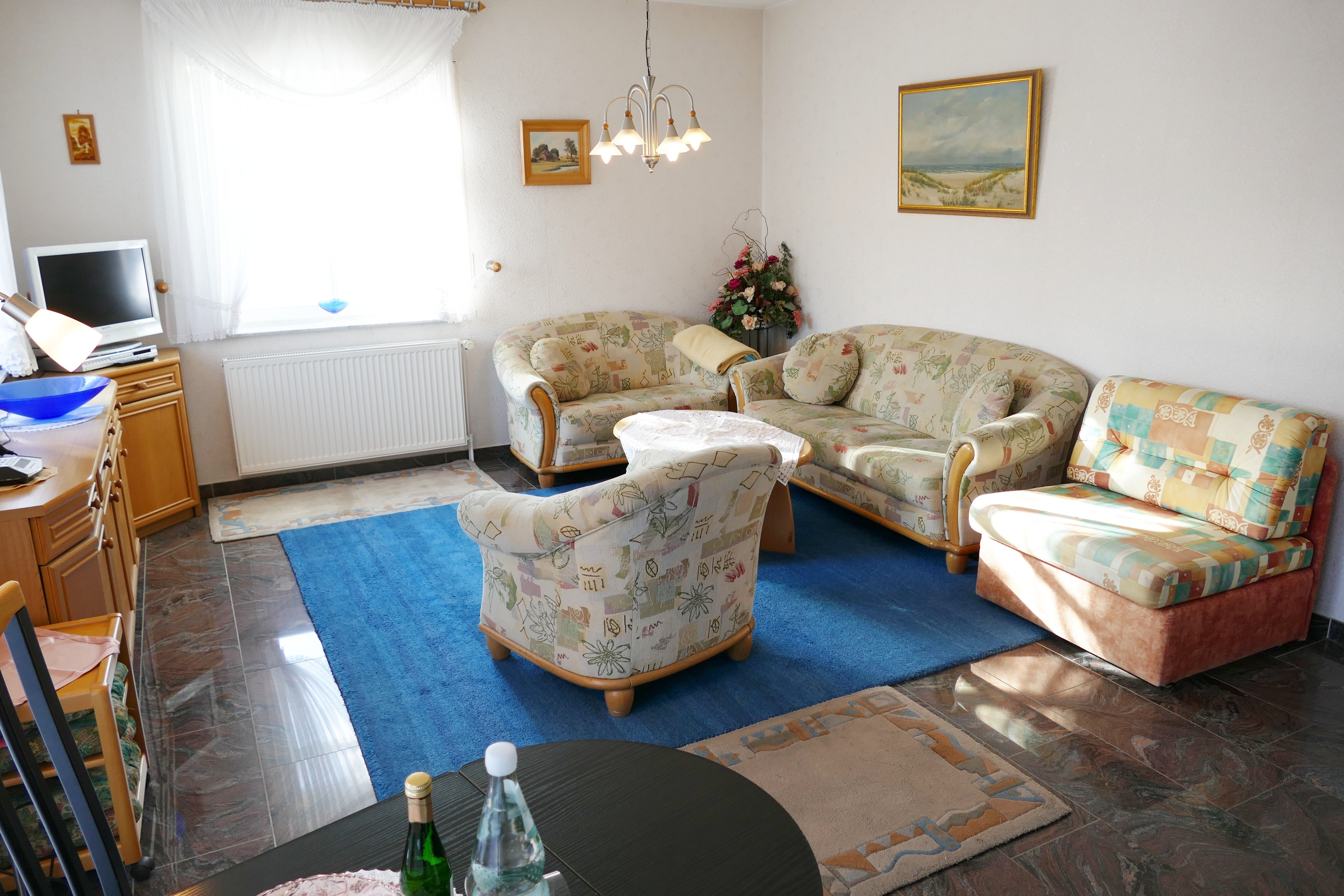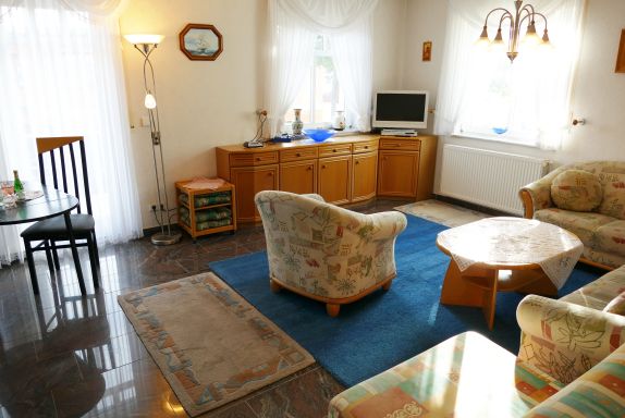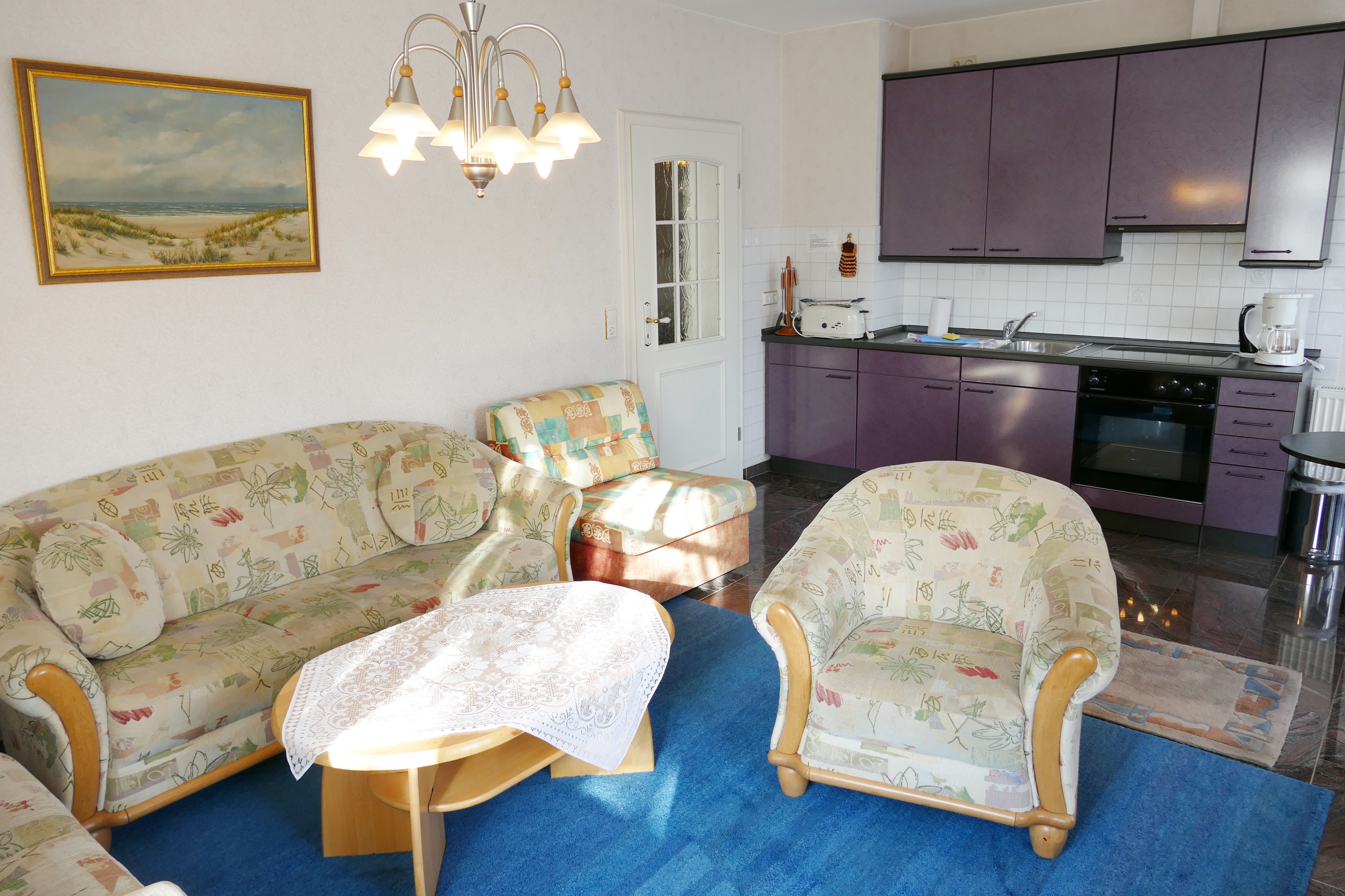 Die helle Ferienwohnung im Obergeschoss verfügt über ein gemütliches Wohnzimmer mit Sofa und einer Küchenzeile mit Backofen, Kühlschrank und Herd und Essplatz. Das Schlafzimmer verfügt über ein Doppelbett,. Bad mit Dusche und WC. Ein Balkon zur Ostseite steht ebenfalls zur Verfügung.