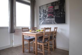 Die Küche unserer Ferienwohnung ist vollständig ausgestattet und lässt keine Wünsche offen. Sie finden alles, was Sie benötigen, um sich selbst zu verpflegen – inklusive einem 2-Platten-Herd, Kühlschrank, Kaffeemaschine, Toaster und Wasserkocher. Der Esstisch im Apartment lädt zum gemeinsamen Speisen ein und sorgt für Geselligkeit. Alternativ können Sie auch die zahlreichen Restaurants in der Nähe ausprobieren, die lokale und internationale Küche anbieten.