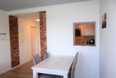 Schlafzimmer mit Boddenblick, Wohnzimmer mit Balkon, Esstisch mit Durchreiche zur offenen Einbauküche mit hochwertiger Küchenausstattung; Kaffeeautomat (Bohnen und Pulver), Backofen inkl. Mikrowelle und Grillfunktion, Geschirrspüler.