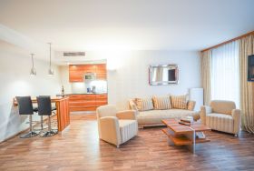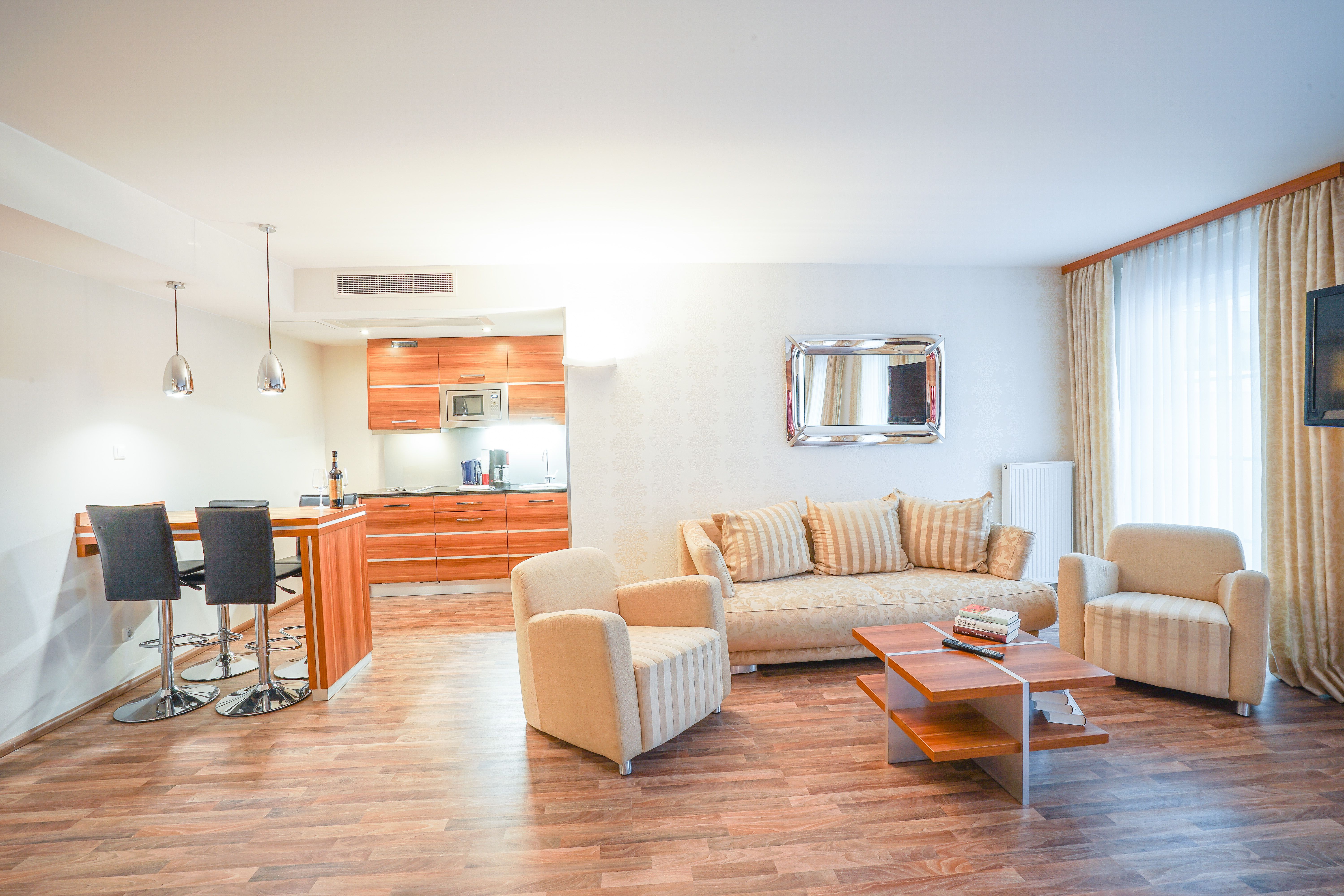 Unsere 32 qm großen, modern eingerichteten Apartments verfügen über einen getrennten Wohn- und Schlafraum. Sie sind für maximal zwei Erwachsene und zwei Kinder bis 16 Jahre geeignet. Alle Apartments sind mit jeweils einem Balkon oder einer Terrasse ausgestattet.