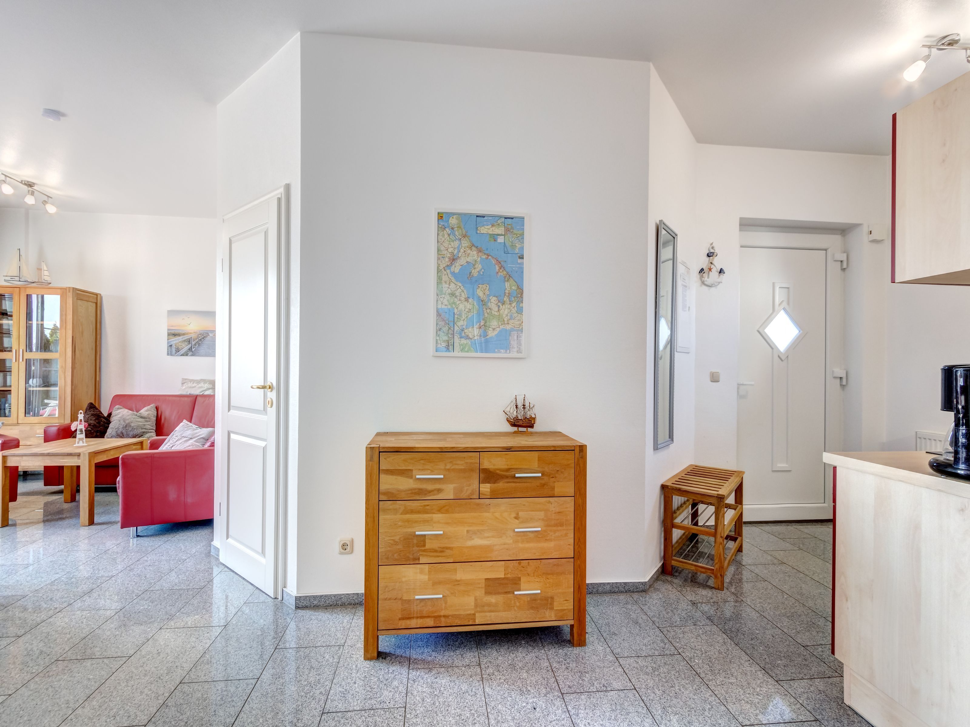 Die Wohnung befindet sich im Erdgeschoss und verfügt über eine große, nach Süden ausgerichtete, Terrasse. Genießen Sie den einzigartigen Blick vom Außenbereich auf das Treiben und die Segelboote im Yachthafen des Ostseebades Karlshagen, wie auch auf die ausgedehnten Peenewiesen.