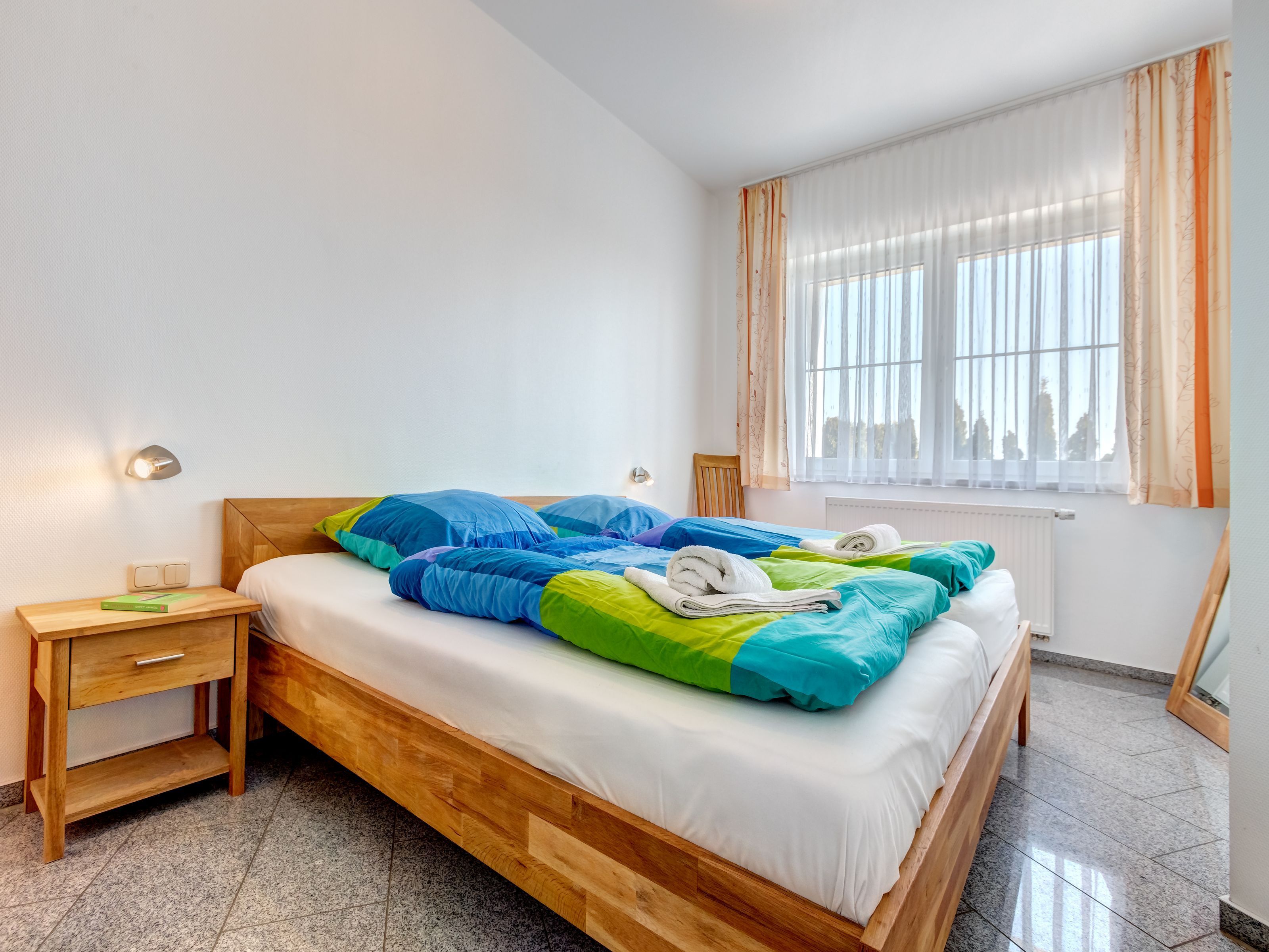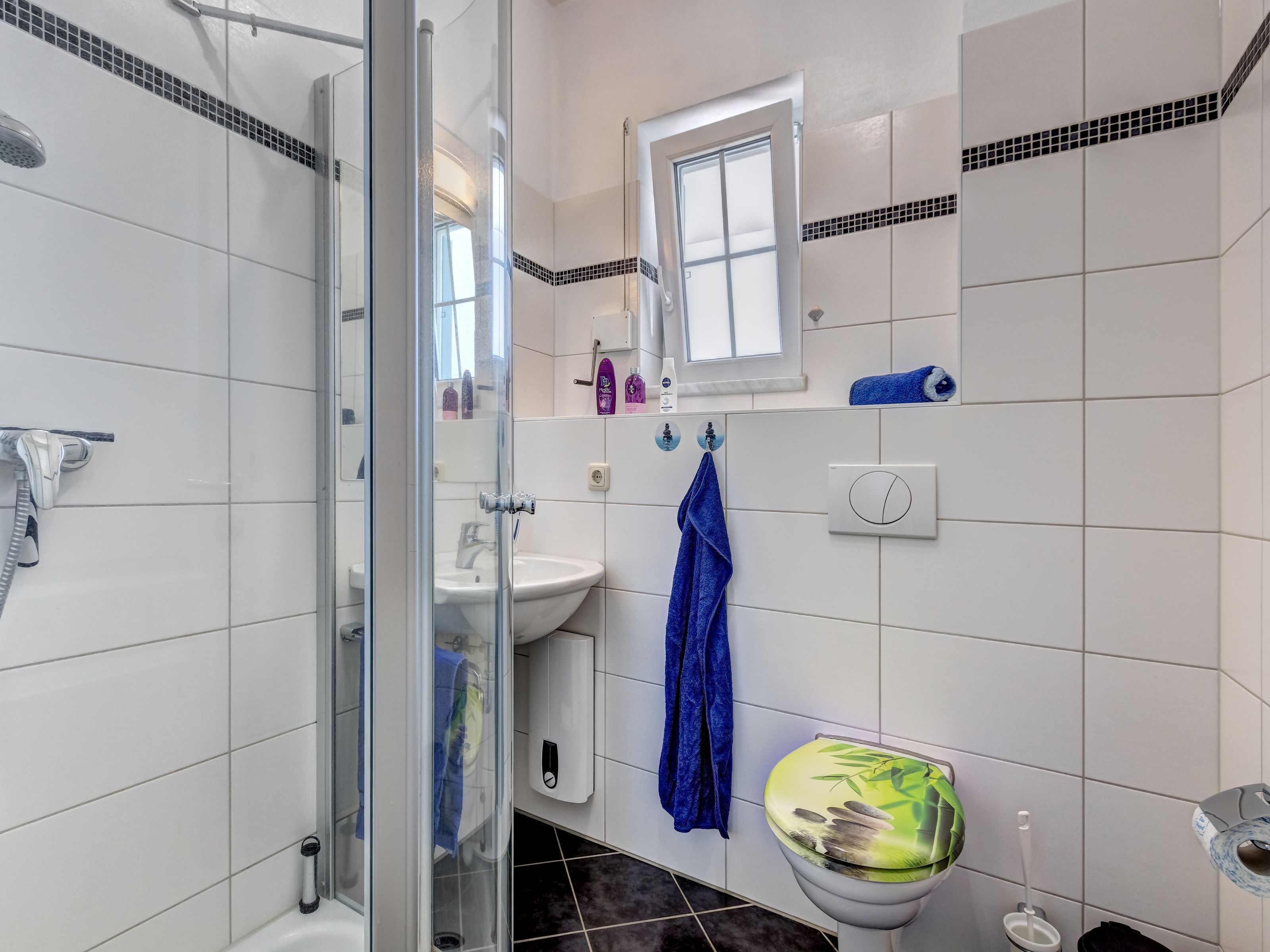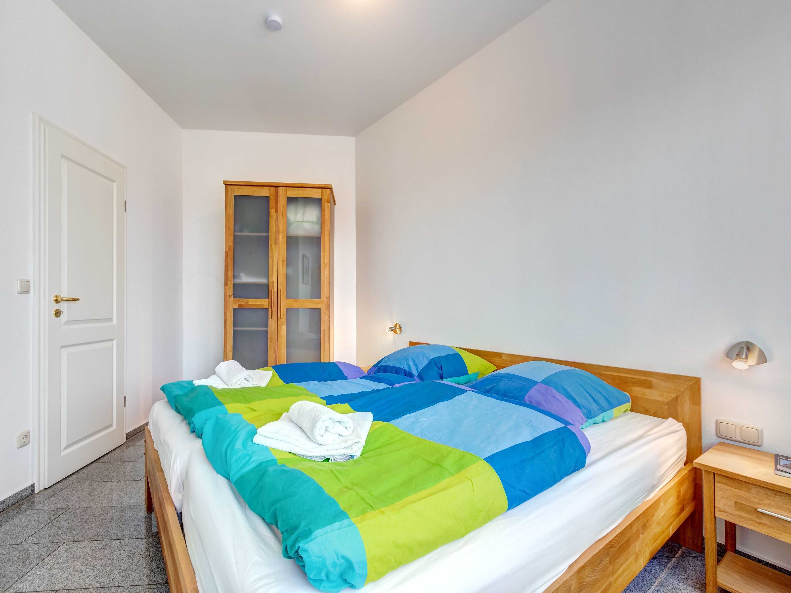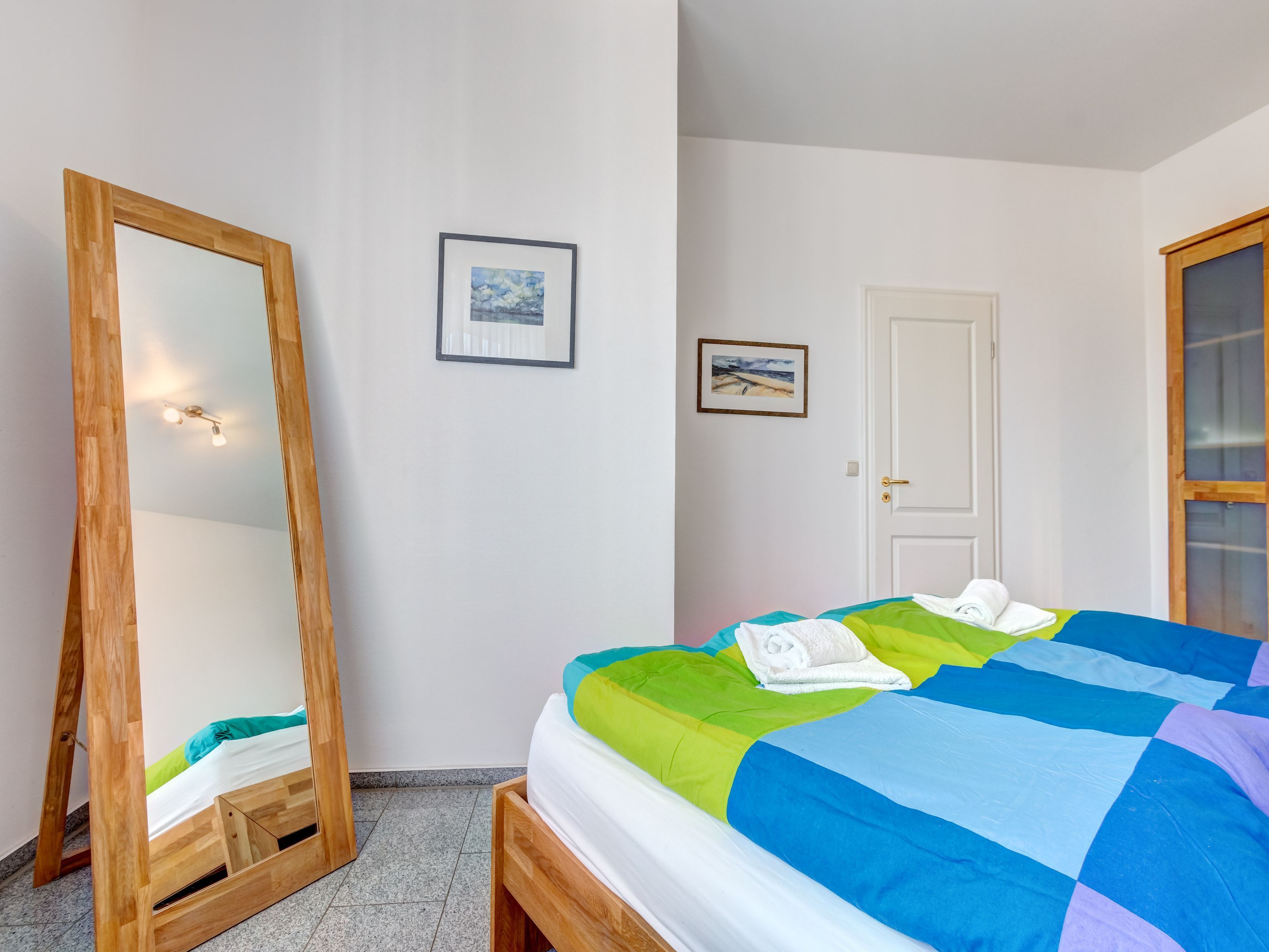 Das Bad ist mit einer Dusche, WC und Fußbodenheizung ausgestattet. In den zwei getrennten Schlafzimmern befindet sich je ein Doppelbett (2m x 2m und 1,80m x 2m), ein Kleiderschrank und Ablagemöglichkeiten. Im Bedarfsfall kann die Couch im Wohnzimmer zum Bett (1,60m x 1,90m) umfunktioniert werden.