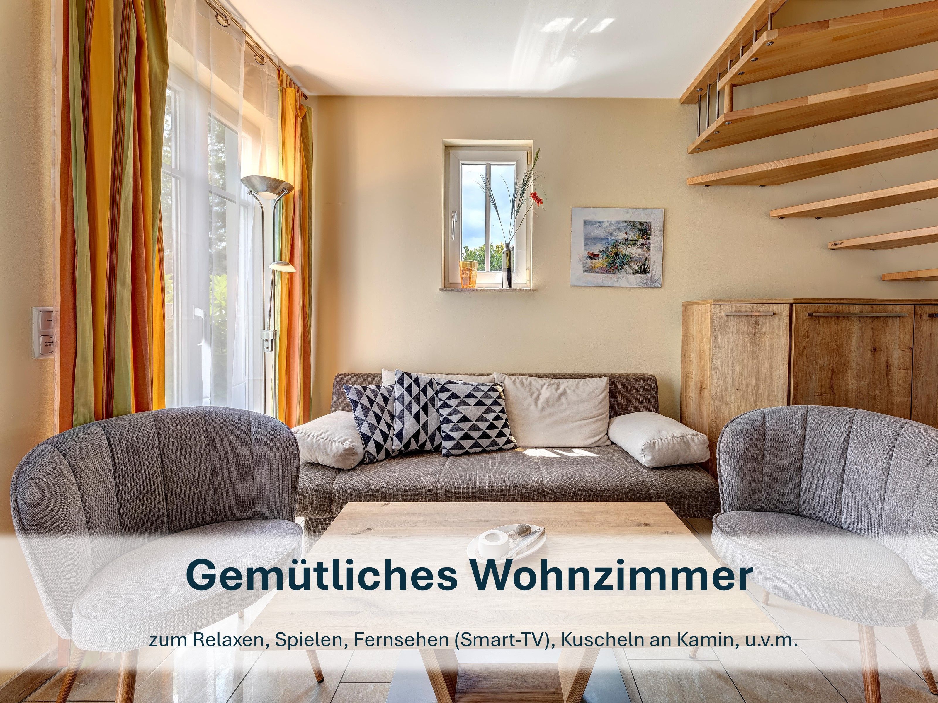 Das Haus erstreckt sich über drei Etagen. Im Erdgeschoß befindet sich eine voll ausgestattete, offene Küche, sowie ein Wohnbereich mit Kamin, gemütlicher Couch (Aufbettungsmöglichkeit) und einem Flat-TV. Von hier können Sie die möblierte Terrasse erreichen. Sie ist nach Osten ausgerichtet, sodass Sie jeden Morgen ein schönes Sonnen-Frühstück genießen können. Zusätzlich haben Sie ein Gäste-WC im Erdgeschoß, damit niemand anstehen muss.