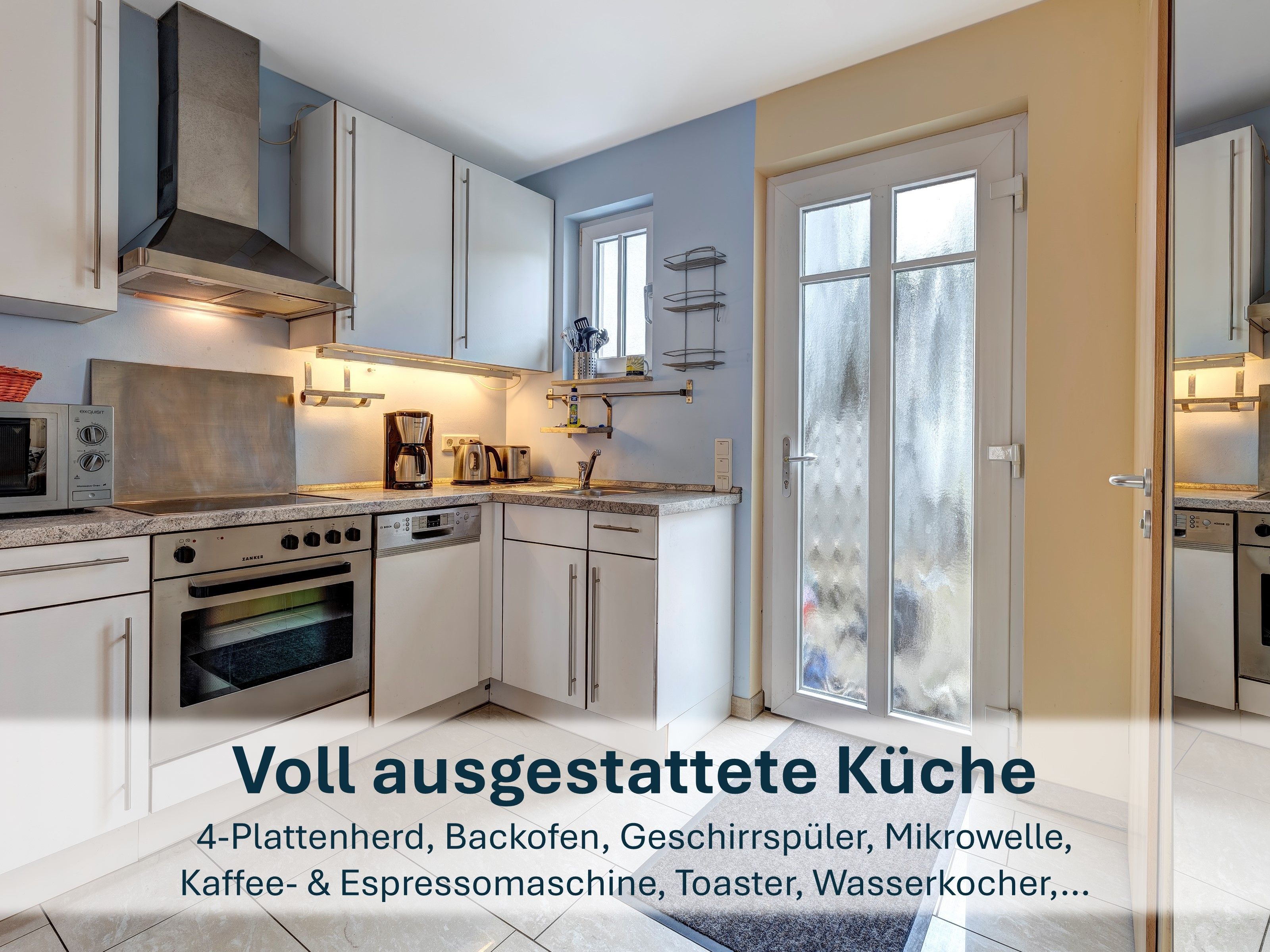 Voll ausgestattete Küche, Wohnzimmer mit Kamin, Gäste-WC und Terrasse im Erdgeschoß.