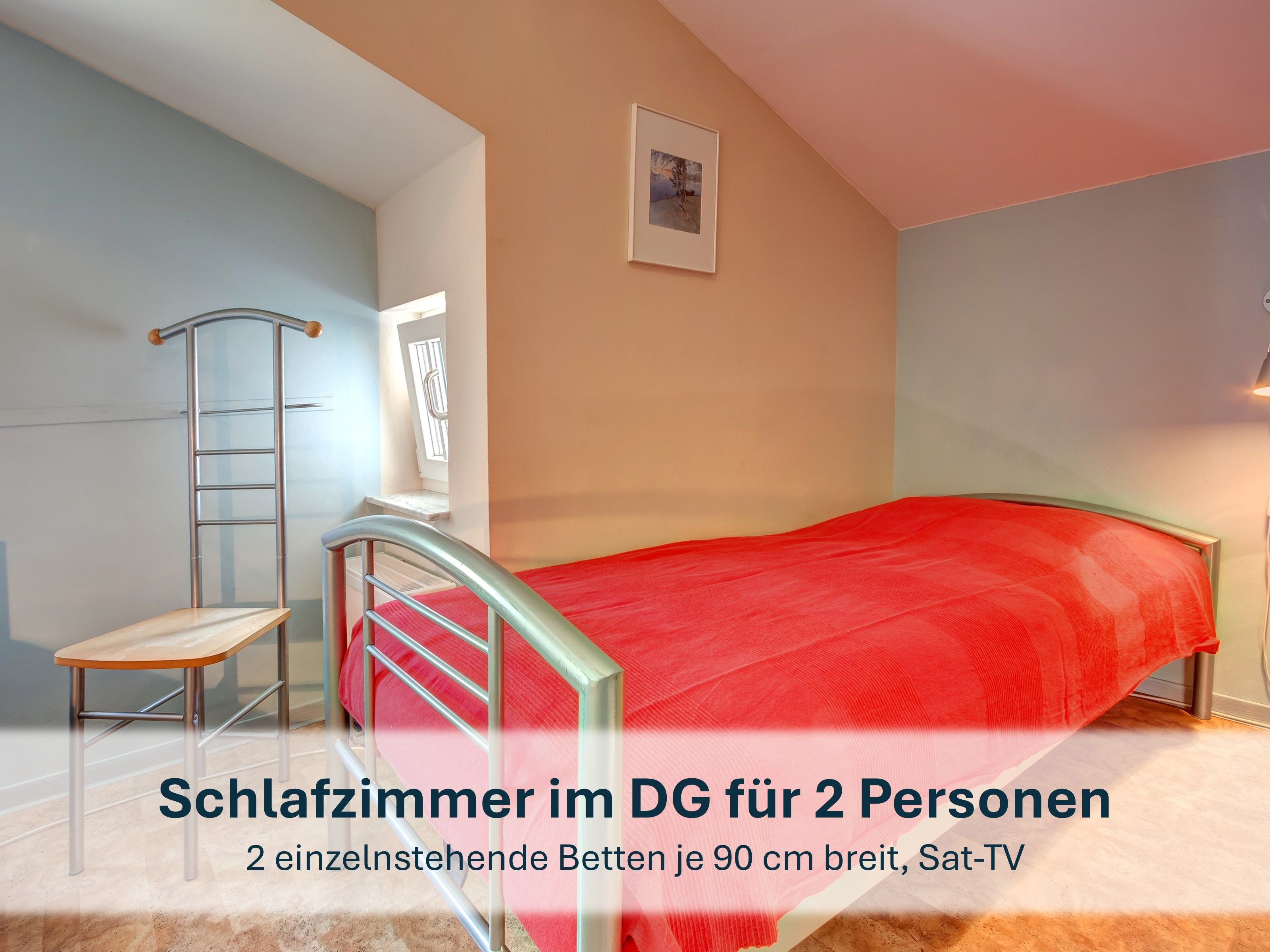 Drittes Schlafzimmer im Dachgeschoß, sowie Badezimmer mit Wanne und WC und private Sauna (Nutzung im Preis inklusive).