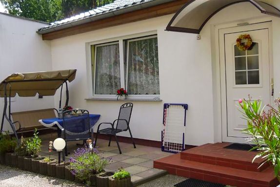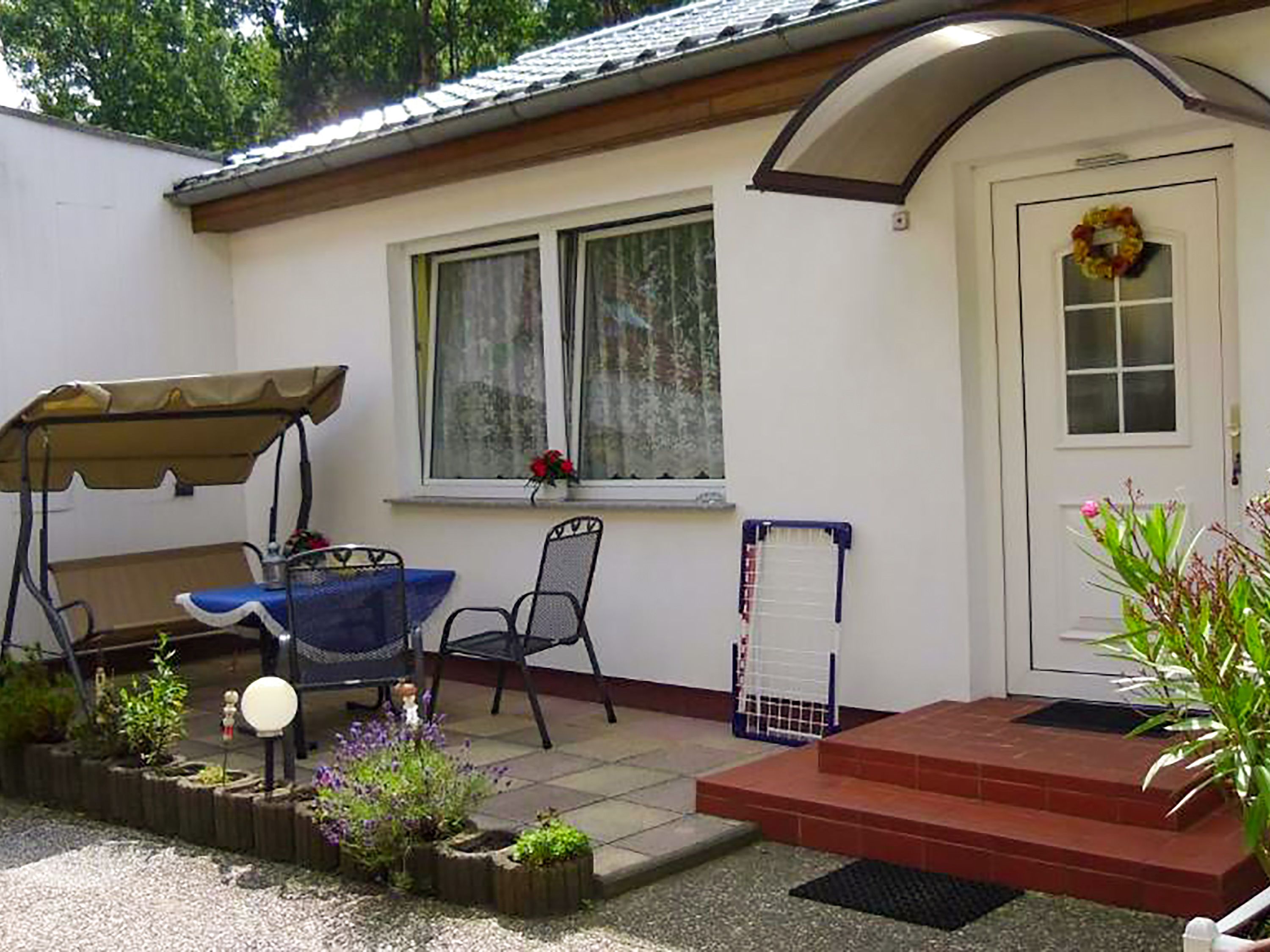Vor dem Bungalow befindet sich eine Terrasse mit Hollywoodschaukel und Grill. Der Parkplatz, der große Garten und das WLAN können genutzt werden