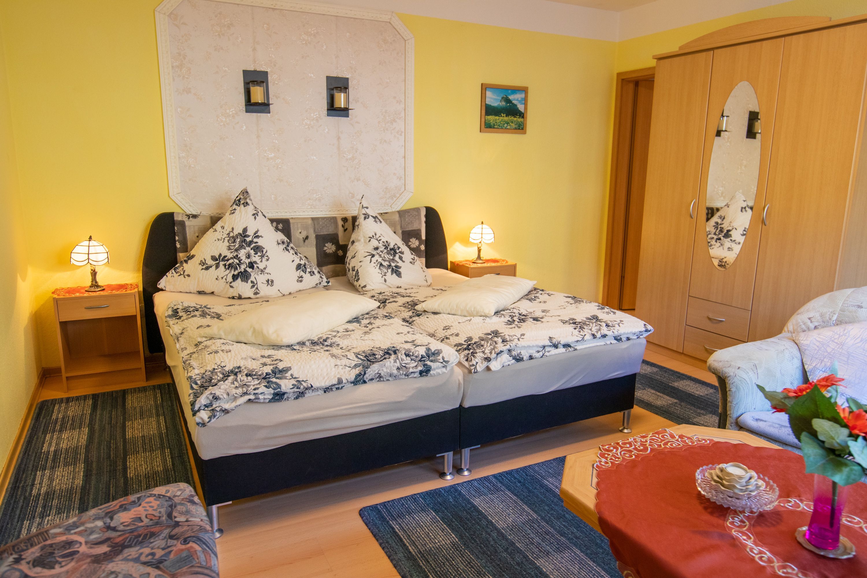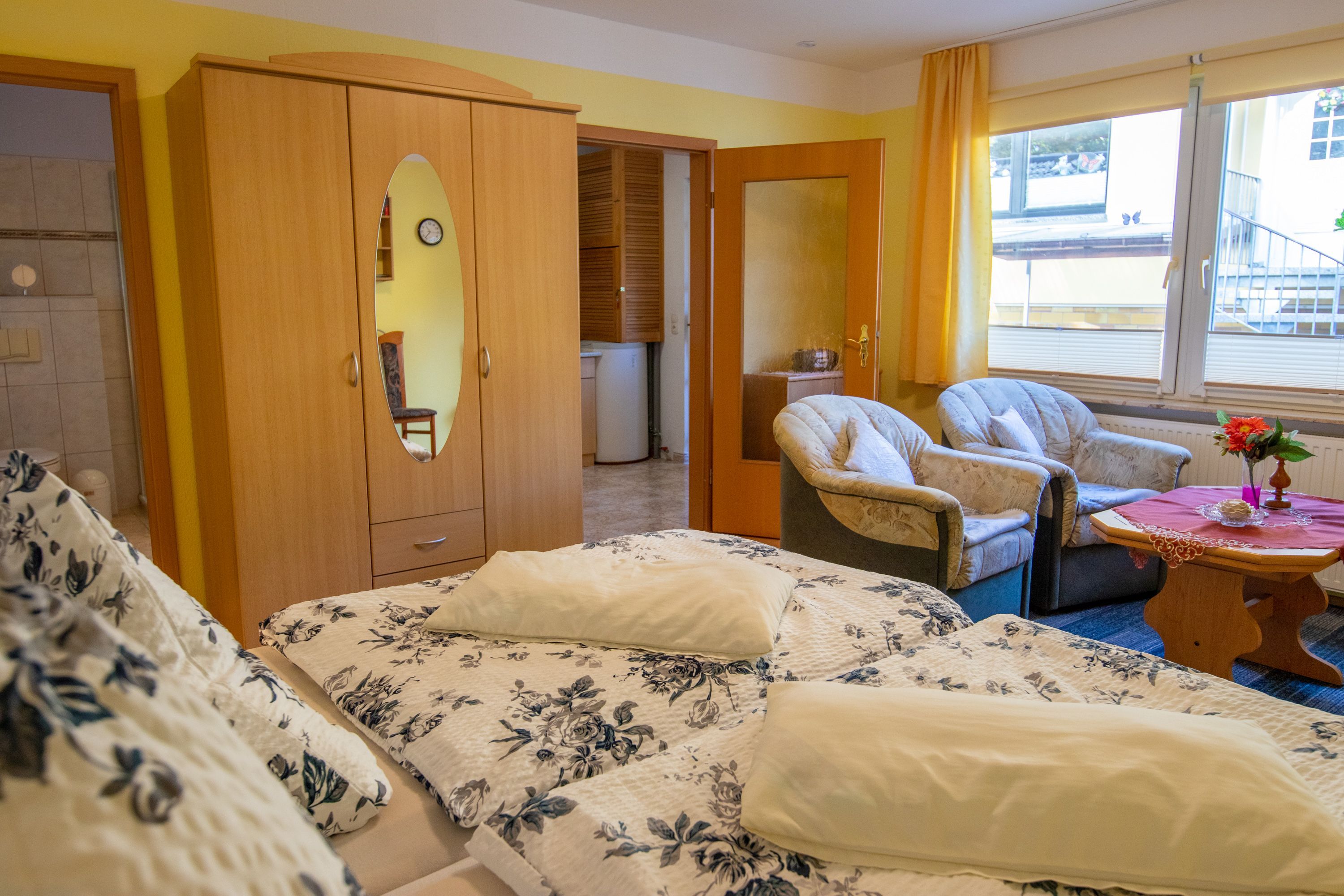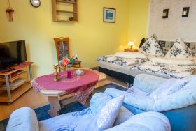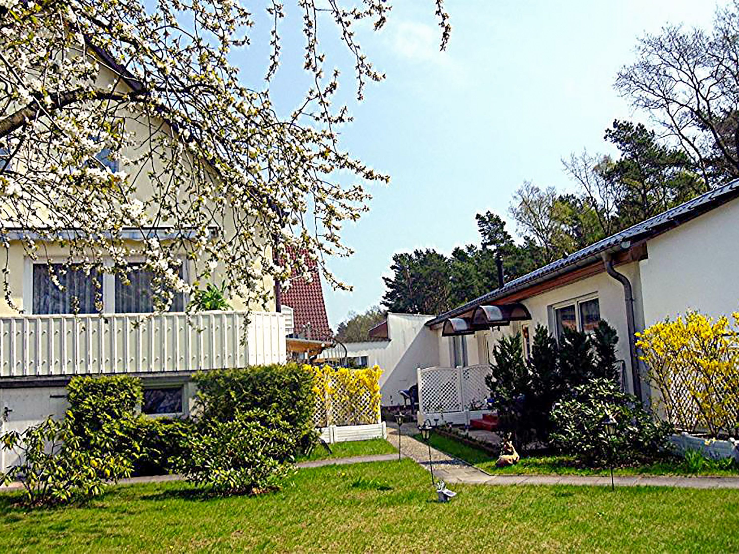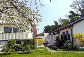 Das Haus Parchow im Ostseebad Baabe bietet seinen Gästen insgesamt 3 Wohnungen auf dem Grundstück der Vermieter. Die Ferienwohnung 2 mit 70 m² befindet sich im Haus der Vermieter und ist für bis zu 4 Personen ausgelegt. Über eine separate Außentreppe erreicht man die Ferienwohnung im Dachgeschoss. Sie verfügt über 2 Schlafzimmer mit Doppelbetten und eine offene Wohn-Küche mit Esstisch, Sofa und TV. Das kleine Tageslicht-Bad ist mit Dusche und WC ausgestattet. Die beiden Ferienwohnungen 3 und 4 im Bungalowstil sind mit jeweils 30 m² für 2 Personen geeignet. Sie verfügen über ein kombiniertes Wohn-Schlafzimmer mit Doppelbett, TV und Sesseln, eine Küche mit Essbereich, sowie ein Bad mit Dusche und WC.