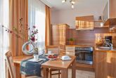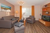 Moderne stilvolle 2 Zimmerferienwohnung ca. 2 - 4 Personen. Wohnzimmer mit TV, CD Eßplatz und integrierter Vollküche mit Geschirrspüler. Die Wohnung besitzt eine sonnige Terrasse mit Bestuhlung und Strandkorb.