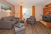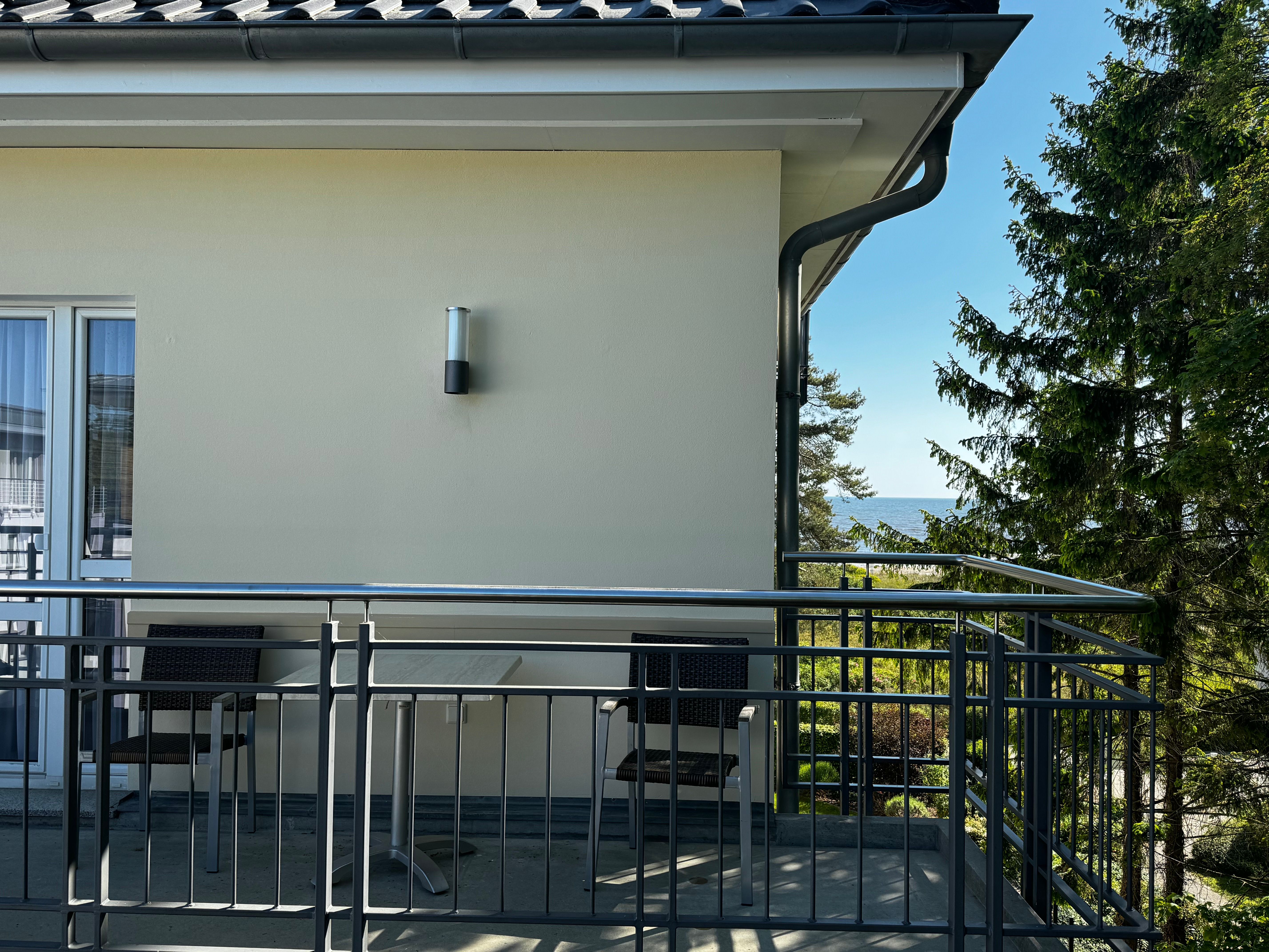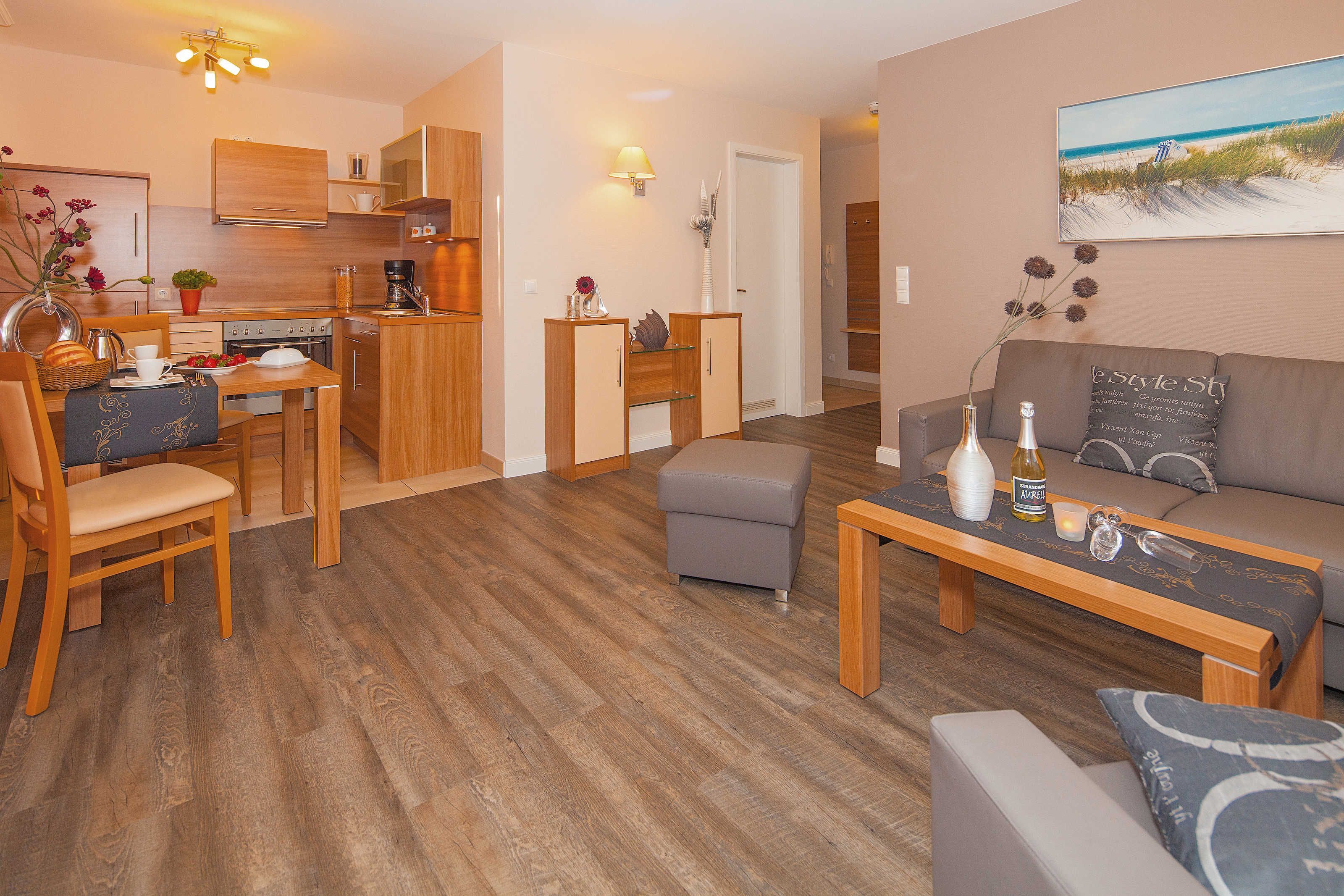 Moderne stilvolle 2 Zimmerferienwohnung ca. 2 - 4 Personen. Wohnzimmer mit TV, CD Eßplatz und integrierter Vollküche mit Geschirrspüler. Die Wohnung besitzt einen sonnigen Südbalkon mit Bestuhlung.Vom Balkon haben Sie einen Blick auf die Ostsee.