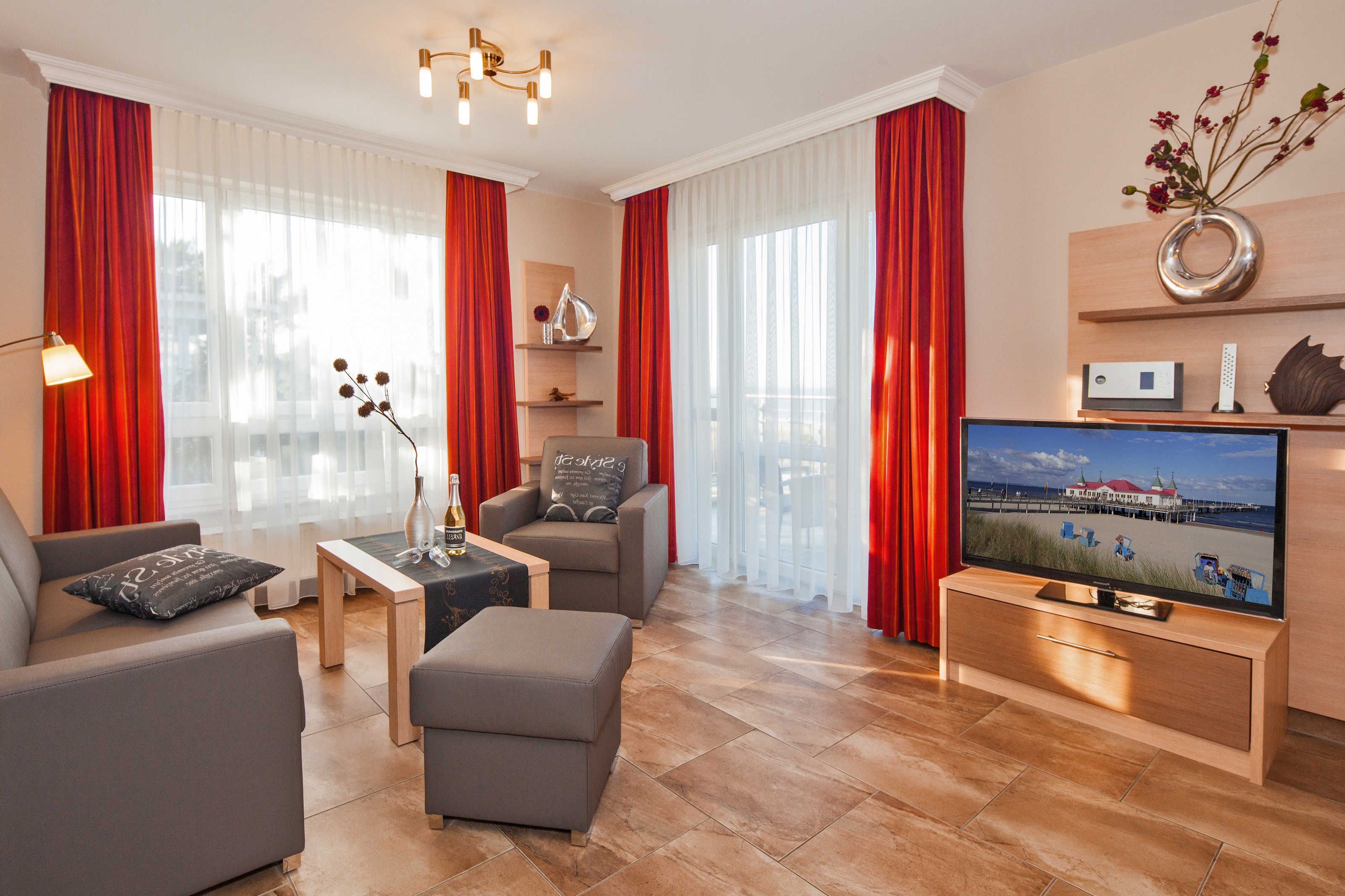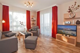 Moderne stilvolle 2 Zimmerferienwohnung ca. 2 - 4 Personen. Wohnzimmer mit TV, CD Eßplatz und integrierter Vollküche mit Geschirrspüler. Wohnung mit Duschbad und zusätzlichen separatem WC. Zusätzlich gibt es im Schlafzimmer einen weiteres TV - Gerät. Kostenfrei gibt es hier einen WLAN Highspeed Internet Anschluß. Die Wohnung besitzt eine Terrasse zur Strandpromenade mit einer Tischgruppe.