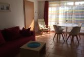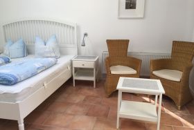 Das Appartement „Strandkorb“ befindet sich im Erdgeschoss und besteht aus einem Wohn-Essraum mit einer Küchenzeile, einem großzügigen Schlafzimmer mit vier Betten, einem Badezimmer mit Dusche sowie einer Terrasse die mit Gartenmöbeln ausgestattet ist. Es ist geschmackvoll eingerichtet. Die Küchenzeile verfügt über einen Herd, einen Backofen, einen Kühlschrank mit Gefrierfach, einen Geschirrspüler, eine Kaffeemaschine und einen Wasserkocher. Im Wohnbereich laden eine ausziehbare Couch und eine Leselampe zu gemütlichen Schmöckerstunden und Erholen ein.