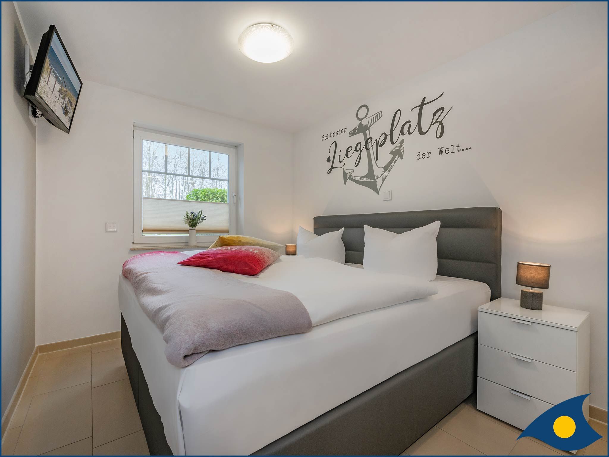Das separate Schlafzimmer bietet ein Doppelbett, einen geräumigen Schrank für Ihre persönlichen Sachen und einen zweiten Fernseher. Das Badezimmer überzeugt mit einer ebenerdigen Dusche.