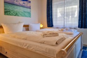 Das Haupt-Schlafzimmer verfügt über ein großes Doppelbett und Kleiderschrank mit ausreichend Stauraum. Das kleinere Schlafzimmer bietet ein Bett (1,40 - 2 m). Die Betten sind bei Anreise bereits bezogen.
