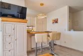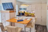 Das Wohnzimmer ist mit einer gemütlichen Couch, kleinem Tisch und SMART-TV eingerichtet. Die angrenzende Kühe ist durch den Essbereich zum Wohnzimmer optisch getrennt.