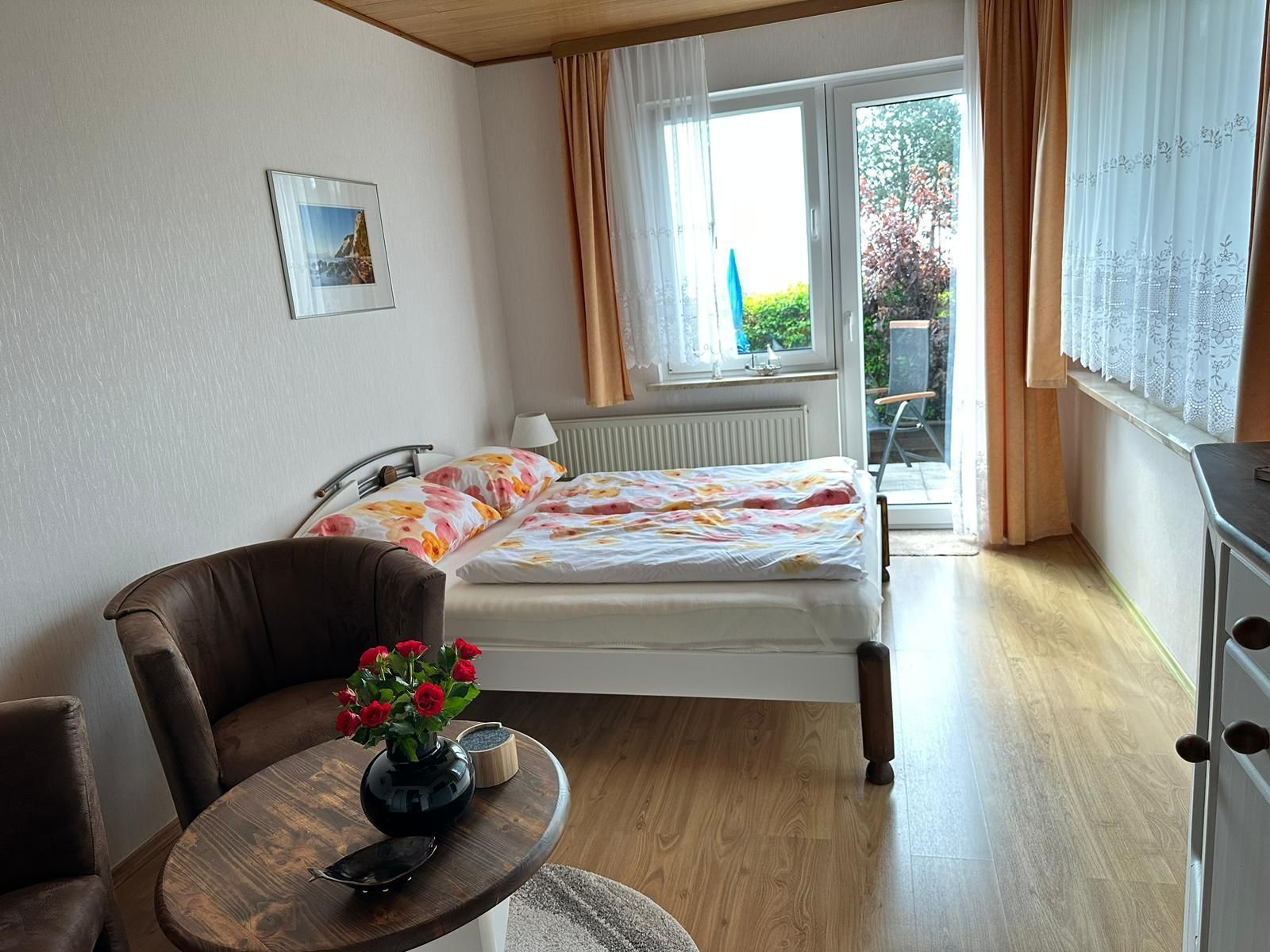 • gemütlicher Wohn- und Schlafbereich mit Flat-TV, Sitzbereich und Doppelbett