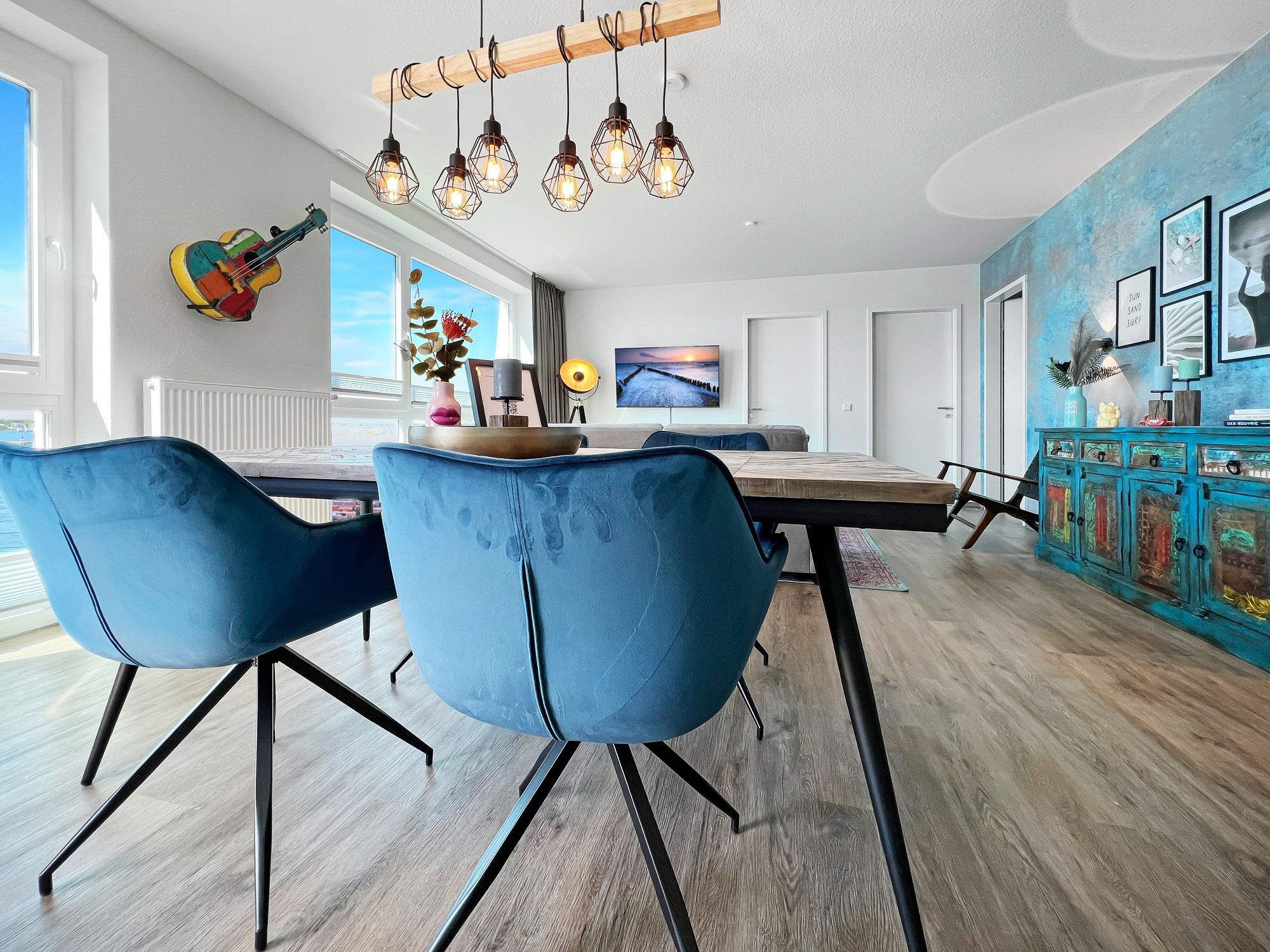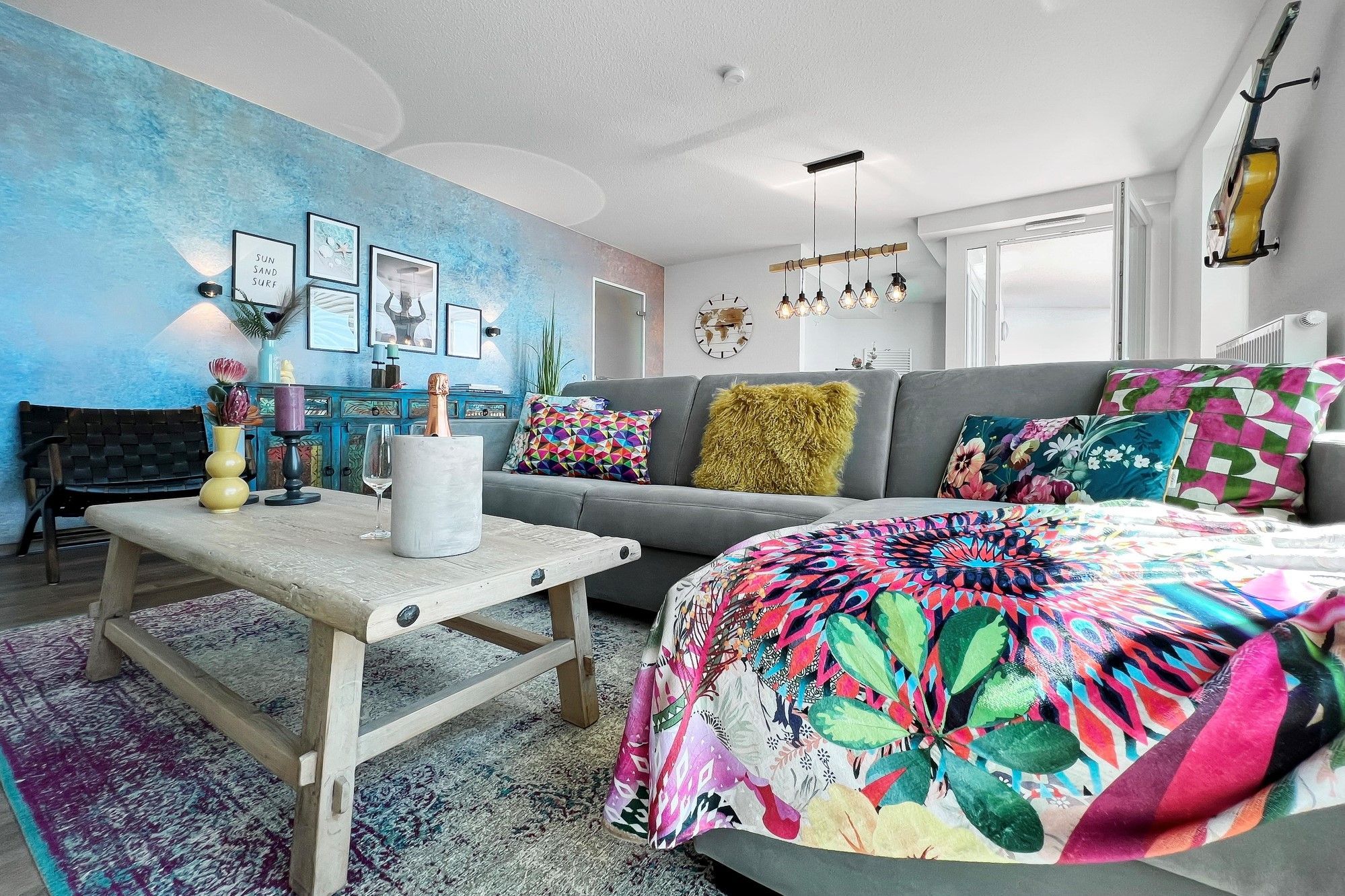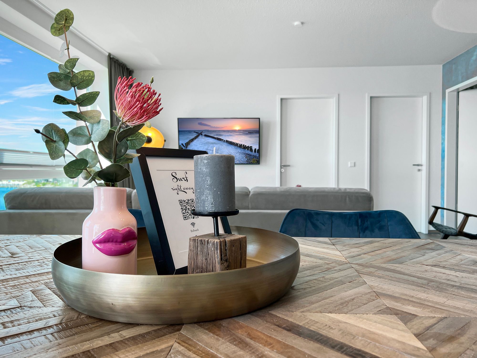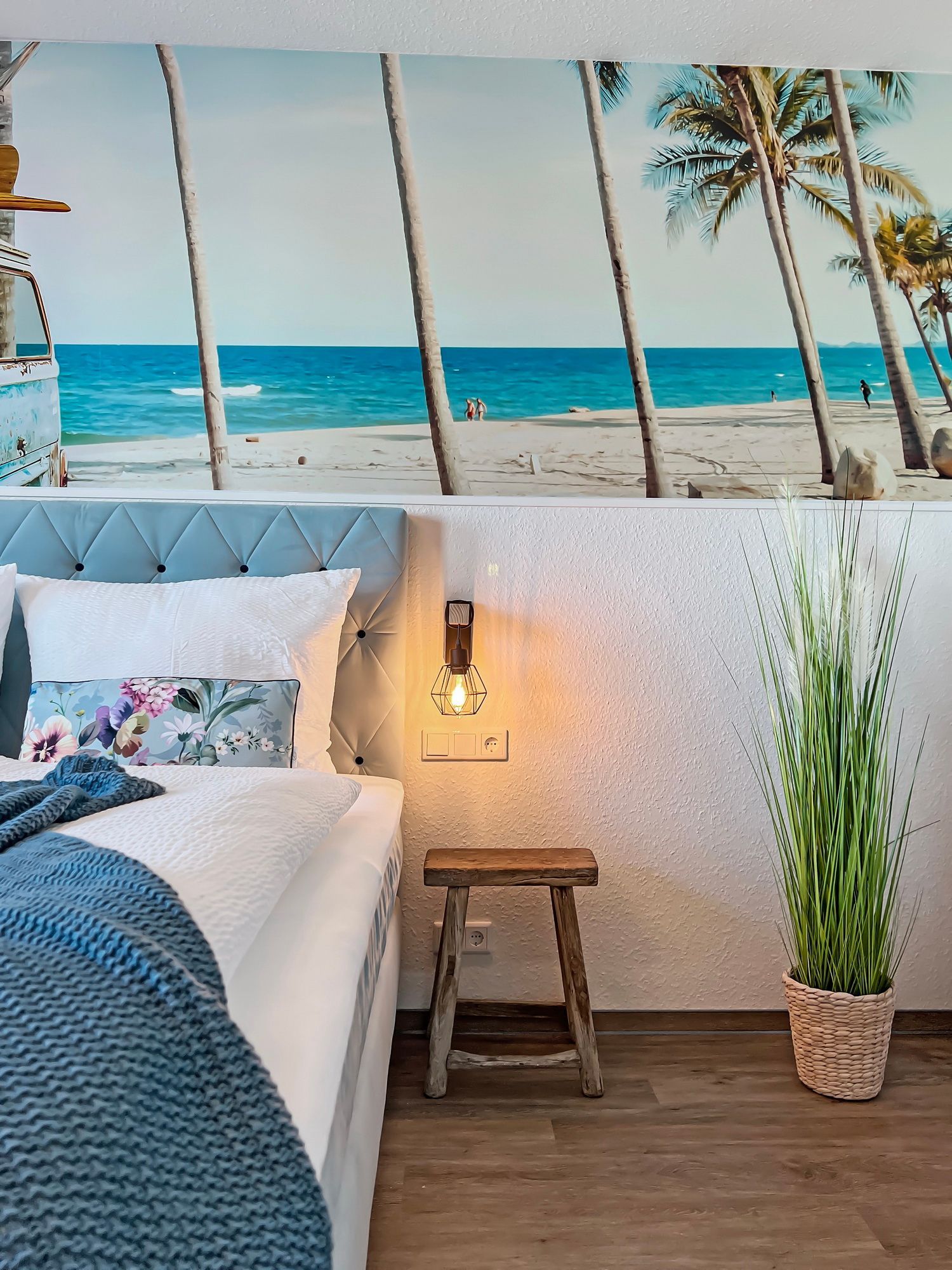 Die farbenfrohe Gestaltung der 3-Zimmer-Ferienwohnung (90 m²) besticht durch eine hochwertige Ausstattung, außergewöhnliches Mobiliar und kreative Dekoideen, inspiriert durch den Surfstil (Hawaii).