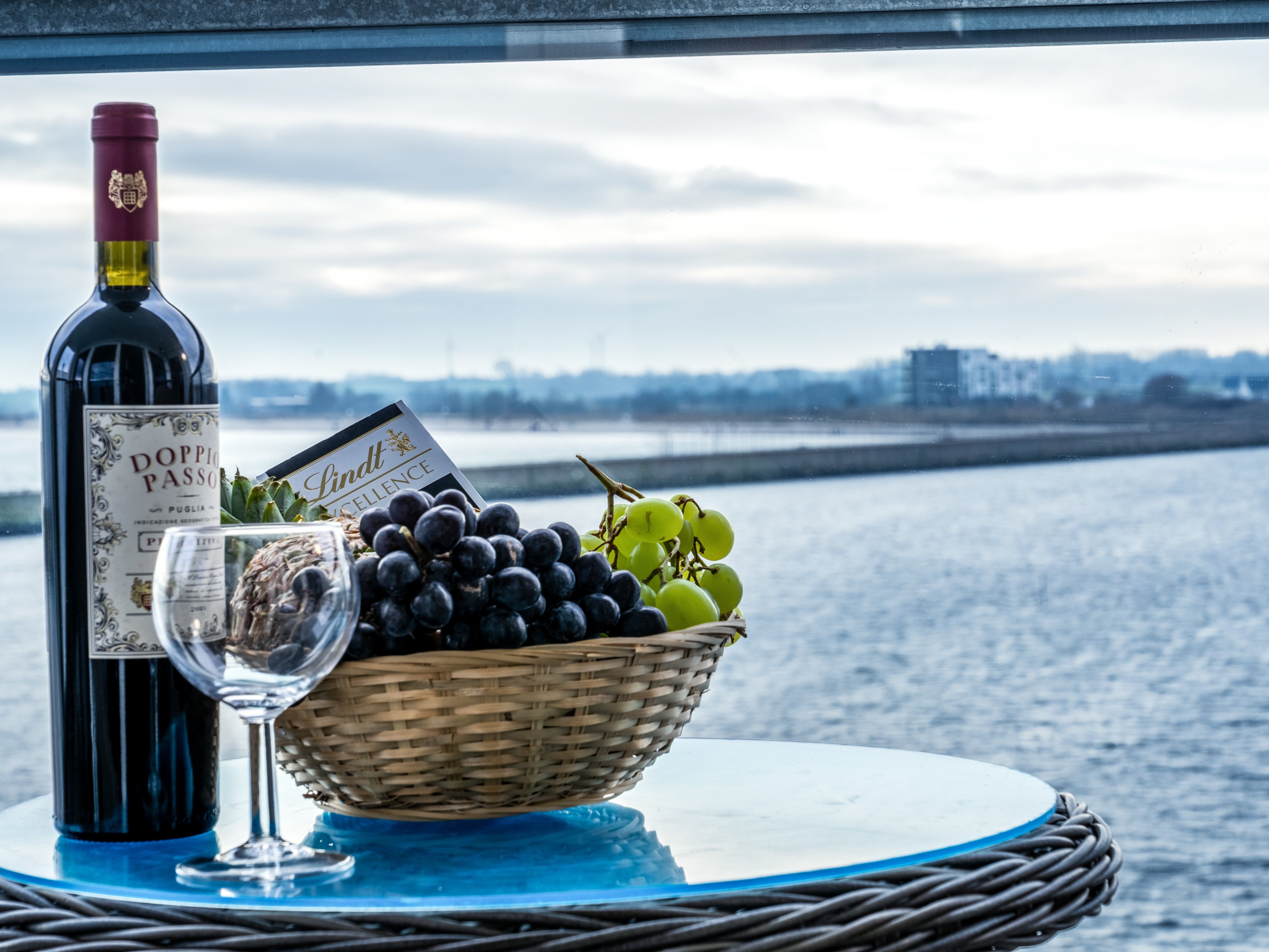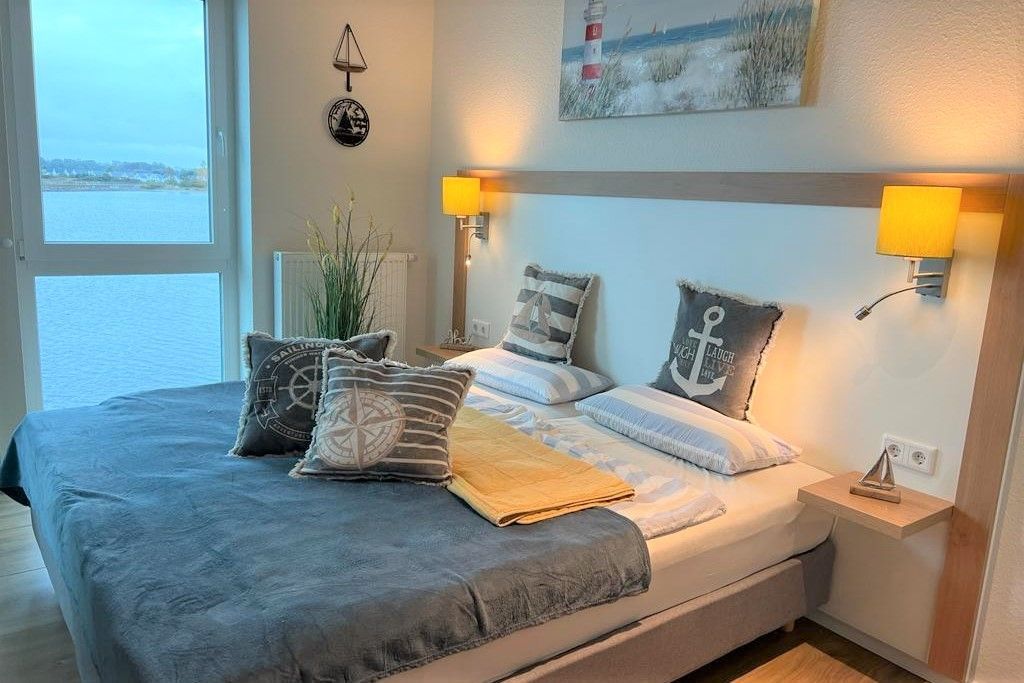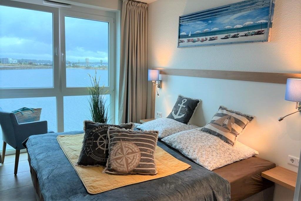 Ein Schlafzimmer bietet einen Businessarbeitsplatz mit Glasfaser und WLAN für Homeoffice. Ein atemberaubender Moment erreicht Sie bereits mit dem Sonnenaufgang, wenn Sie von der sonnigen Loggia die Schweinswale, Fischreiher, Möwen, Enten usw. begrüßen dürfen.