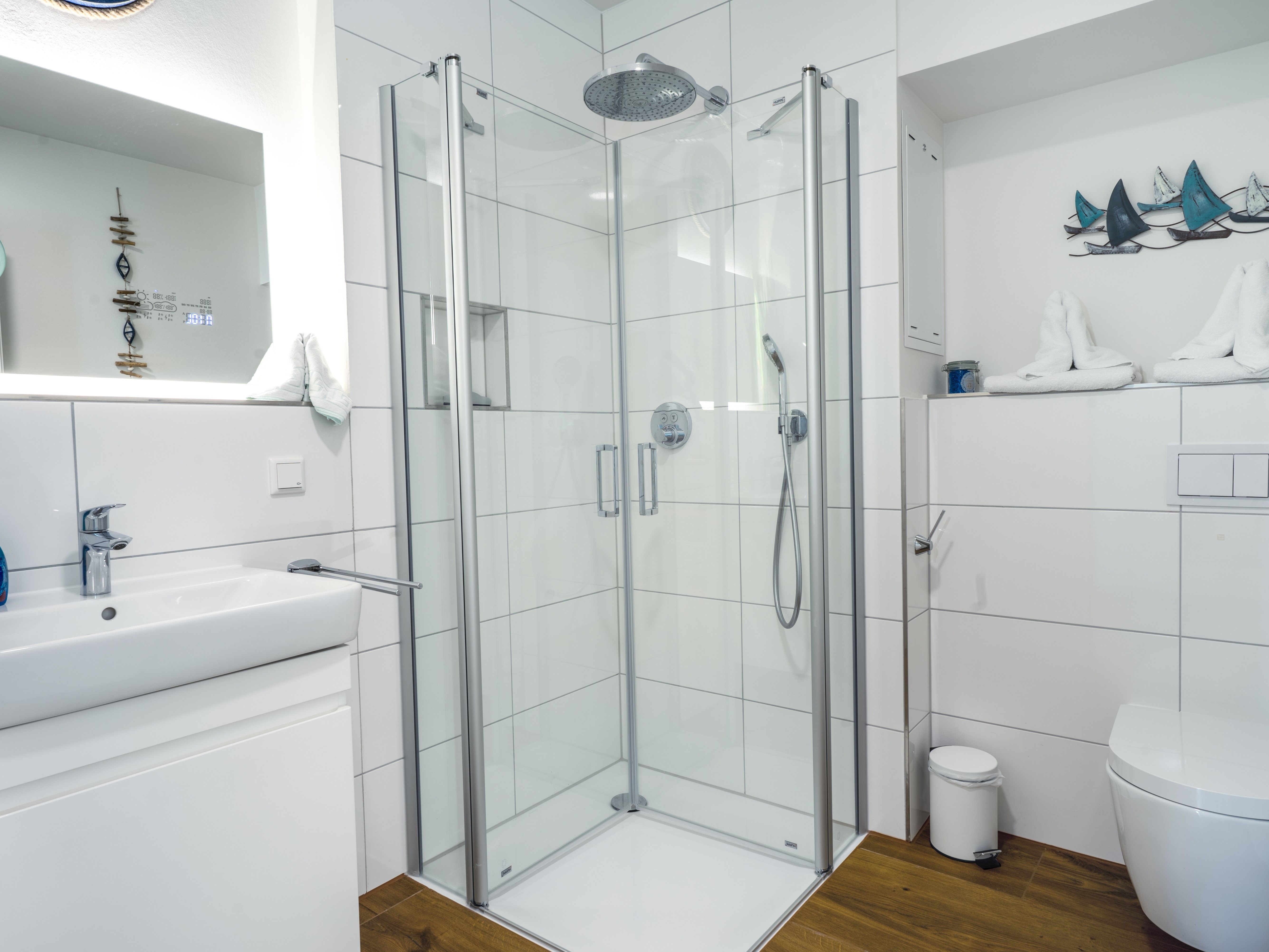 Sie wohnen in einem modern geschnittenen 3-Zimmer-Apartment für bis zu 6 Personen. Zwei Schlafzimmer mit Doppelbetten und 55 Zoll TV, ein Wohn-/Schlafraum mit 65 Zoll TV (Netflix inkl.), ausziehbarer Doppelbettcouch, Essplatz, voll ausgestatteter Küchenbereich (Kochen mit Meerblick), zwei Bäder mit bodentiefer Regendusche und WC, Abstellraum und Loggia.