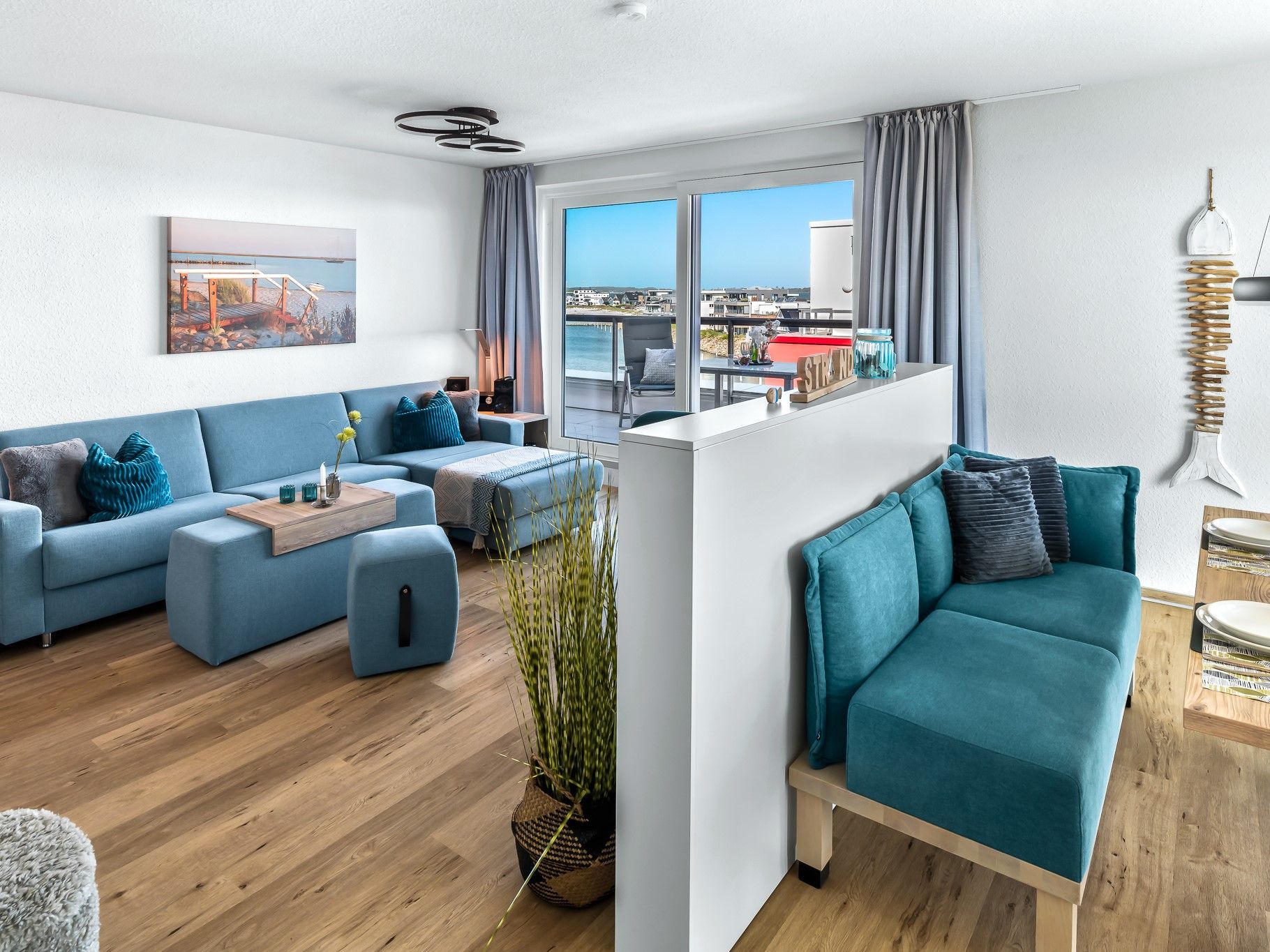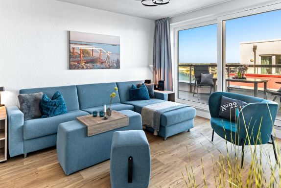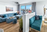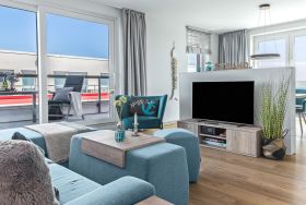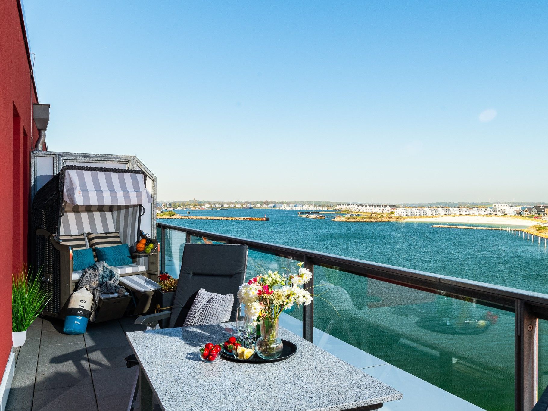 Sie wohnen in einem großzügigen modernen 2-Zimmer-Penthouse-Appartement für bis zu 4 Personen mit Sicht auf den Yachthafen und die Ostsee mit großer Dachterrasse mit Strandkorb, gesamt 80 m² groß