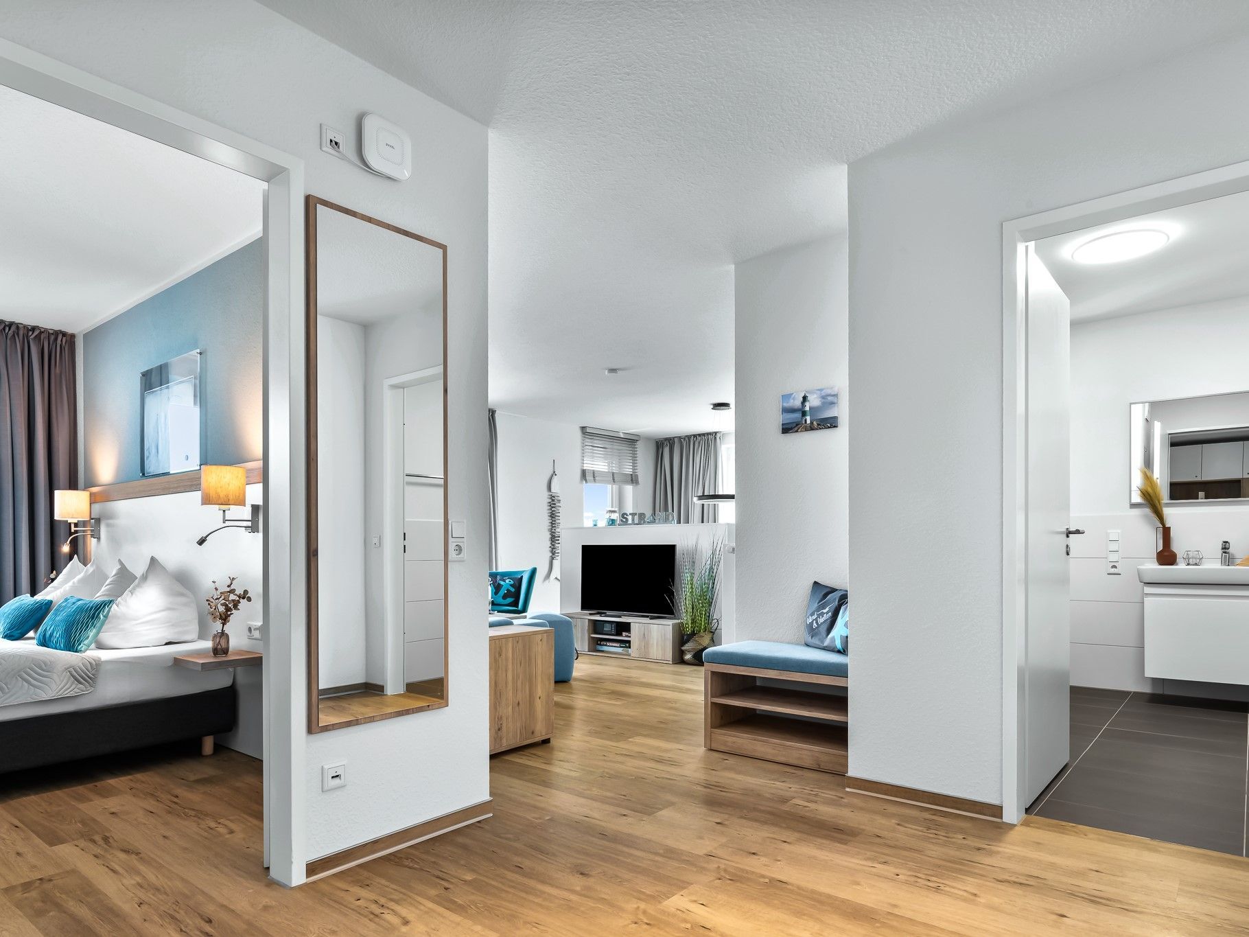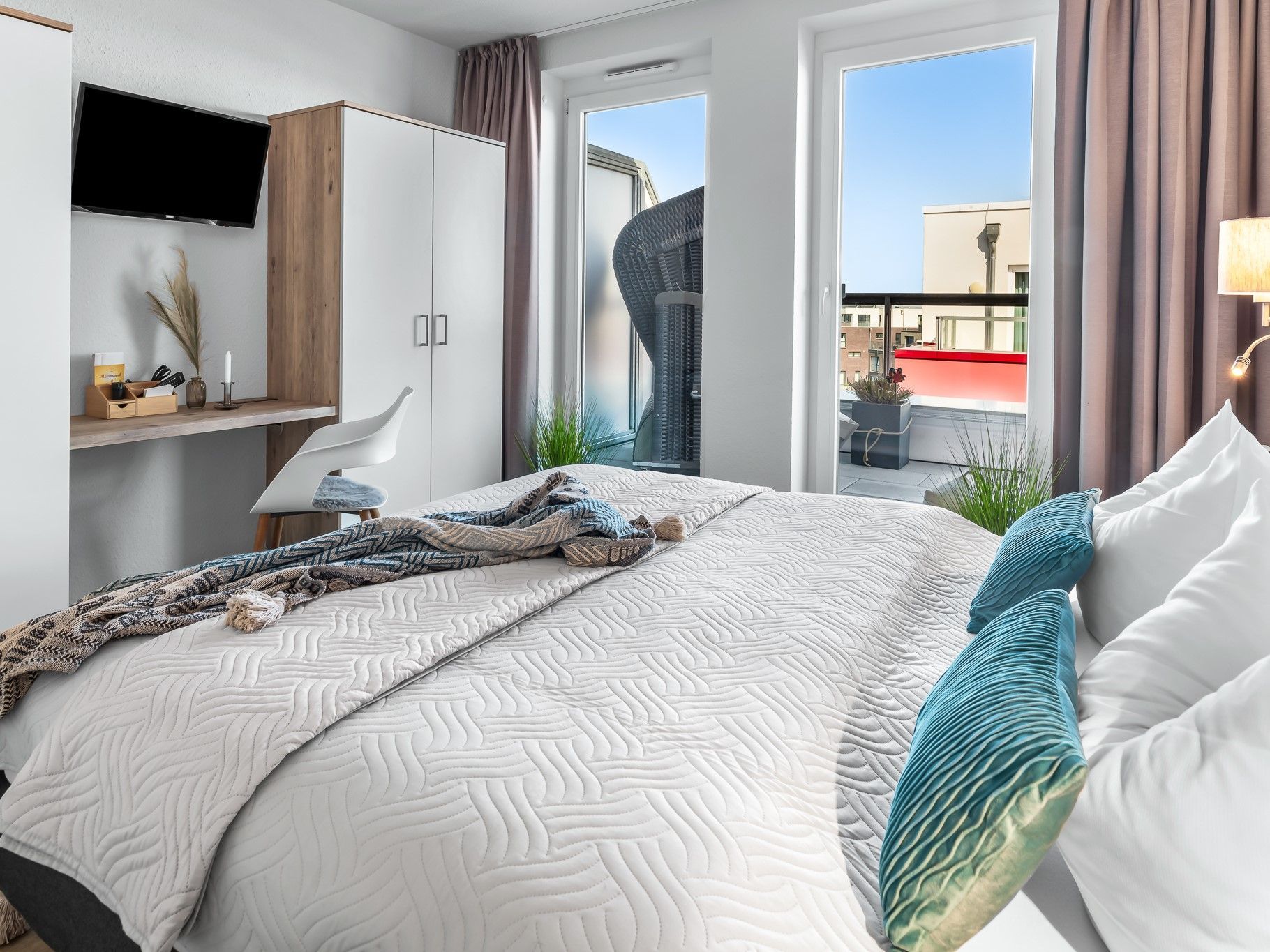 Die Residenz Bollwark beherbergt 26 hervorragend ausgestattete Wohneinheiten. In den Zwei- und Dreizimmerappartements fühlen sich erholungsuchende Paare ebenso wohl wie Familien mit Kindern, die erlebnisreiche Tage am Meer verbringen möchten. Alle Wohnungen verfügen über einen privaten Balkon, eine Terrasse oder Loggia: Dort lassen die Feriengäste den Tag nah dran am Geschehen auf dem Wasser entspannt mit einer Tasse Kaffee beginnen oder abends bei einem Glas Rotwein Revue passieren. Für das Interieur der hellen und großzügig geschnittenen Wohneinheiten waren erfahrene Inneneinrichtungsspezialisten verantwortlich.