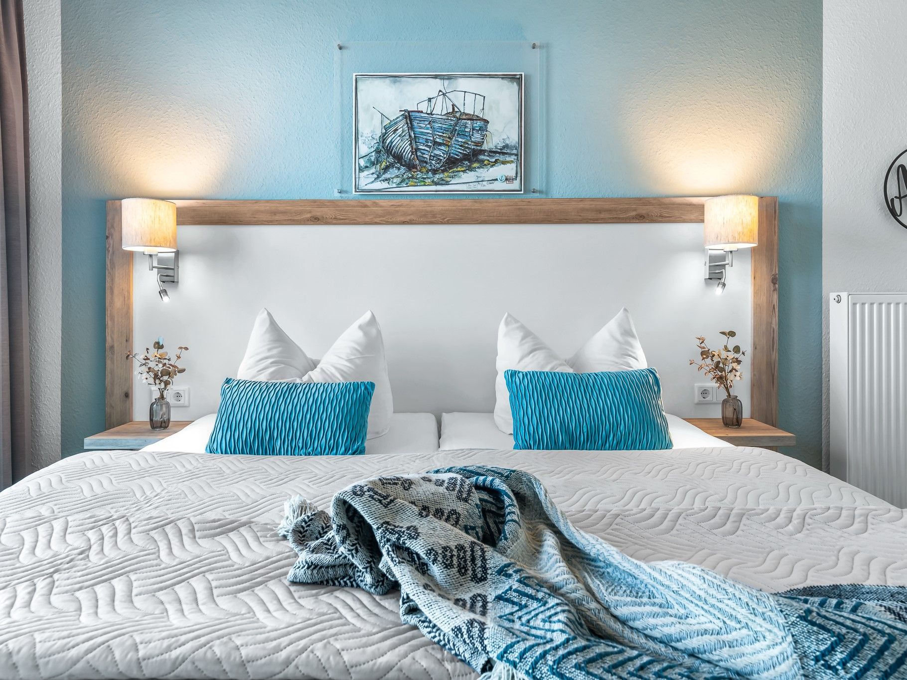 Doppelbett 2 x 90 cm x 200 cm mit Wasserblick aus dem Bett