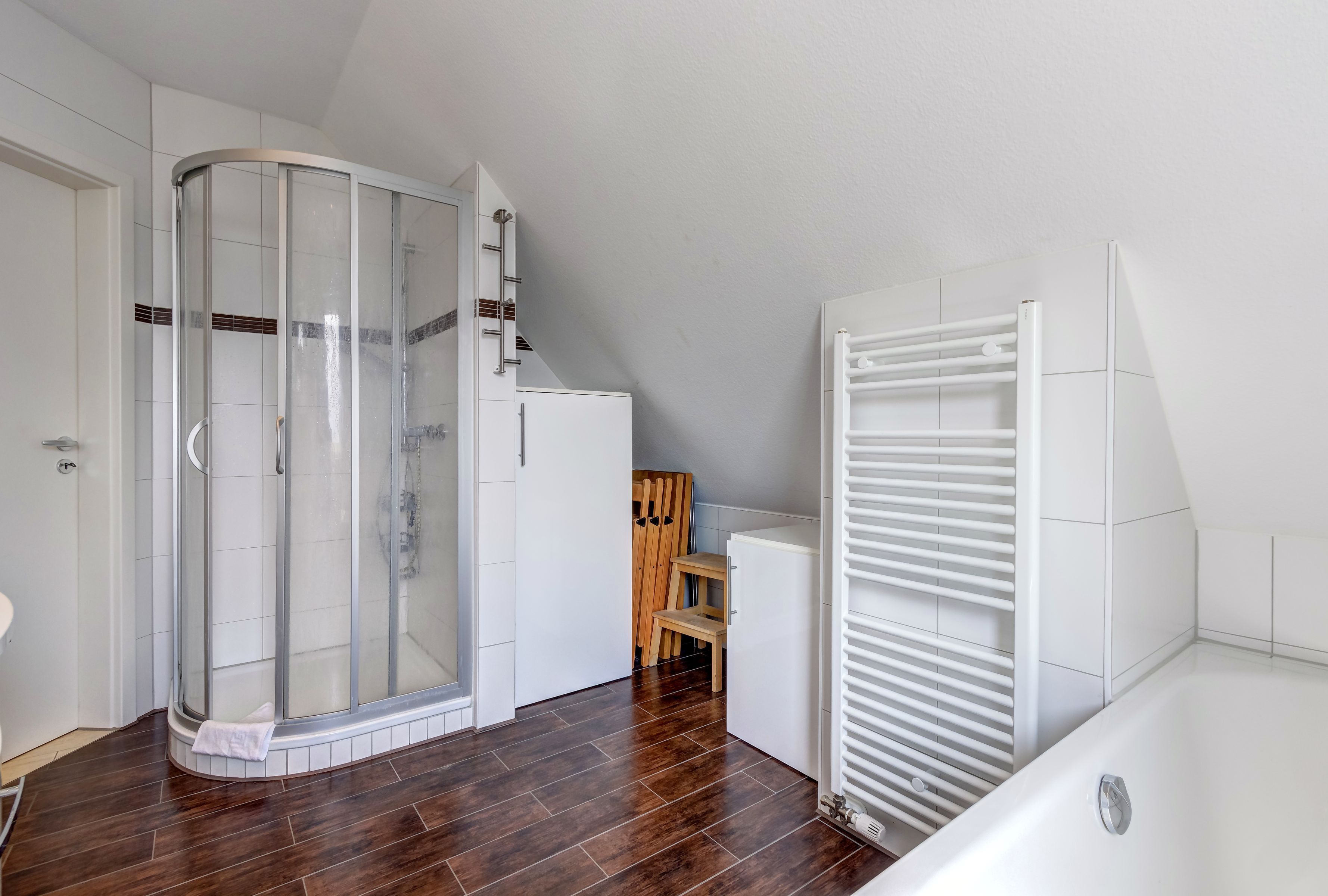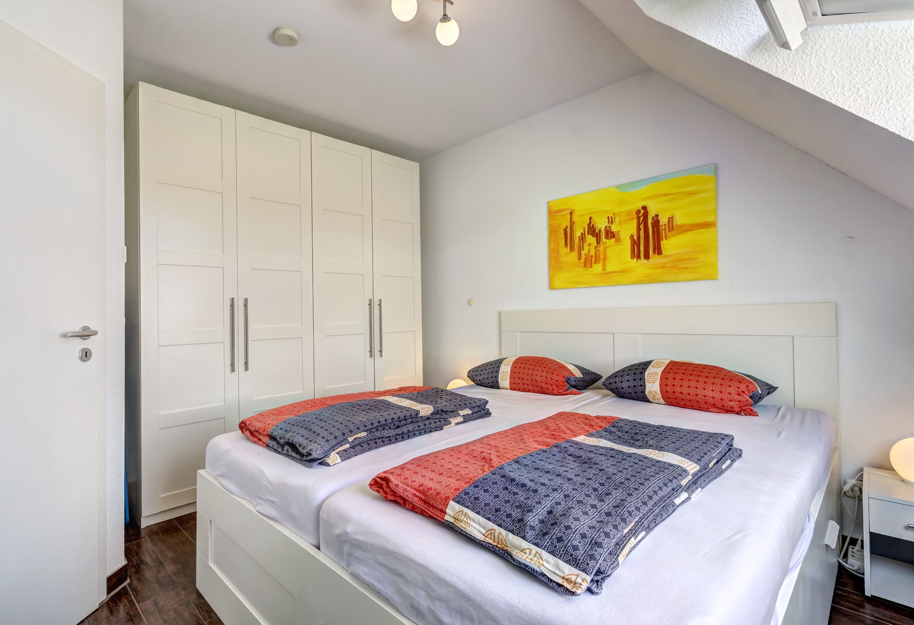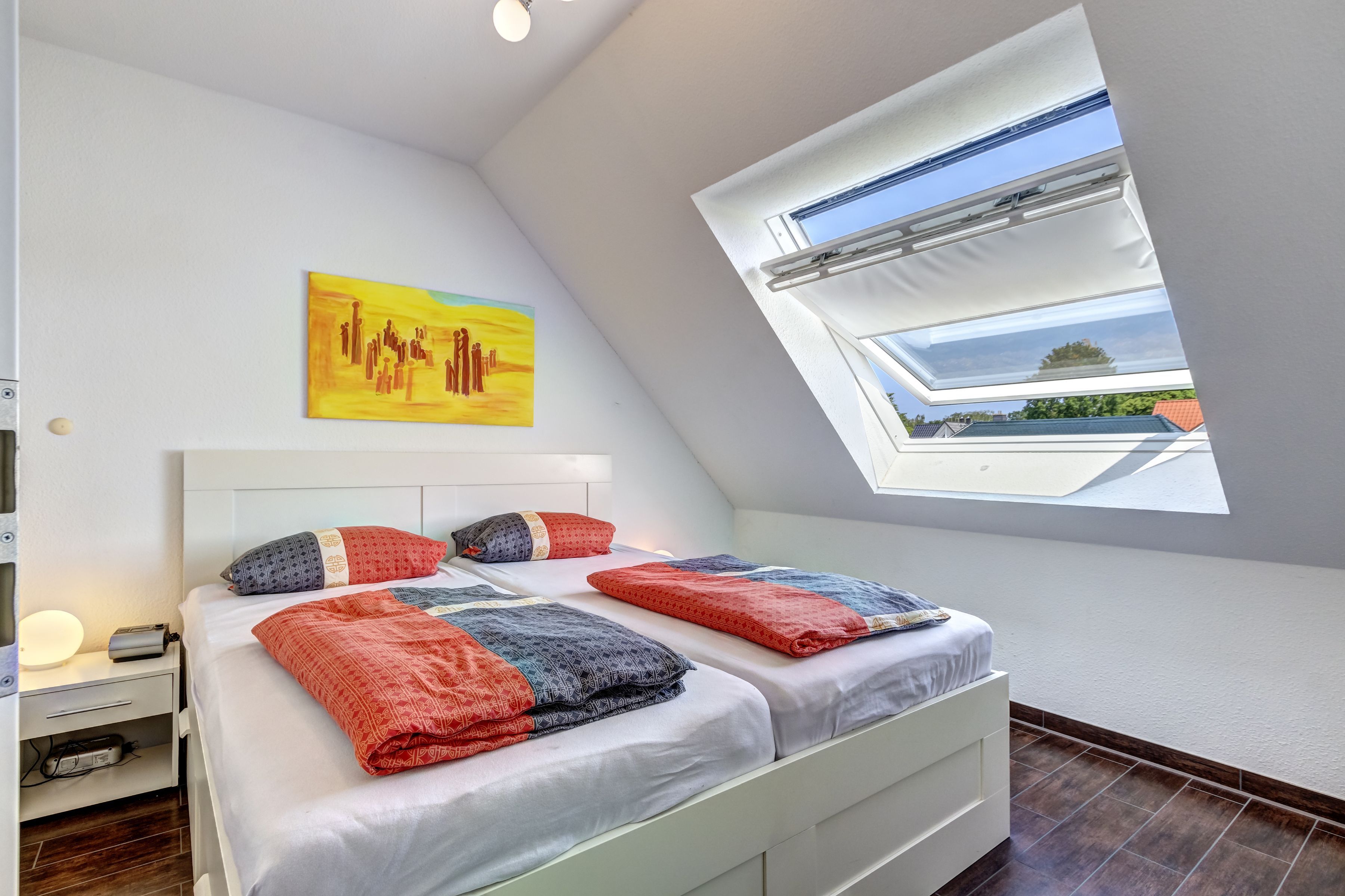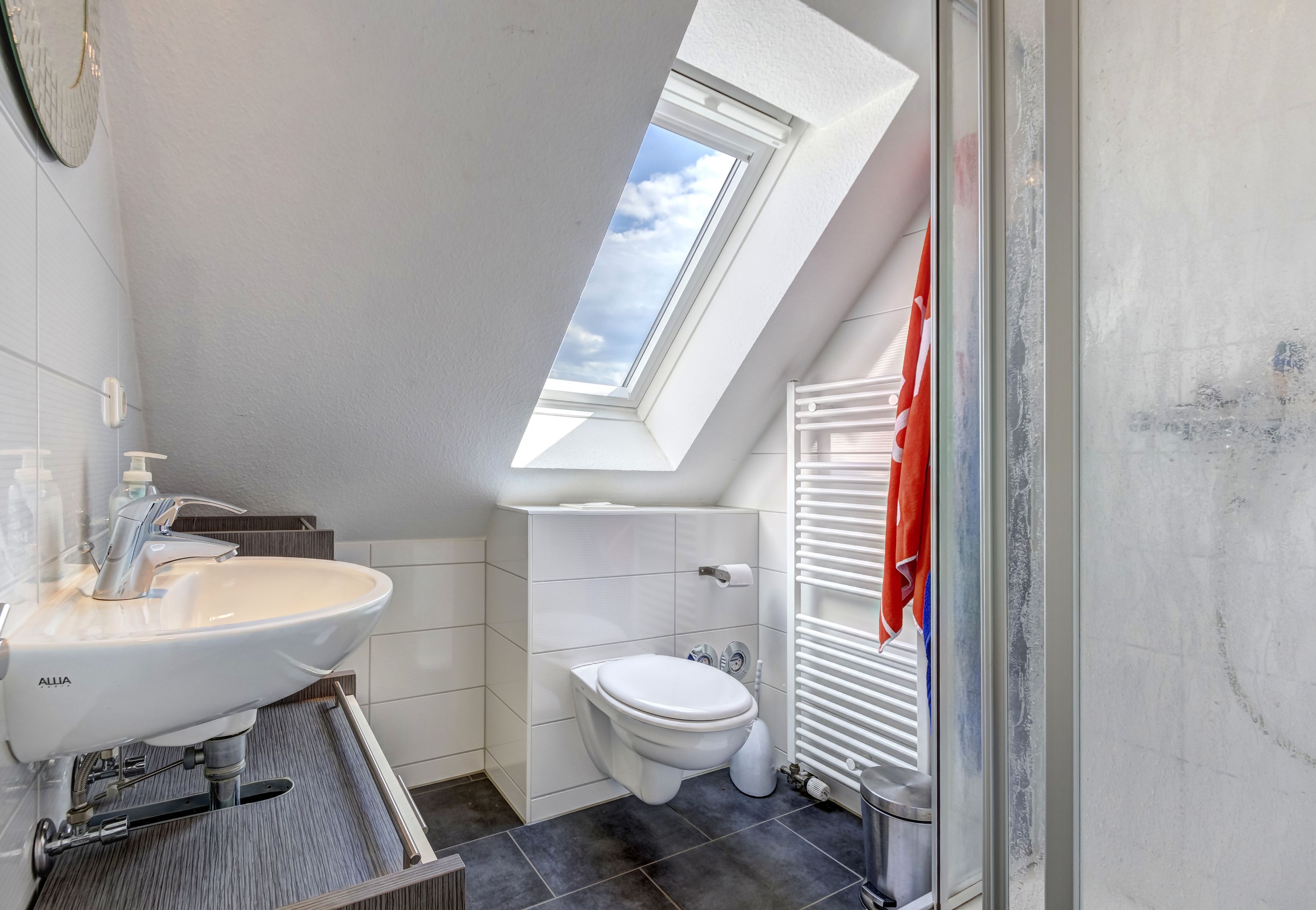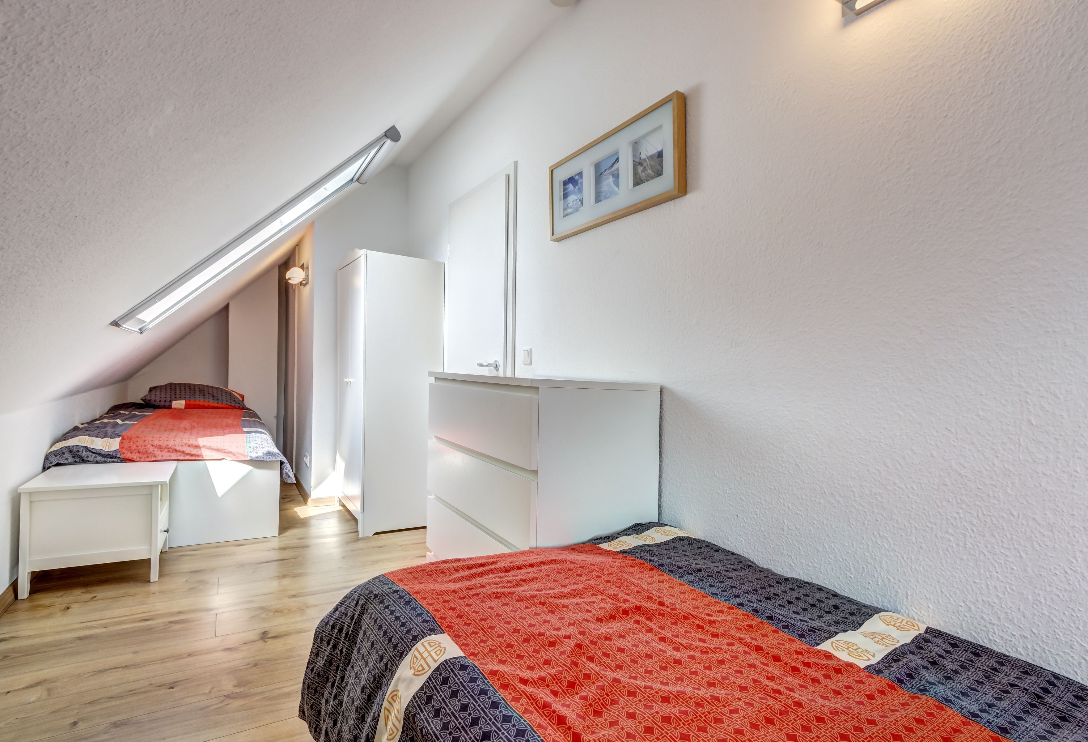 Dachgeschoss: 2 weitere Schlafzimmer (1x Doppelbett, 1x zwei Einzelbetten), Bad mit Dusche/WC