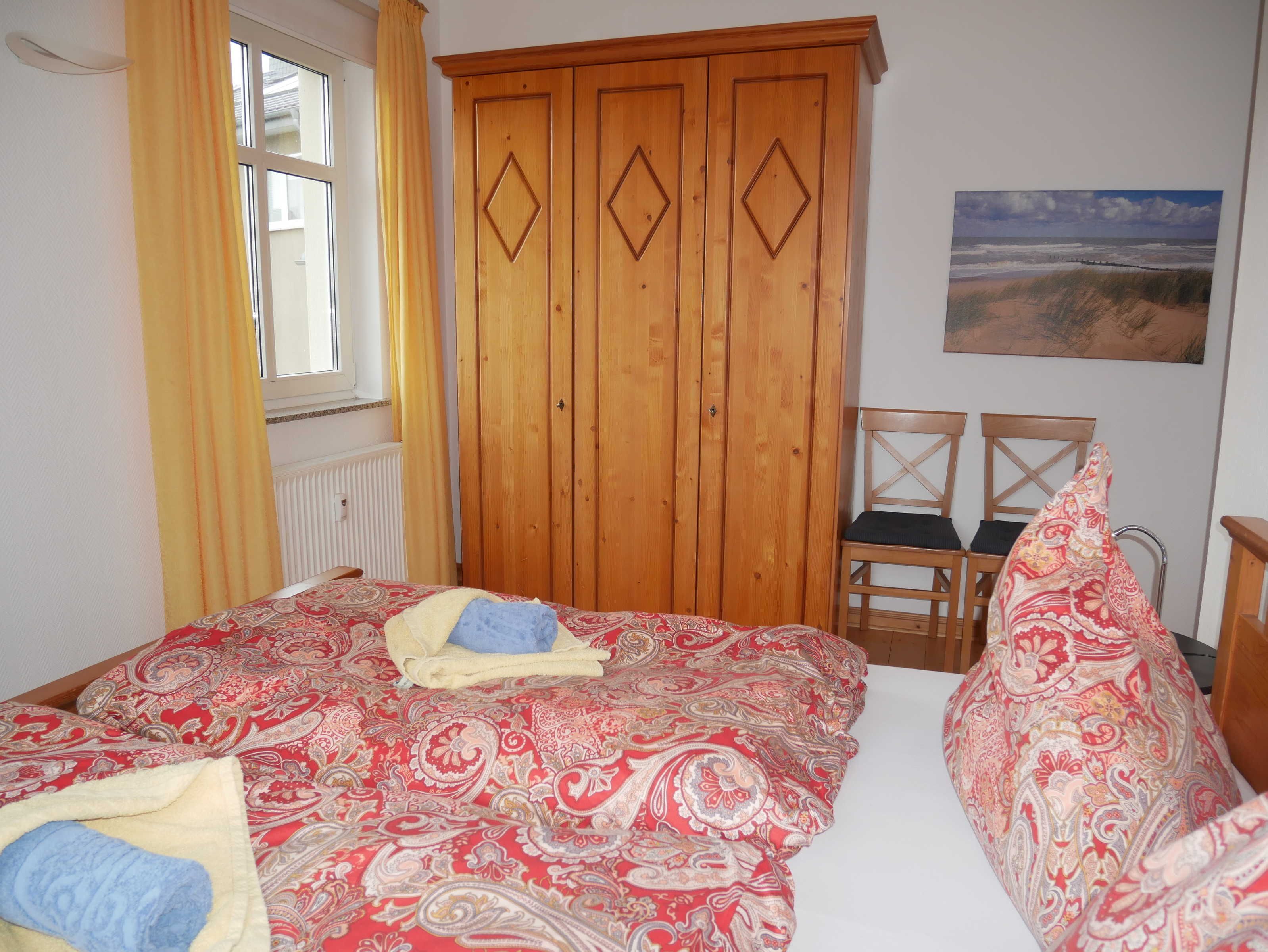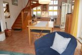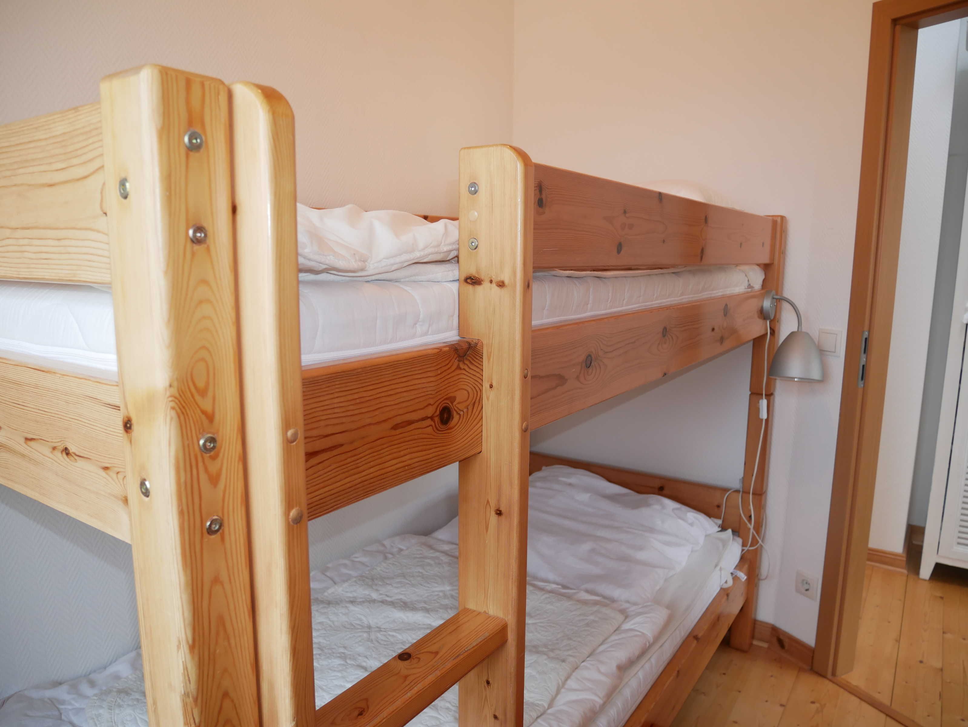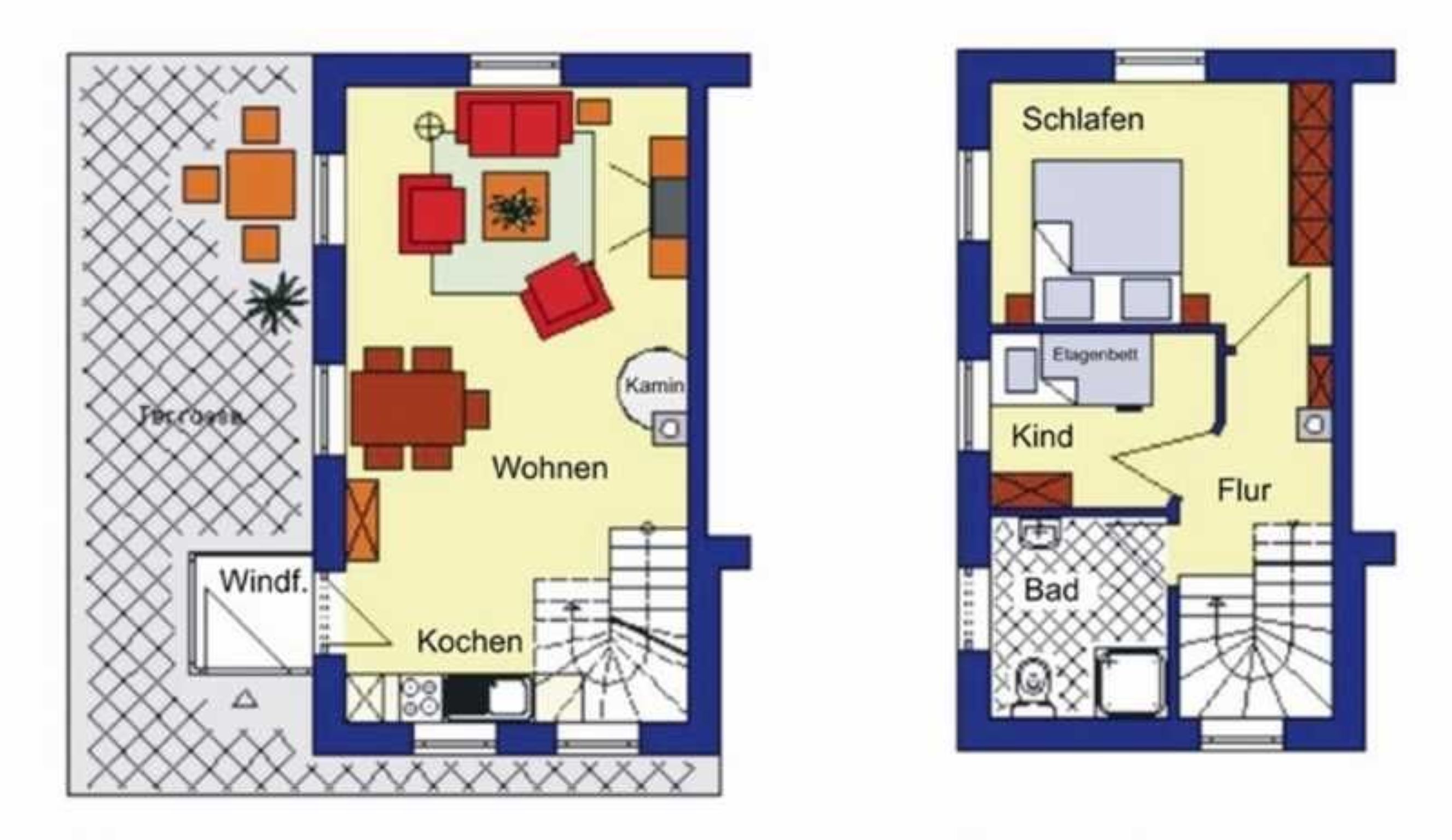 Zur Wohnung gehört eine überdachte Terrasse mit Sitzmöbeln und Blick in den Innenhof. Im 1. Obergeschoß befinden sich zwei Schlafräume mit 1 x Doppelbett, 1 x gr. Etagenbett (2 m lang x je 1 m breit) sowie ein Bad mit DU/WC. Die Erstausstattung Bettwäsche und Handtücher sind nicht im Gesamtpreis enthalten. Bei Bedarf können diese gegen Gebühr zugebucht werden.