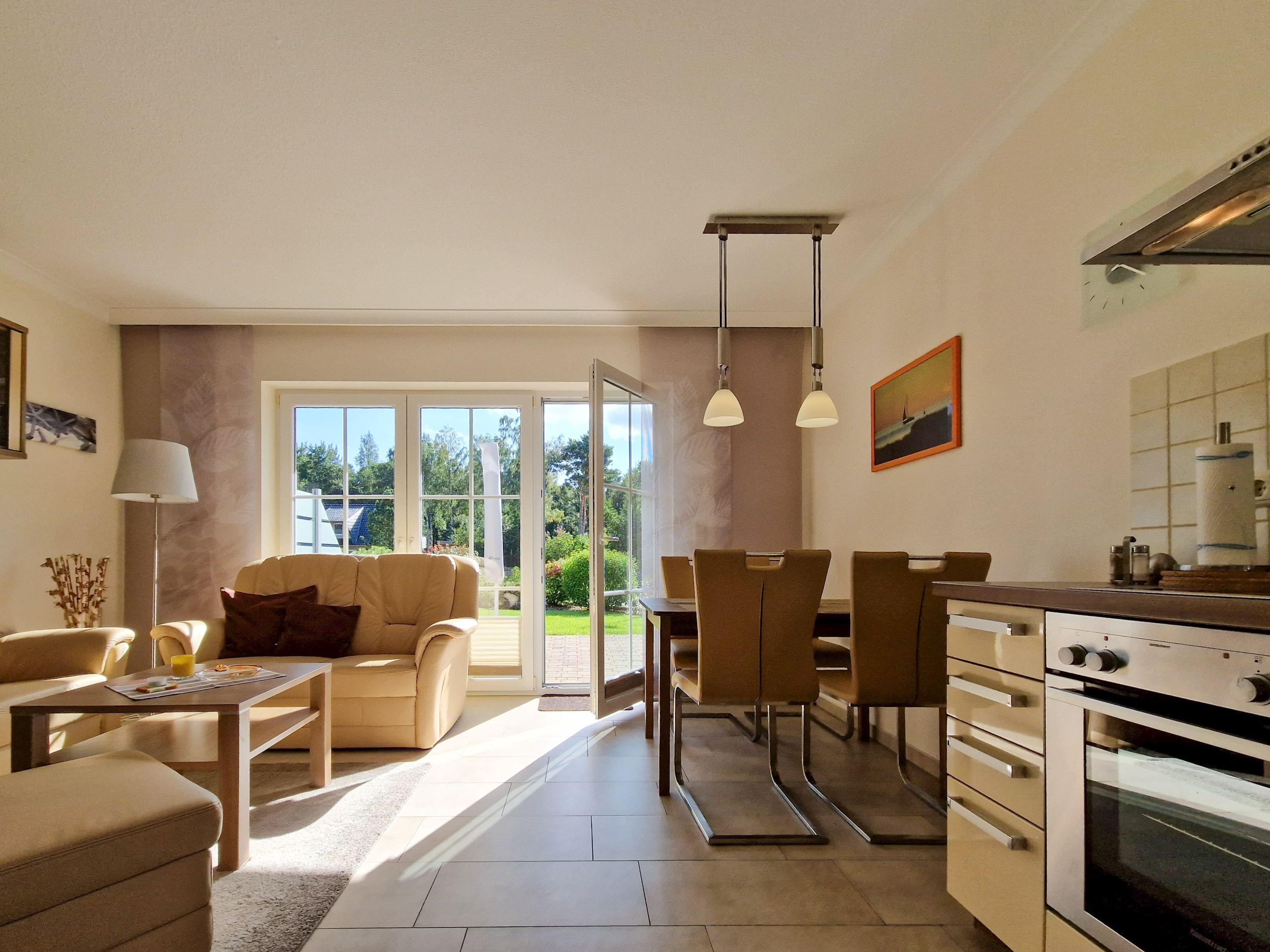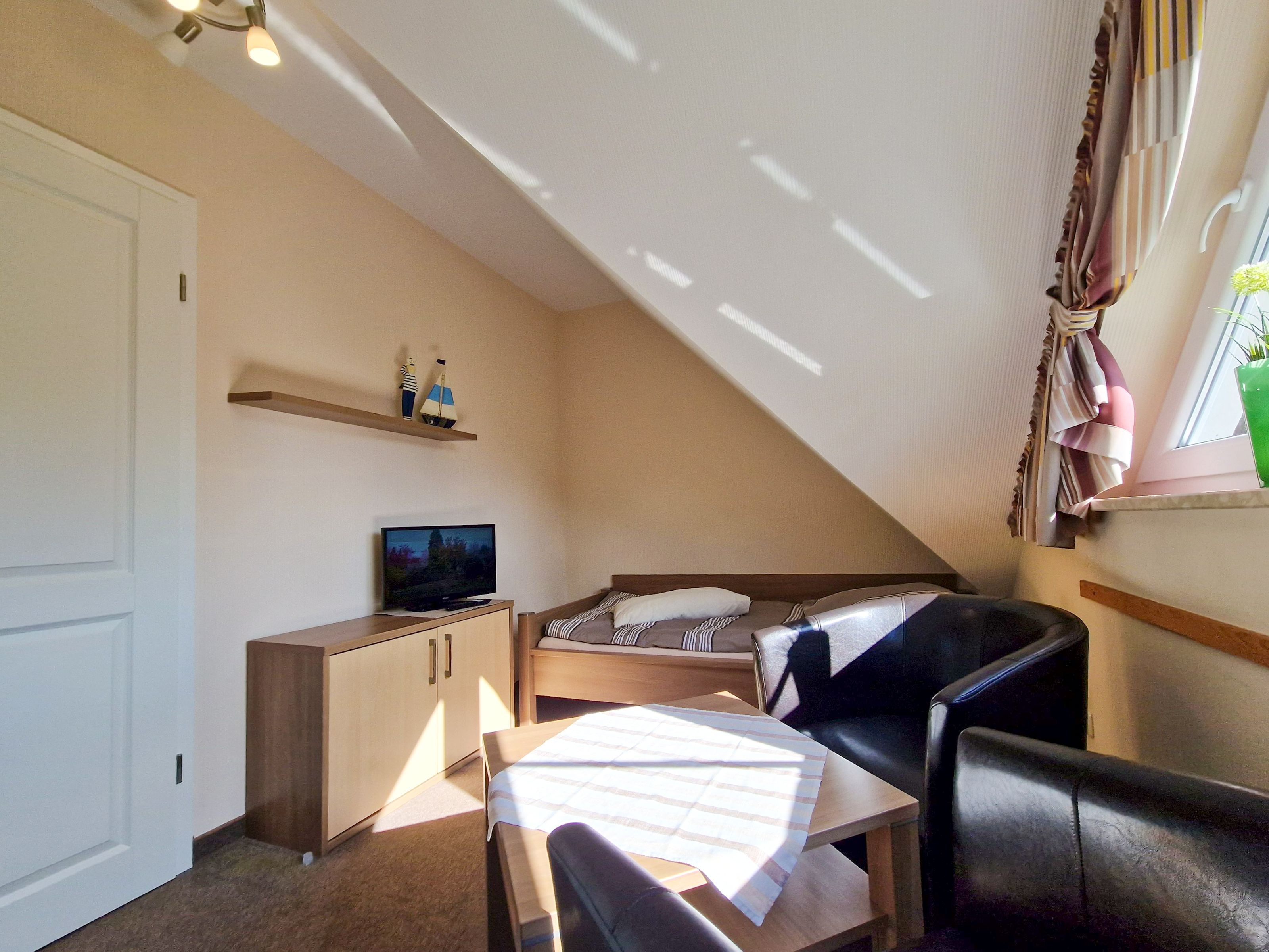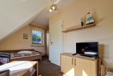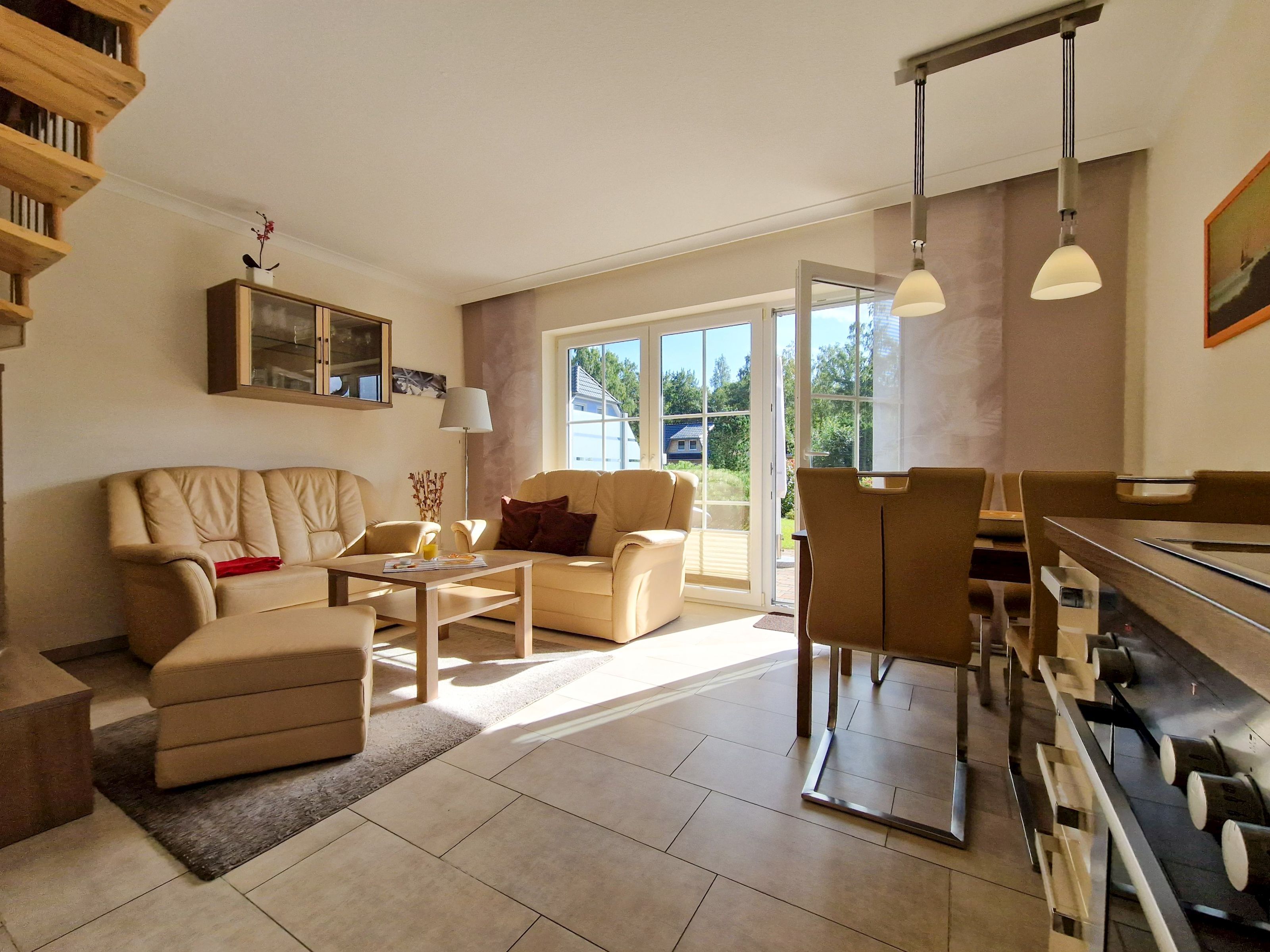 Die liebevoll eingerichteten Ferienwohnungen erstrecken sich über zwei Etagen. Im Erdgeschoss erwartet Sie ein einladender Wohnraum mit einer komplett ausgestatteten Küche sowie einem praktischen Hauswirtschaftsraum, in dem Ihnen auch eine Waschmaschine für kleinere Wäschearbeiten zur Verfügung steht. Zudem finden Sie im Erdgeschoss das Badezimmer mit WC und Dusche.