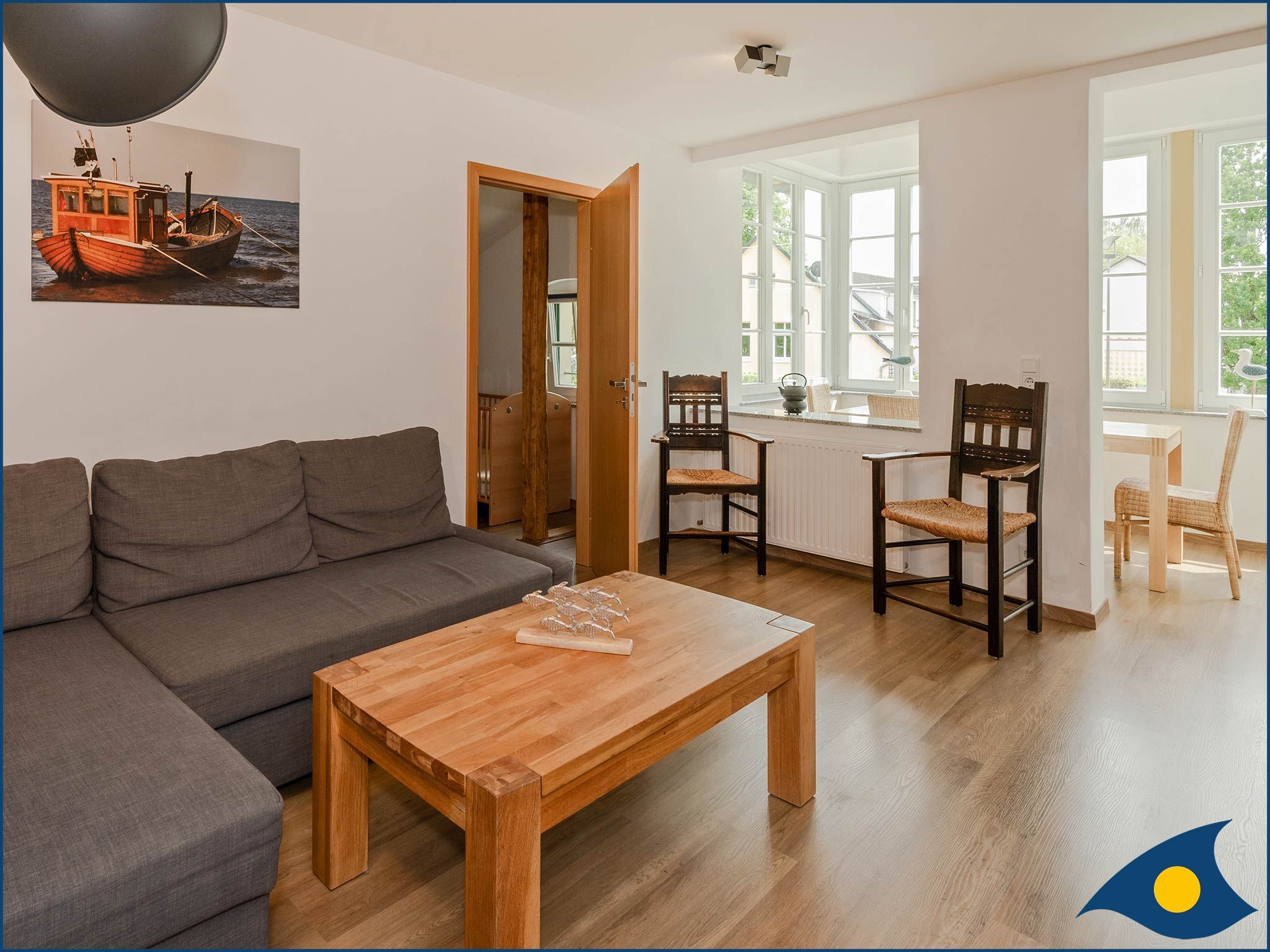 Die Wohnung 9 ist modern saniert. Sie befindet sich im Dachgeschoss der „Villa Ernst“ und ist eine ca. 80m² große Drei-Raum-Ferienwohnung. Der Charme der offenen Holzkonstruktionen im großzügigen hellen und modernen Wohnbereich als auch die gehobene Ausstattung, lässt nahezu keine Wünsche offen.