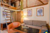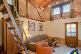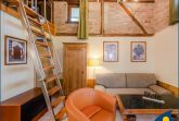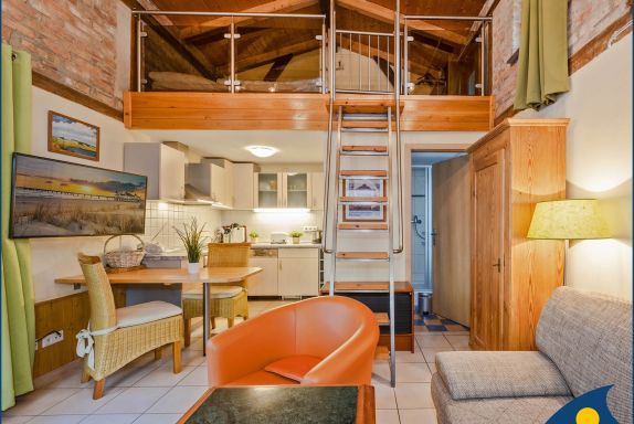 Die Wohnung 8 befindet in der ehemaligen ca. 28m² großen Remise der restaurierten Villa „Ernst“. Die Wohnung 8 besteht, bis auf ein separates Bad, aus einem einzigen Raum. Sie nimmt die gesamte Höhe, Breite und Länge der Remise ein. Die Deckenbalken liegen frei und die schönen Ziegelwände sind aufwändig rekonstruiert worden. Die Wohnung 8 verfügt über eine eingezogene Galerie mit einem Stahl-Glasgeländer auf der ein Doppelbett steht (1,40 m breit). Sie ist über eine solide holzbelegte Edelstahlleiter mit Handlauf erreichbar. Die Remise besitzt einen gemütlichen Charme und ist bei Paaren und Kindern wegen der Schlafgalerie sehr beliebt. Zu ebener Erde im Wohn-Schlafbereich befindet sich eine bequeme Schlafcouch. Die Wohnung 8 ist für 2 Personen ausgelegt. Die Wohnung 8 ist für körperbehinderte Personen nicht geeignet.
