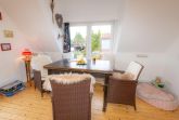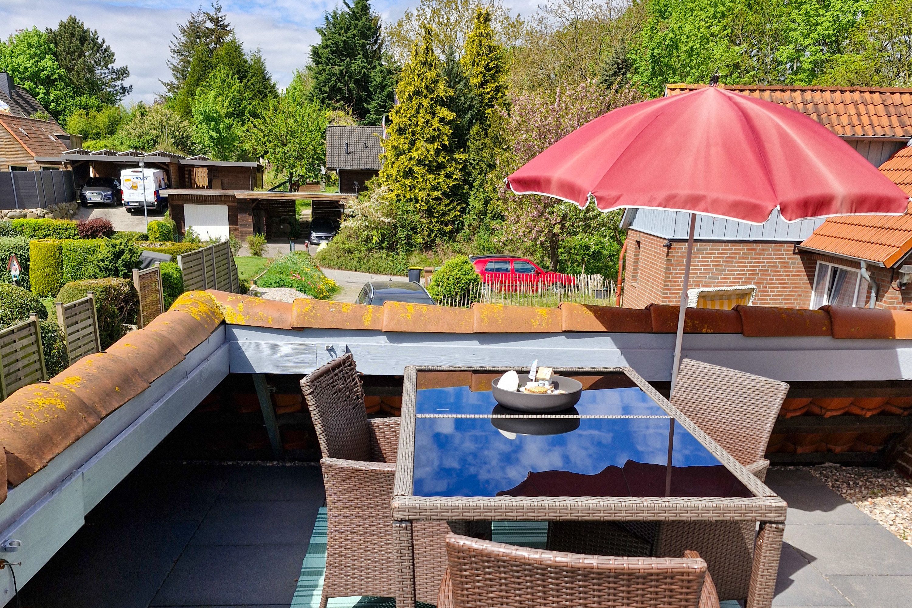 Die große 20 qm Dachterrasse mit Glastisch und Sitzgelegenheiten ist direkt vom Wohn-/ Esszimmer aus zu erreichen.